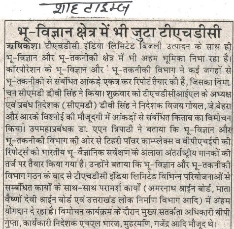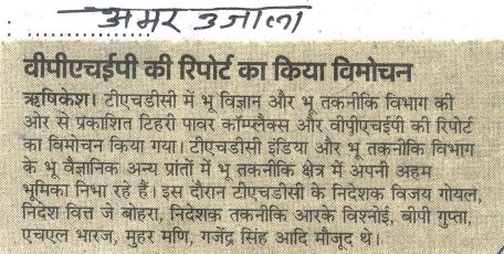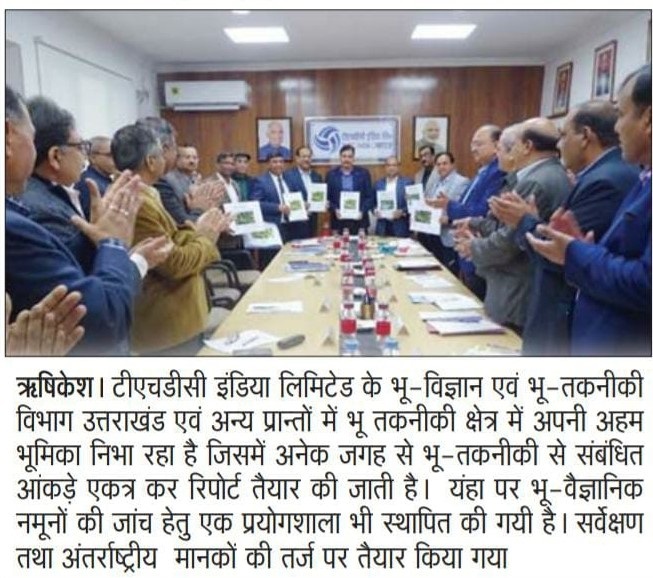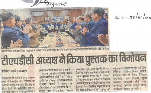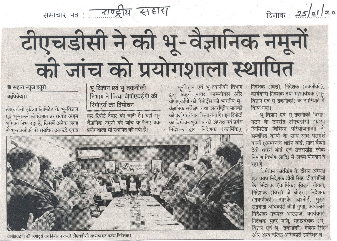 भू-विज्ञान एवं भू-तकनीकी विभाग द्वारा टिहरी पॉवर काम्प्लेक्स तथा वी.पी.एच.ई.पी. की रिपोर्ट्स को भारतीय भू-वैज्ञानिक सर्वेक्षण तथा अंतर्राष्ट्रीय मानकों की तर्ज पर तैयार किया गया है | इन रिपोर्टों का विमोचन दिनांक 24.01.2020 को अध्यक्ष एवं प्रबंध निदेशक श्री डी.वी. सिंह द्वारा निदेशक (कार्मिक), निदेशक (वित्त), निदेशक (तकनीकी), कार्यकारी निदेशक तथा महाप्रबंधक (भू-विज्ञान एवं भू-तकनीकी) के उपस्थिति में किया गया | भू-विज्ञान एवं भू-तकनीकी विभाग, गठन के उपरांत टीएचडीसी इंडिया लिमिटेड विभिन्न परियोजनाओं से सम्बंधित कार्यों के साथ-साथ परामर्श कार्यों (अमरनाथ श्राईन बोर्ड, माता वैष्णों देवी श्राईन बोर्ड एवं उत्तराखंड लोक निर्माण विभाग आदि) में अहम योगदान दे रहा है | विमोचन कार्यक्रम के दौरान टीएचडीसी के श्री विजय गोयल, निदेशक (कार्मिक), श्री जे. बेहरा, निदेशक (वित्त), श्री आर.के. विश्नोई, निदेशक (तकनीकी), श्री बी.पी. गुप्ता, मुख्य सतर्कता अधिकारी, श्री एच.एल. भारज (कार्यकारी निदेशक), श्री मुहर मणि (कार्यकारी निदेशक), श्री गजेन्द्र सिंह महाप्रबंधक (भू-विज्ञान एवं भू- तकनीकी) तथा अन्य वरिष्ठ अधिकारीगणों की उपस्थिती में किया गया |