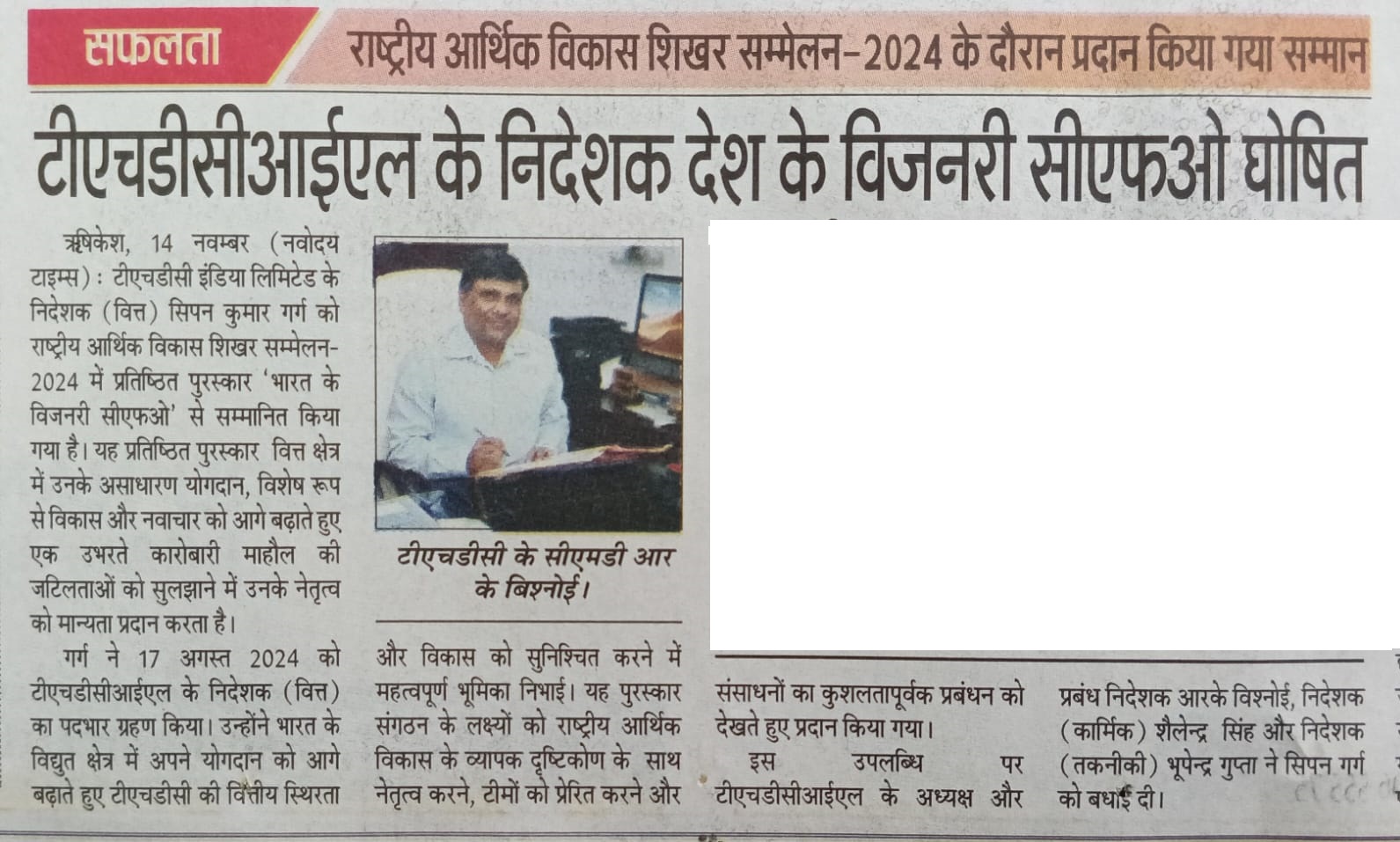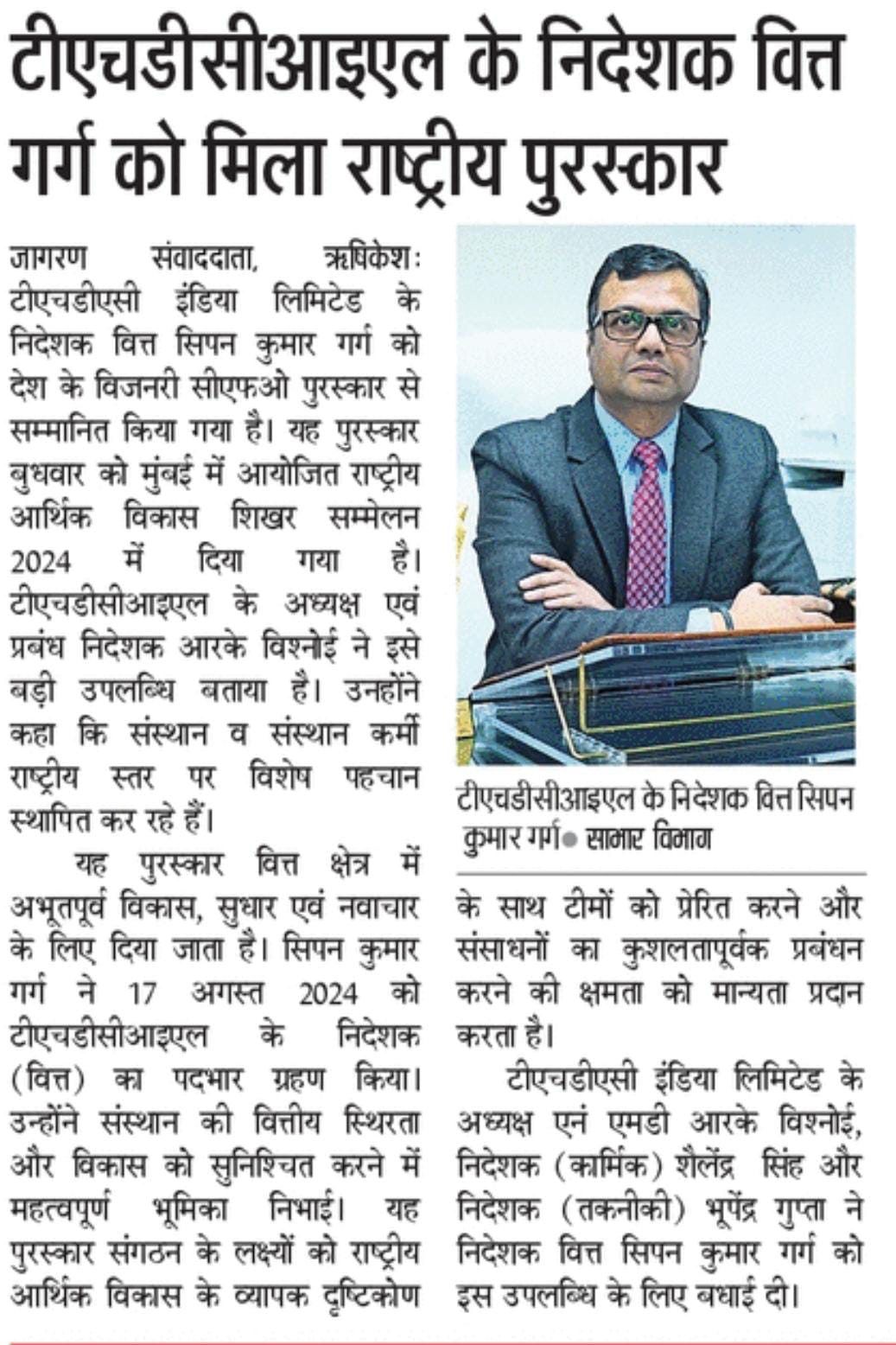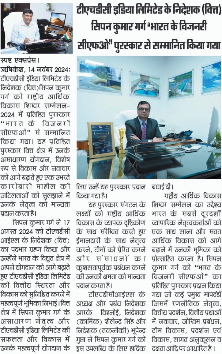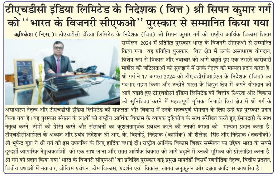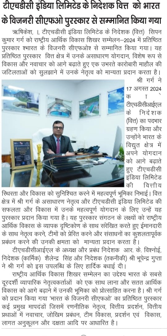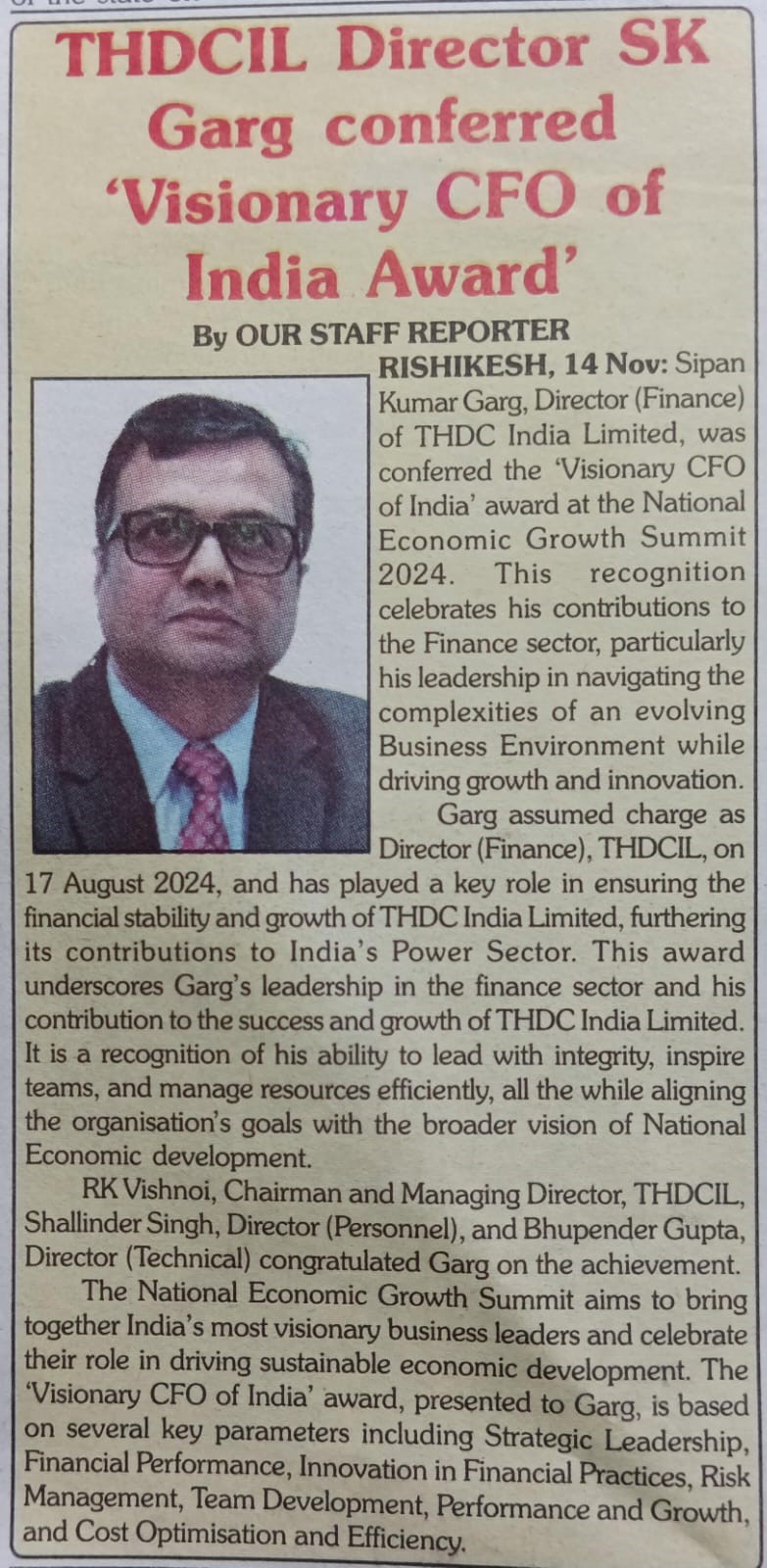 श्री गर्ग ने 17 अगस्त 2024 को टीएचडीसीआईएल के निदेशक (वित्त) का पदभार ग्रहण किया और उन्होंने भारत के विद्युत क्षेत्र में अपने योगदान को आगे बढ़ाते हुए टीएचडीसी इंडिया लिमिटेड की वित्तीय स्थिरता और विकास को सुनिश्चित करने में महत्वपूर्ण भूमिका निभाई। वित्त क्षेत्र में श्री गर्ग के असाधारण नेतृत्व और टीएचडीसी इंडिया लिमिटेड की सफलता और विकास में उनके महत्वपूर्ण योगदान के लिए उन्हें यह पुरस्कार प्रदान किया गया है। यह पुरस्कार संगठन के लक्ष्यों को राष्ट्रीय आर्थिक विकास के व्यापक दृष्टिकोण के साथ संरेखित करते हुए ईमानदारी के साथ नेतृत्व करने, टीमों को प्रेरित करने और संसाधनों का कुशलतापूर्वक प्रबंधन करने की उनकी क्षमता को मान्यता प्रदान करता है।