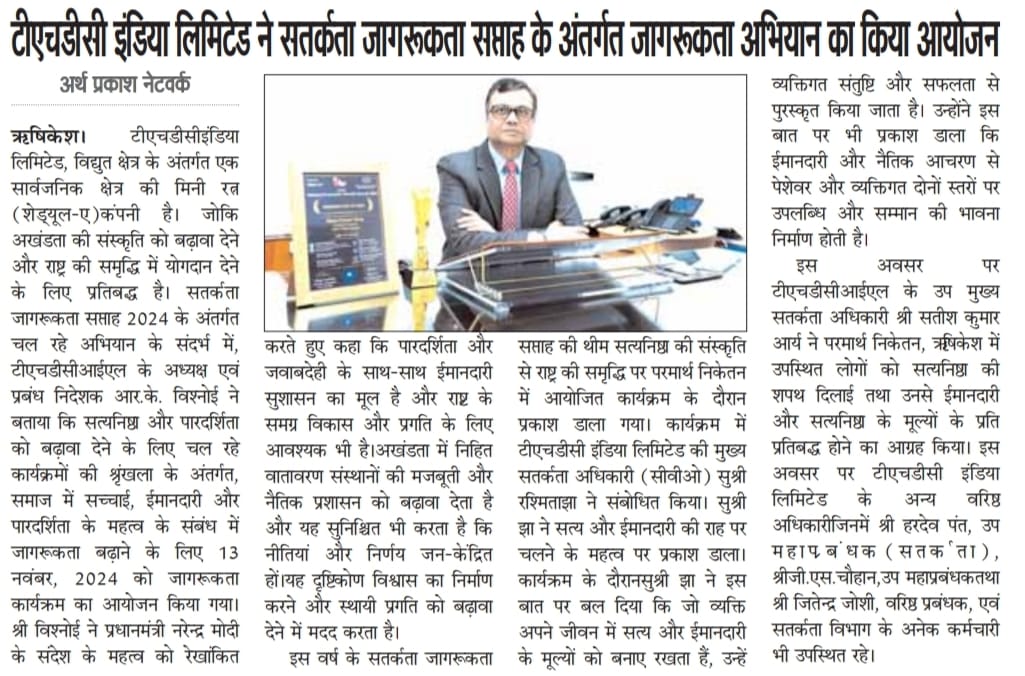 टीएचडीसीआईएल के अध्यक्ष और प्रबंध निदेशक श्री आर. के. विश्नोई, निदेशक (कार्मिक) श्री शैलेन्द्र सिंह और निदेशक (तकनीकी) श्री भूपेन्द्र गुप्ता ने श्री गर्ग को इस उपलब्धि के लिए हार्दिक बधाई दी।
