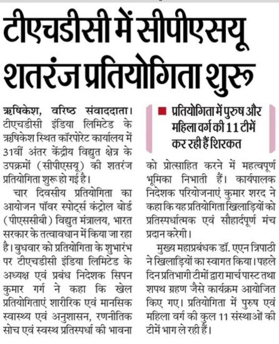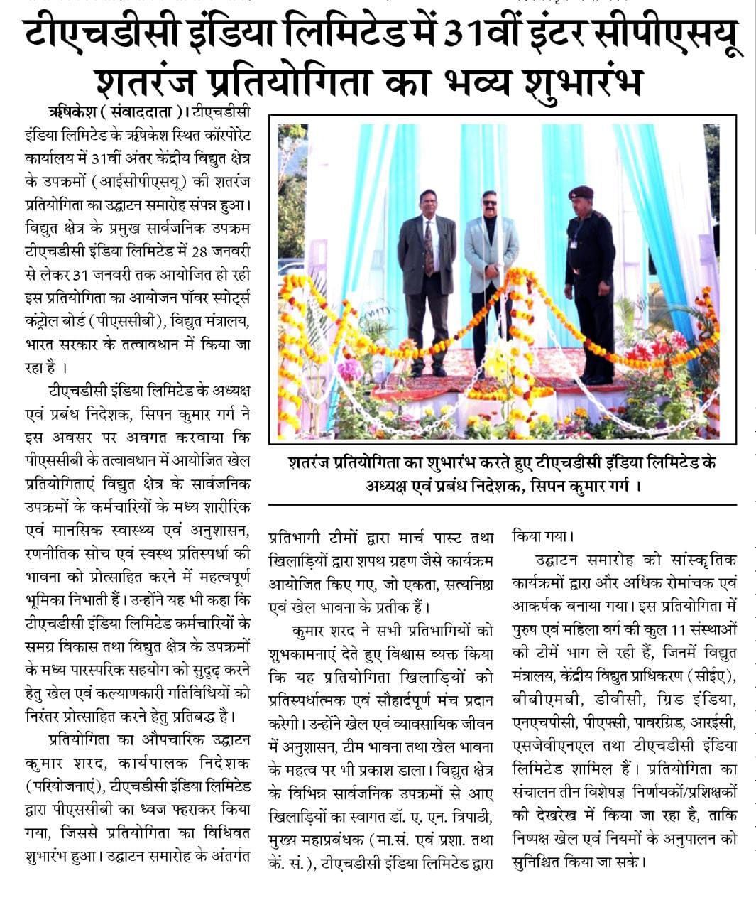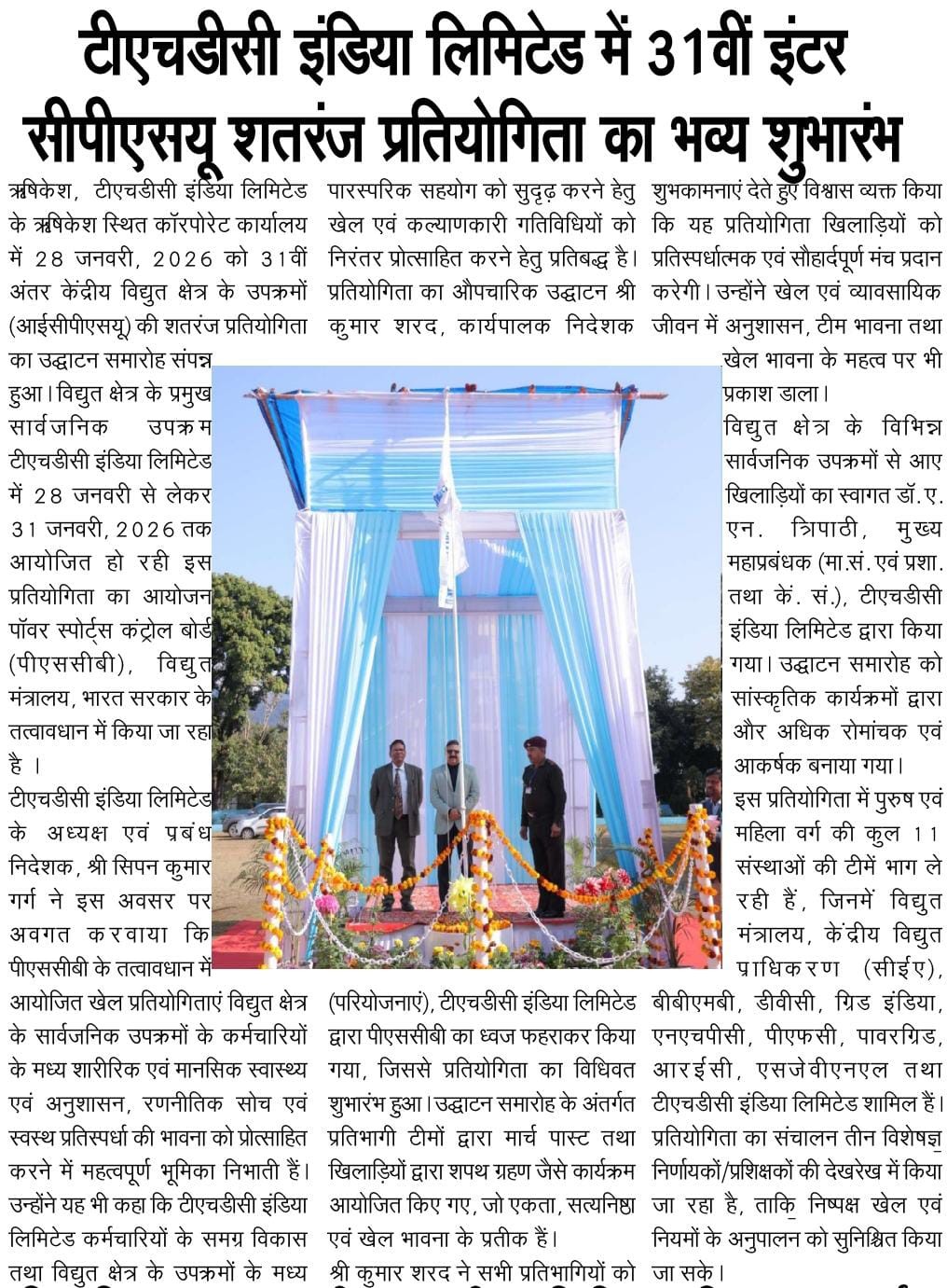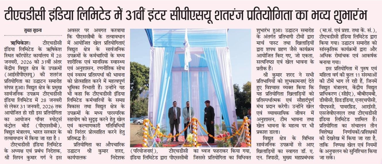 ऋषिकेश, 28.01.2026: टीएचडीसी इंडिया लिमिटेड के ऋषिकेश स्थित कॉरपोरेट कार्यालय में 28 जनवरी, 2026 को 31वीं अंतर केंद्रीय विद्युत क्षेत्र के उपक्रमों (आईसीपीएसयू) की शतरंज प्रतियोगिता का उद्घाटन समारोह संपन्न हुआ। विद्युत क्षेत्र के प्रमुख सार्वजनिक उपक्रम टीएचडीसी इंडिया लिमिटेड में 28 जनवरी से लेकर 31 जनवरी, 2026 तक आयोजित हो रही इस प्रतियोगिता का आयोजन पॉवर स्पोर्ट्स कंट्रोल बोर्ड (पीएससीबी), विद्युत मंत्रालय, भारत सरकार के तत्वावधान में किया जा रहा है।