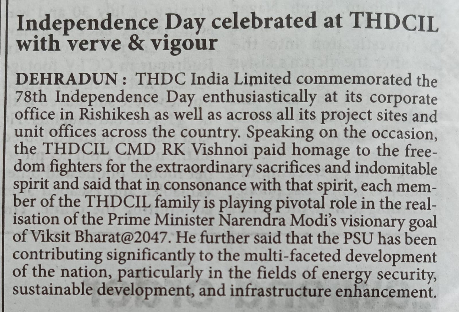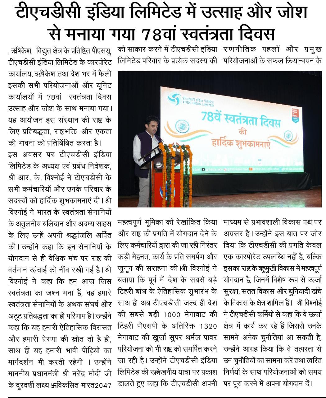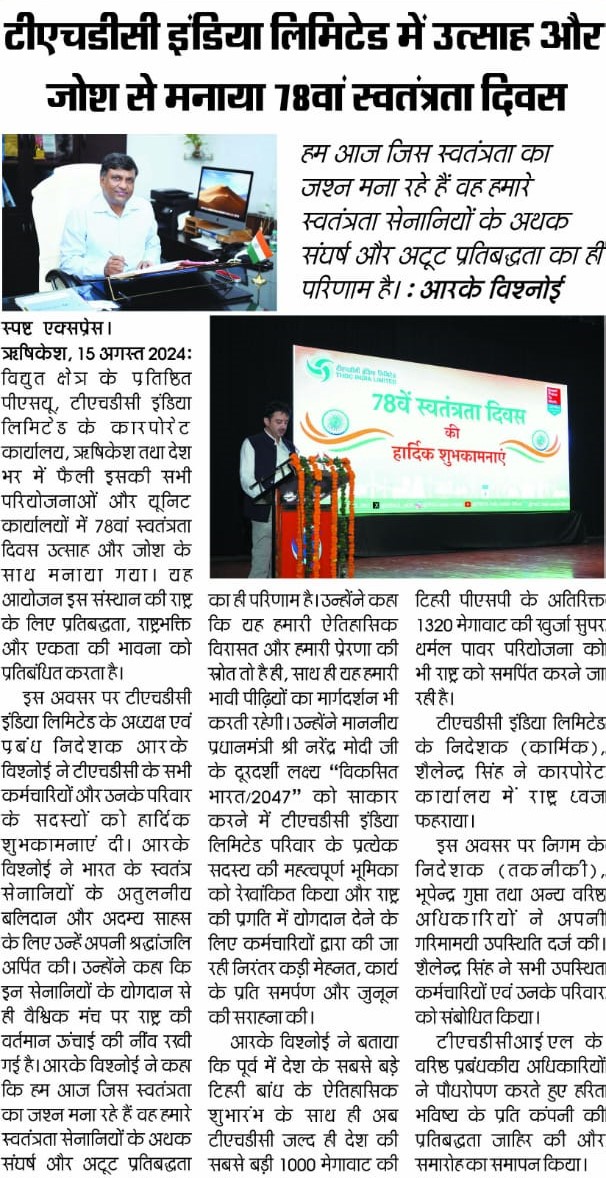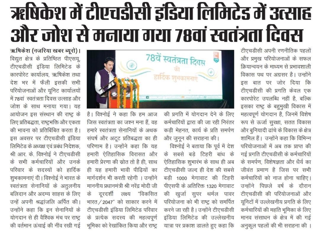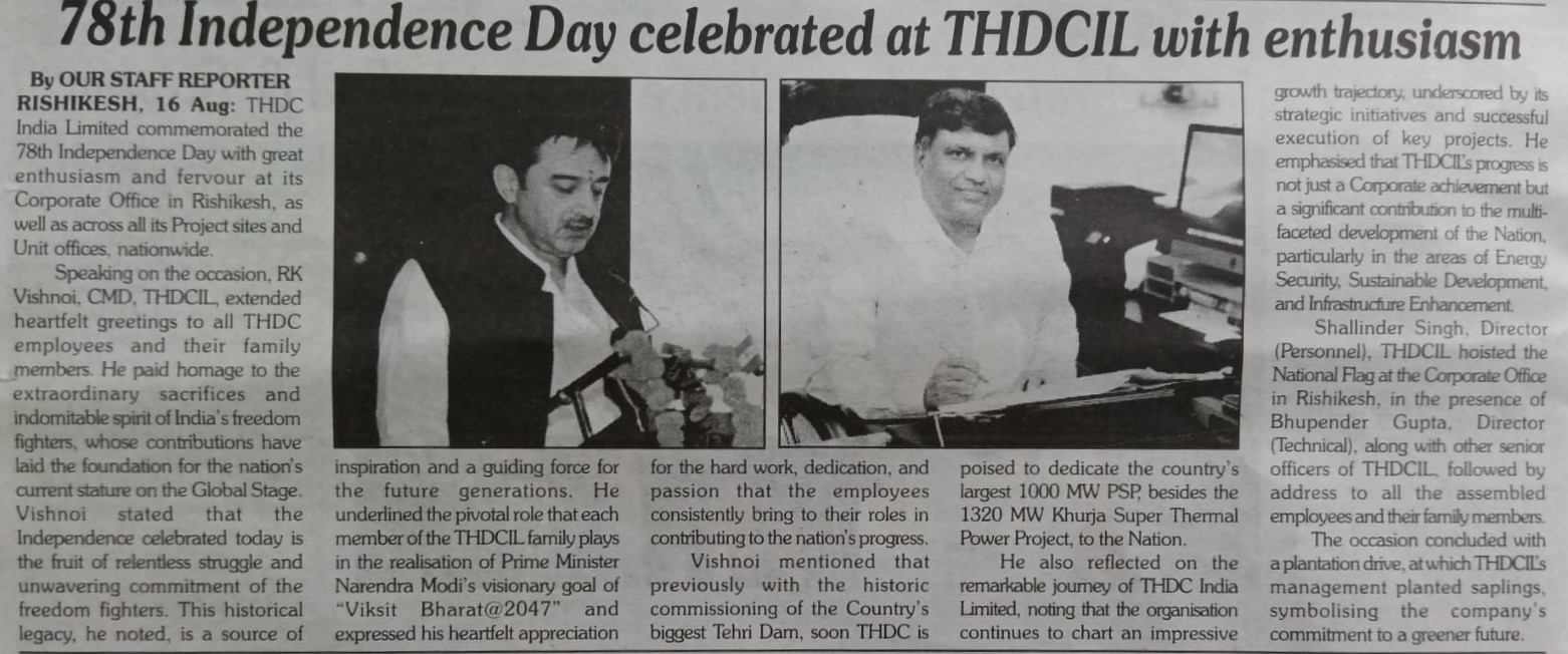 टीएचडीसी इंडिया लिमिटेड में स्वतंत्रता दिवस समारोह न केवल अतीत को याद करने का उत्सव बना, बल्कि इसमें राष्ट्र के भावी निर्माण में योगदान देने के लिए निगम की प्रतिबद्धता भी शामिल थी।  इस कार्यक्रम का समापन एकता और उद्देश्य की नई भावना के साथ हुआ तथा सभी कर्मचारी और उनके परिवार राष्ट्रीय भावना से ओतप्रोत हुए।