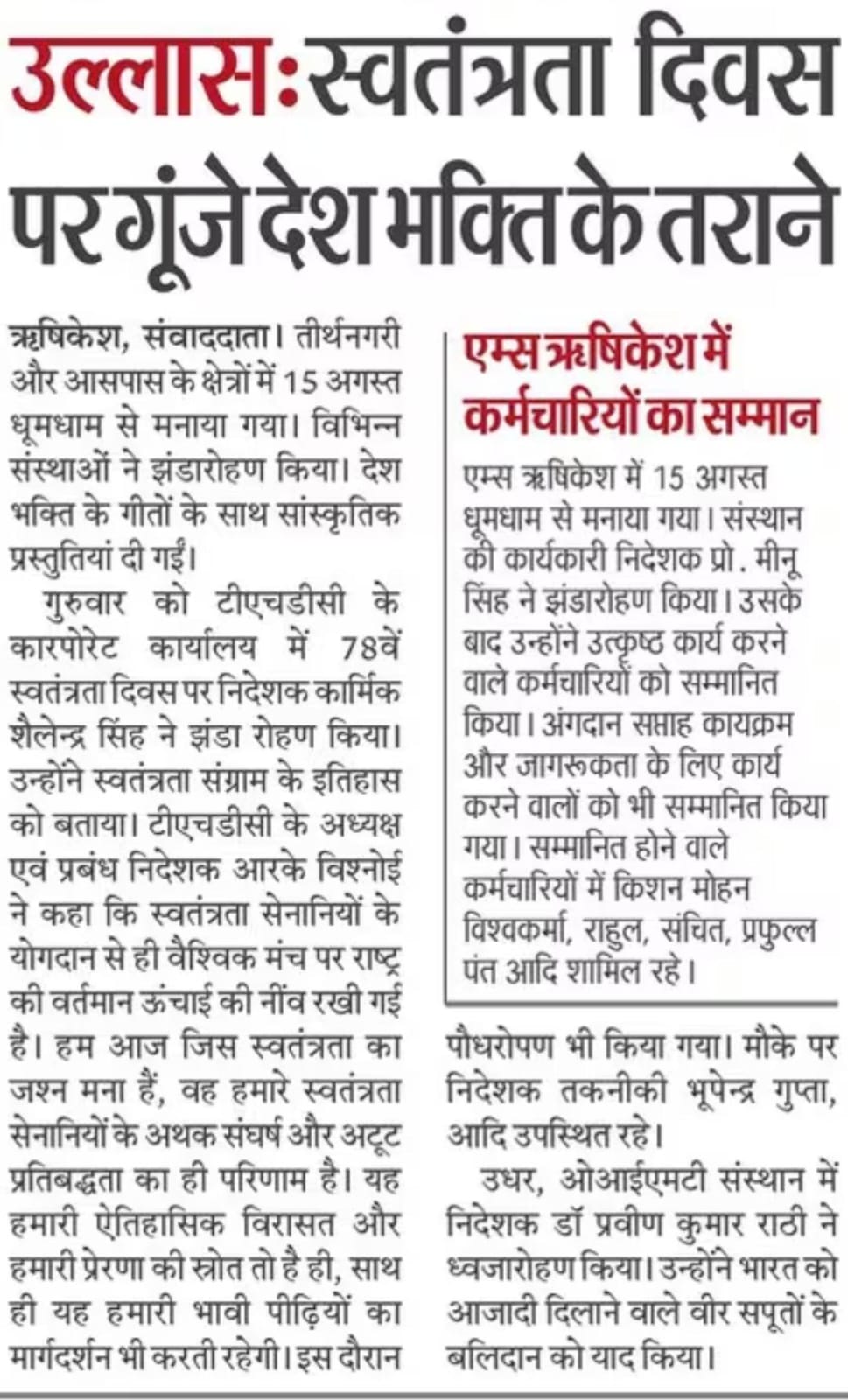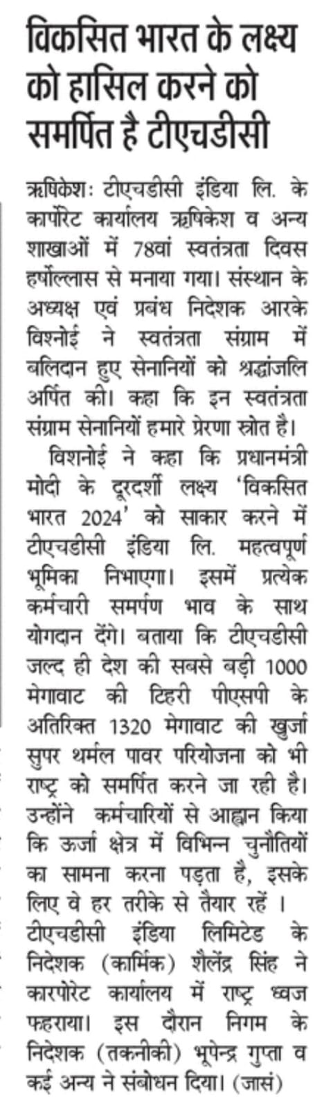 टीएचडीसी इंडिया लिमिटेड के निदेशक (कार्मिक), श्री शैलेन्द्र सिंह ने कारपोरेट कार्यालय में राष्ट्र ध्वज फहराया । इस अवसर पर निगम के निदेशक (तकनीकी), श्री भूपेन्द्र गुप्ता तथा अन्य वरिष्ठ अधिकारियों ने अपनी गरिमामयी उपस्थिति दर्ज की। श्री सिंह ने सभी उपस्थित कर्मचारियों एवं उनके परिवार के सदस्यों को संबोधित किया।