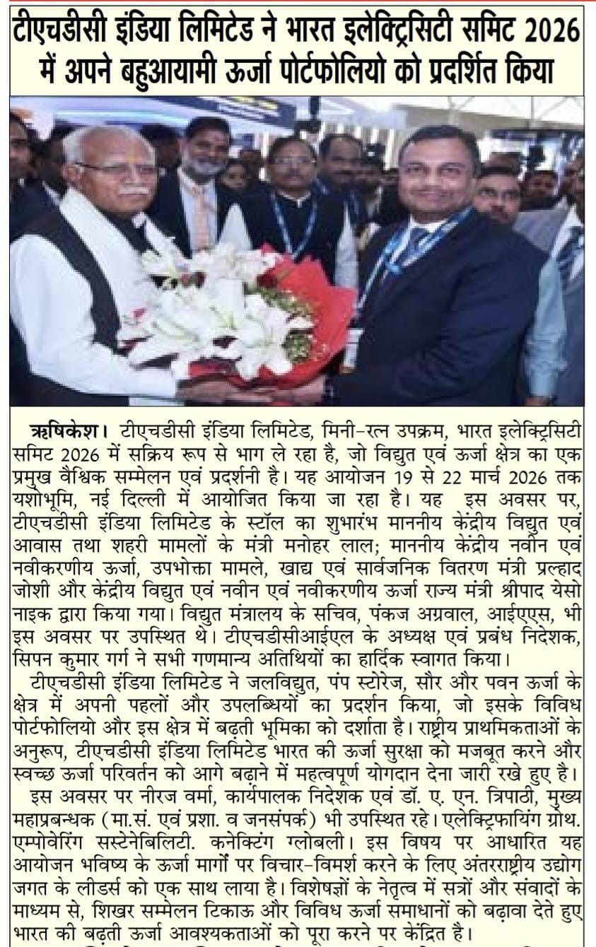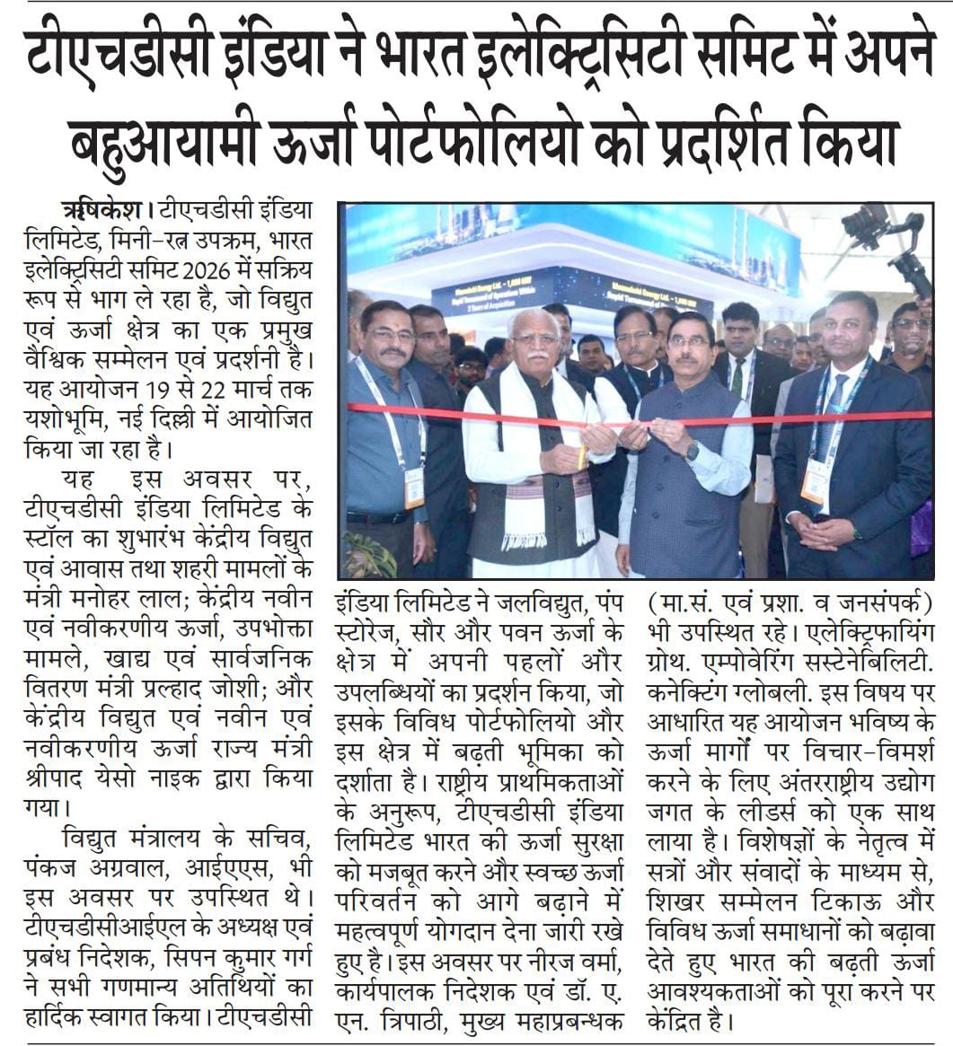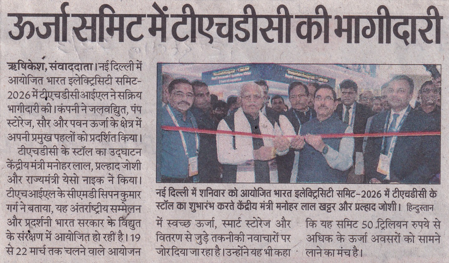 ऋषिकेश, 21.03.2026: टीएचडीसी इंडिया लिमिटेड, मिनी-रत्न उपक्रम, भारत इलेक्ट्रिसिटी समिट 2026 में सक्रिय रूप से भाग ले रहा है, जो विद्युत एवं ऊर्जा क्षेत्र का एक प्रमुख वैश्विक सम्मेलन एवं प्रदर्शनी है। यह आयोजन 19 से 22 मार्च 2026 तक यशोभूमि, नई दिल्ली में आयोजित किया जा रहा है। यह इस अवसर पर, टीएचडीसी इंडिया लिमिटेड के स्टॉल का शुभारंभ माननीय केंद्रीय विद्युत एवं आवास तथा शहरी मामलों के मंत्री श्री मनोहर लाल; माननीय केंद्रीय नवीन एवं नवीकरणीय ऊर्जा, उपभोक्ता मामले, खाद्य एवं सार्वजनिक वितरण मंत्री श्री प्रल्हाद जोशी; और माननीय केंद्रीय विद्युत एवं नवीन एवं नवीकरणीय ऊर्जा राज्य मंत्री श्री श्रीपाद येसो नाइक द्वारा किया गया। विद्युत मंत्रालय के सचिव, श्री पंकज अग्रवाल, आईएएस, भी इस अवसर पर उपस्थित थे। टीएचडीसीआईएल के अध्यक्ष एवं प्रबंध निदेशक, श्री सिपन कुमार गर्ग ने सभी गणमान्य अतिथियों का हार्दिक स्वागत किया। टीएचडीसी इंडिया लिमिटेड ने जलविद्युत, पंप स्टोरेज, सौर और पवन ऊर्जा के क्षेत्र में अपनी पहलों और उपलब्धियों का प्रदर्शन किया, जो इसके विविध पोर्टफोलियो और इस क्षेत्र में बढ़ती भूमिका को दर्शाता है। राष्ट्रीय प्राथमिकताओं के अनुरूप, टीएचडीसी इंडिया लिमिटेड भारत की ऊर्जा सुरक्षा को मजबूत करने और स्वच्छ ऊर्जा परिवर्तन को आगे बढ़ाने में महत्वपूर्ण योगदान देना जारी रखे हुए है। इस अवसर पर श्री नीरज वर्मा, कार्यपालक निदेशक एवं डॉ. ए. एन. त्रिपाठी, मुख्य महाप्रबन्धक (मा.सं. एवं प्रशा. व जनसंपर्क) भी उपस्थित रहे | “एलेक्ट्रिफायिंग ग्रोथ. एम्पोवेरिंग सस्टेनेबिलिटी. कनेक्टिंग ग्लोबली.” इस विषय पर आधारित यह आयोजन भविष्य के ऊर्जा मार्गों पर विचार-विमर्श करने के लिए अंतरराष्ट्रीय उद्योग जगत के लीडर्स को एक साथ लाया है। विशेषज्ञों के नेतृत्व में सत्रों और संवादों के माध्यम से, शिखर सम्मेलन टिकाऊ और विविध ऊर्जा समाधानों को बढ़ावा देते हुए भारत की बढ़ती ऊर्जा आवश्यकताओं को पूरा करने पर केंद्रित है।