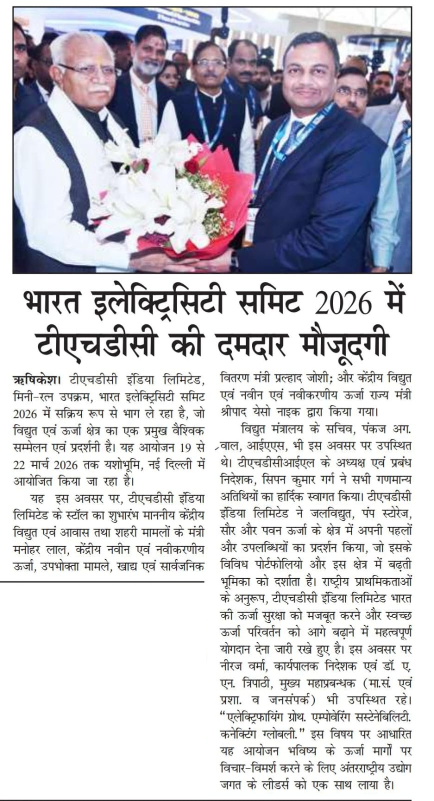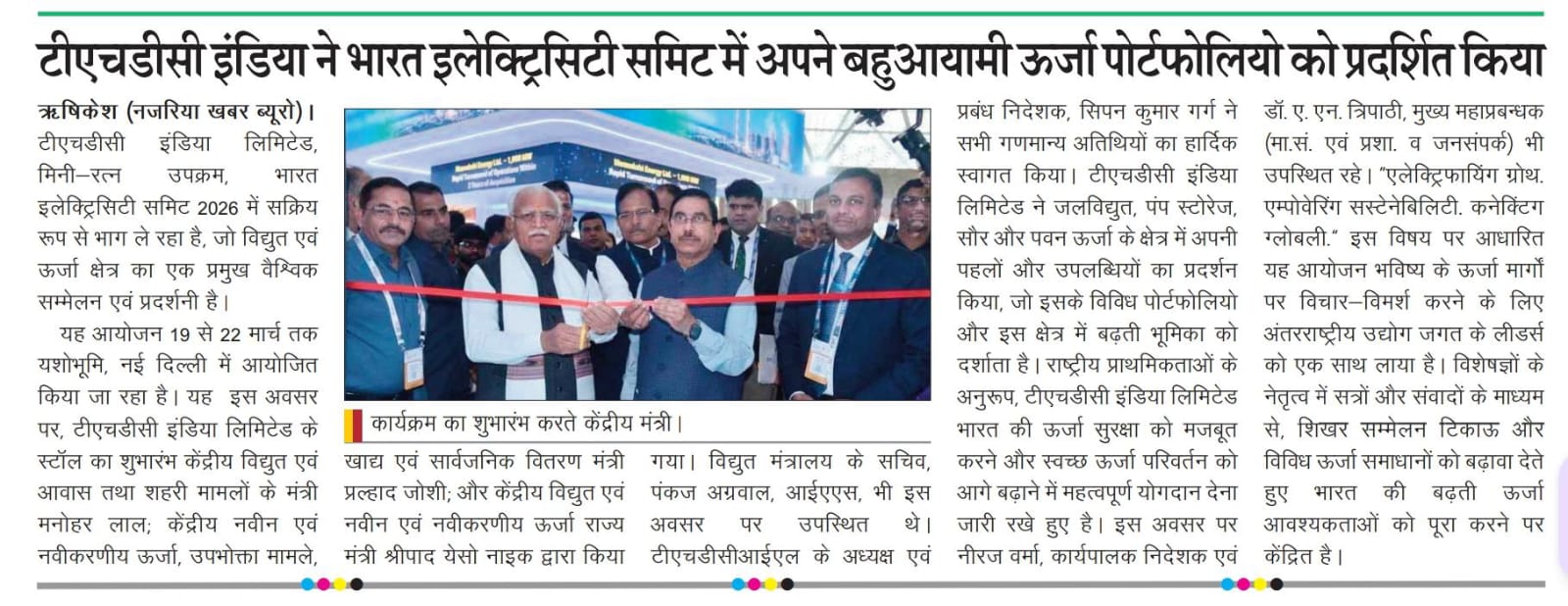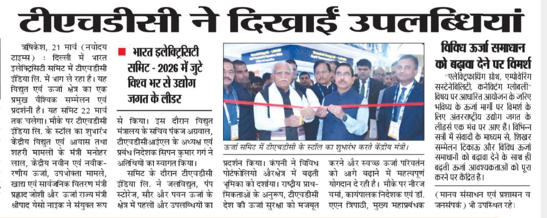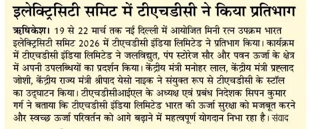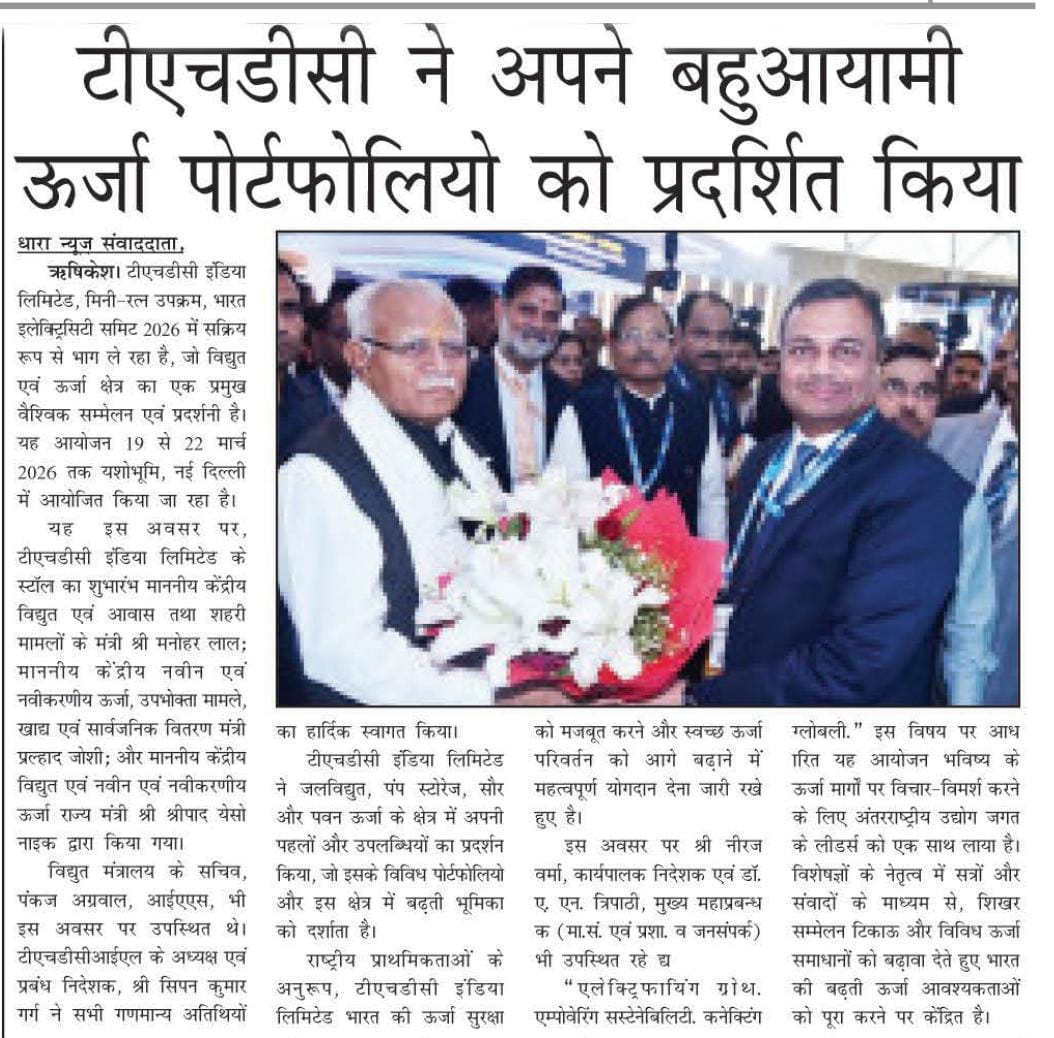 ऋषिकेश, 21.03.2026: टीएचडीसी इंडिया लिमिटेड, मिनी-रत्न उपक्रम, भारत इलेक्ट्रिसिटी समिट 2026 में सक्रिय रूप से भाग ले रहा है, जो विद्युत एवं ऊर्जा क्षेत्र का एक प्रमुख वैश्विक सम्मेलन एवं प्रदर्शनी है। यह आयोजन 19 से 22 मार्च 2026 तक यशोभूमि, नई दिल्ली में आयोजित किया जा रहा है। यह इस अवसर पर, टीएचडीसी इंडिया लिमिटेड के स्टॉल का शुभारंभ माननीय केंद्रीय विद्युत एवं आवास तथा शहरी मामलों के मंत्री श्री मनोहर लाल; माननीय केंद्रीय नवीन एवं नवीकरणीय ऊर्जा, उपभोक्ता मामले, खाद्य एवं सार्वजनिक वितरण मंत्री श्री प्रल्हाद जोशी; और माननीय केंद्रीय विद्युत एवं नवीन एवं नवीकरणीय ऊर्जा राज्य मंत्री श्री श्रीपाद येसो नाइक द्वारा किया गया। विद्युत मंत्रालय के सचिव, श्री पंकज अग्रवाल, आईएएस, भी इस अवसर पर उपस्थित थे। टीएचडीसीआईएल के अध्यक्ष एवं प्रबंध निदेशक, श्री सिपन कुमार गर्ग ने सभी गणमान्य अतिथियों का हार्दिक स्वागत किया। टीएचडीसी इंडिया लिमिटेड ने जलविद्युत, पंप स्टोरेज, सौर और पवन ऊर्जा के क्षेत्र में अपनी पहलों और उपलब्धियों का प्रदर्शन किया, जो इसके विविध पोर्टफोलियो और इस क्षेत्र में बढ़ती भूमिका को दर्शाता है। राष्ट्रीय प्राथमिकताओं के अनुरूप, टीएचडीसी इंडिया लिमिटेड भारत की ऊर्जा सुरक्षा को मजबूत करने और स्वच्छ ऊर्जा परिवर्तन को आगे बढ़ाने में महत्वपूर्ण योगदान देना जारी रखे हुए है। इस अवसर पर श्री नीरज वर्मा, कार्यपालक निदेशक एवं डॉ. ए. एन. त्रिपाठी, मुख्य महाप्रबन्धक (मा.सं. एवं प्रशा. व जनसंपर्क) भी उपस्थित रहे | “एलेक्ट्रिफायिंग ग्रोथ. एम्पोवेरिंग सस्टेनेबिलिटी. कनेक्टिंग ग्लोबली.” इस विषय पर आधारित यह आयोजन भविष्य के ऊर्जा मार्गों पर विचार-विमर्श करने के लिए अंतरराष्ट्रीय उद्योग जगत के लीडर्स को एक साथ लाया है। विशेषज्ञों के नेतृत्व में सत्रों और संवादों के माध्यम से, शिखर सम्मेलन टिकाऊ और विविध ऊर्जा समाधानों को बढ़ावा देते हुए भारत की बढ़ती ऊर्जा आवश्यकताओं को पूरा करने पर केंद्रित है।