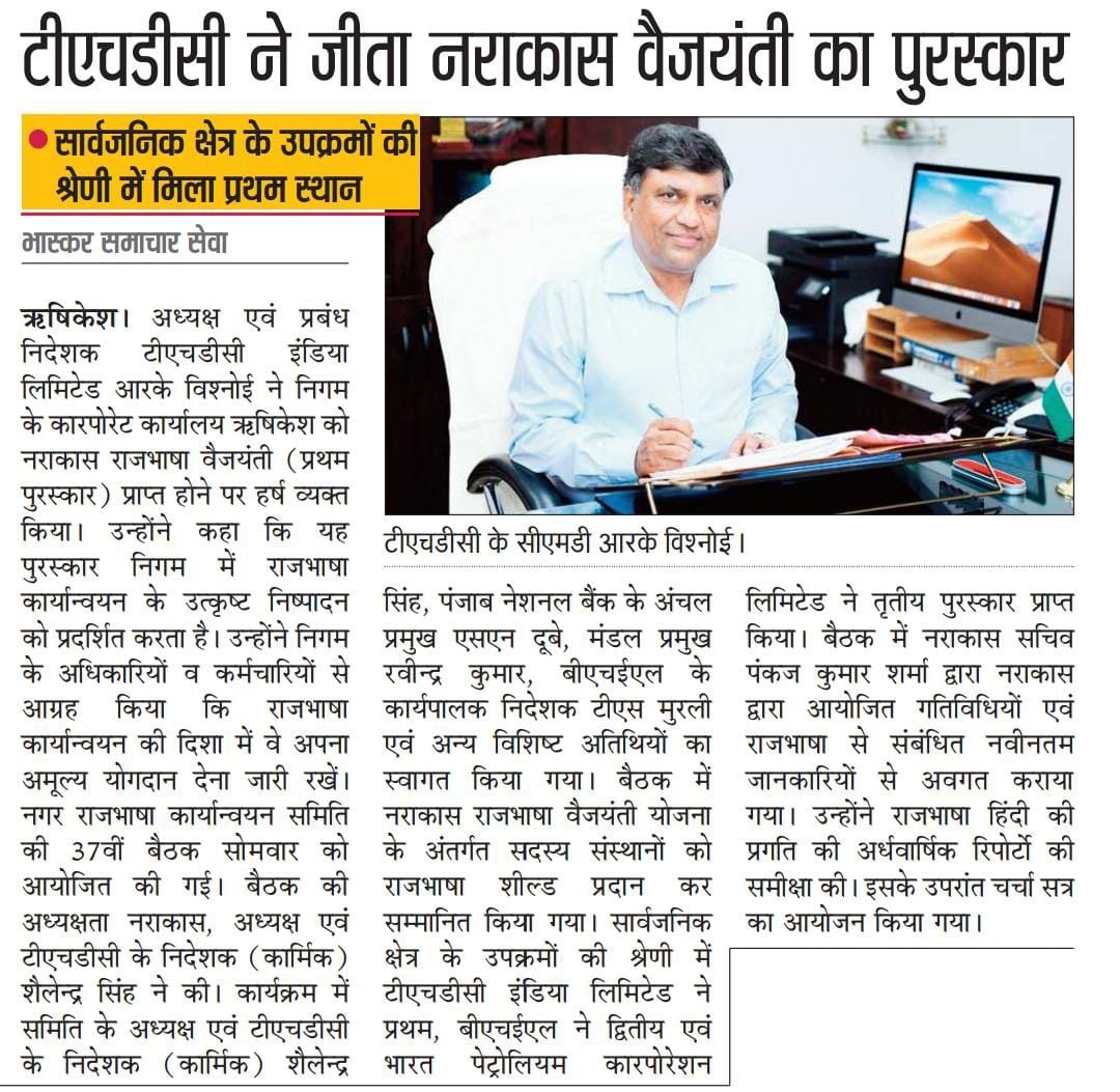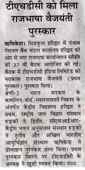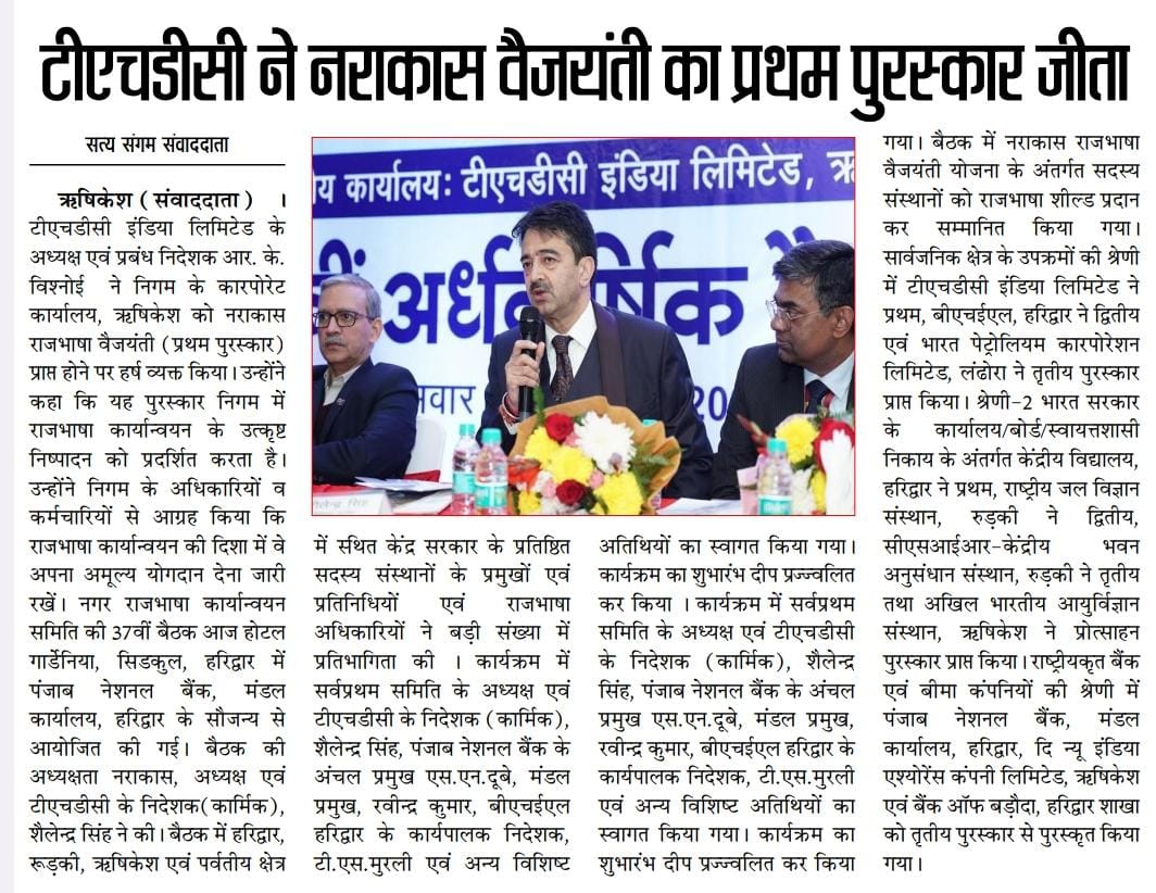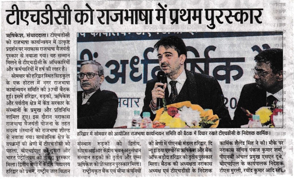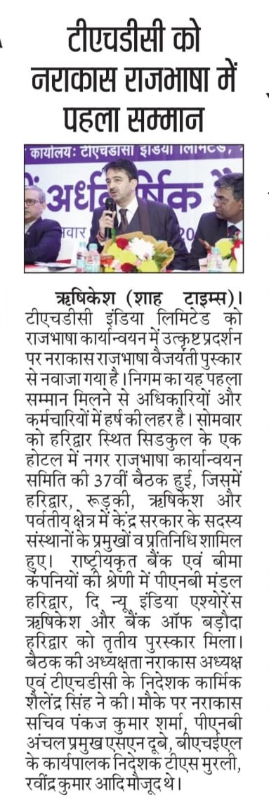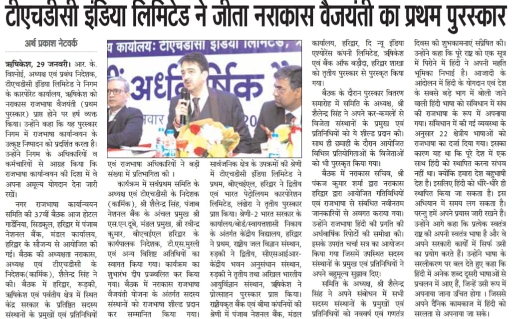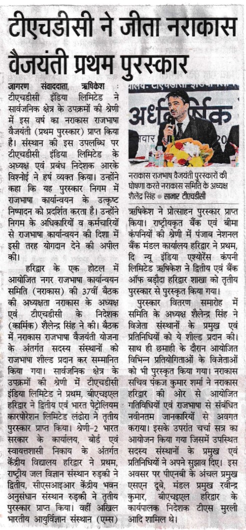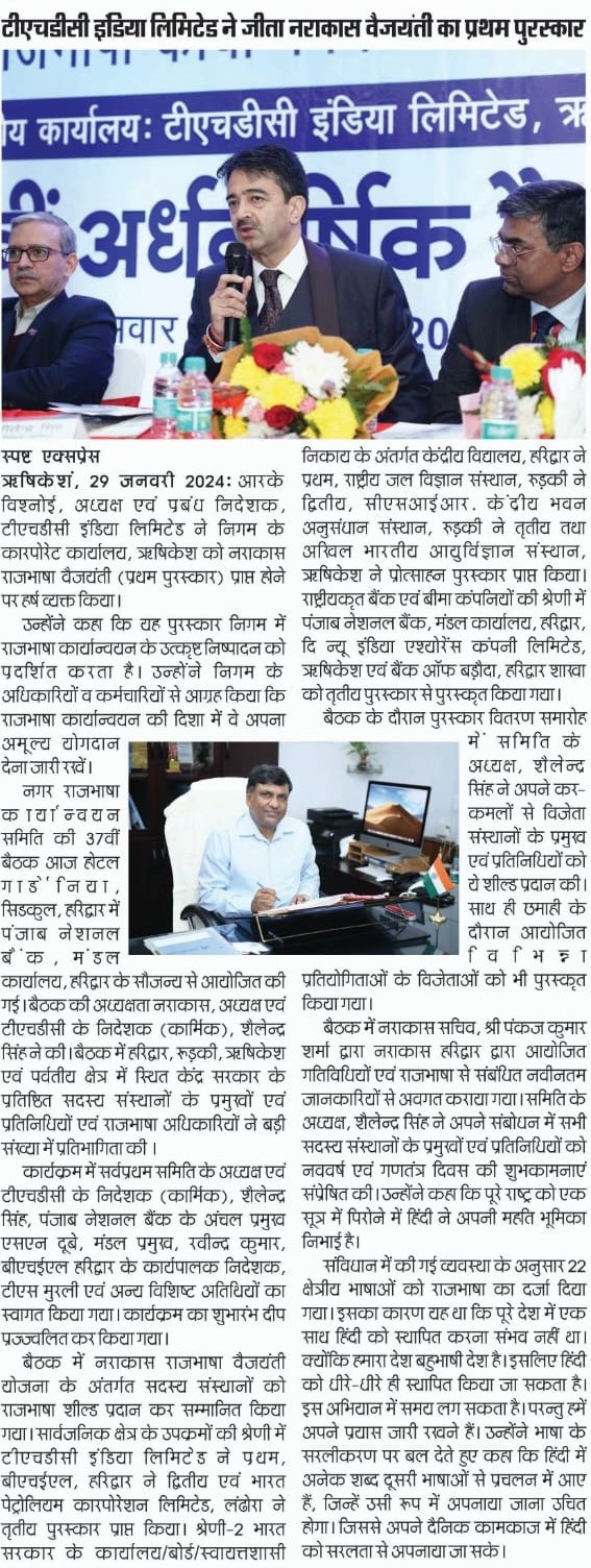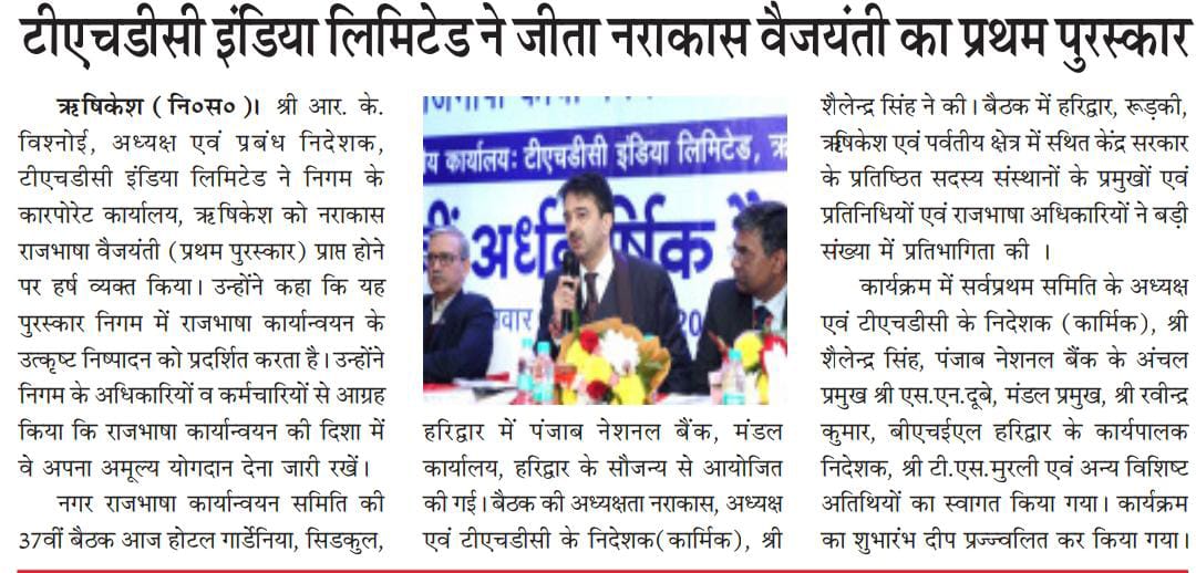 ऋषिकेश, 29-जनवरी-2024: श्री आर. के. विश्नोई, अध्यक्ष एवं प्रबंध निदेशक, टीएचडीसी इंडिया लिमिटेड ने निगम के कारपोरेट कार्यालय, ऋषिकेश को नराकास राजभाषा वैजयंती (प्रथम पुरस्कार) प्राप्त होने पर हर्ष व्यक्त किया। उन्होंने कहा कि यह पुरस्कार निगम में राजभाषा कार्यान्वयन के उत्कृष्ट निष्पादन को प्रदर्शित करता है। उन्होंने निगम के अधिकारियों व कर्मचारियों से आग्रह किया कि राजभाषा कार्यान्वयन की दिशा में वे अपना अमूल्य योगदान देना जारी रखें। नगर राजभाषा कार्यान्वयन समिति की 37वीं बैठक आज होटल गार्डेनिया, सिडकुल, हरिद्वार में पंजाब नेशनल बैंक, मंडल कार्यालय, हरिद्वार के सौजन्य से आयोजित की गई। बैठक की अध्यक्षता नराकास, अध्यक्ष एवं टीएचडीसी के निदेशक(कार्मिक), श्री शैलेन्द्र सिंह ने की। बैठक में हरिद्वार, रूड़की, ऋषिकेश एवं पर्वतीय क्षेत्र में स्थित केंद्र सरकार के प्रतिष्ठित सदस्य संस्थानों के प्रमुखों एवं प्रतिनिधियों एवं राजभाषा अधिकारियों ने बड़ी संख्या में प्रतिभागिता की । कार्यक्रम में सर्वप्रथम समिति के अध्यक्ष एवं टीएचडीसी के निदेशक (कार्मिक), श्री शैलेन्द्र सिंह, पंजाब नेशनल बैंक के अंचल प्रमुख श्री एस.एन.दूबे, मंडल प्रमुख, श्री रवीन्द्र कुमार, बीएचईएल हरिद्वार के कार्यपालक निदेशक, श्री टी.एस.मुरली एवं अन्य विशिष्ट अतिथियों का स्वागत किया गया। कार्यक्रम का शुभारंभ दीप प्रज्ज्वलित कर किया गया। बैठक में नराकास राजभाषा वैजयंती योजना के अंतर्गत सदस्य संस्थानों को राजभाषा शील्ड प्रदान कर सम्मानित किया गया। सार्वजनिक क्षेत्र के उपक्रमों की श्रेणी में टीएचडीसी इंडिया लिमिटेड ने प्रथम, बीएचईएल, हरिद्वार ने द्वितीय एवं भारत पेट्रोलियम कारपोरेशन लिमिटेड, लंढोरा ने तृतीय पुरस्कार प्राप्त किया। श्रेणी-2 भारत सरकार के कार्यालय/बोर्ड/स्वायत्तशासी निकाय के अंतर्गत केंद्रीय विद्यालय, हरिद्वार ने प्रथम, राष्ट्रीय जल विज्ञान संस्थान, रुड़की ने द्वितीय, सीएसआईआर-केंद्रीय भवन अनुसंधान संस्थान, रुड़की ने तृतीय तथा अखिल भारतीय आयुर्विज्ञान संस्थान, ऋषिकेश ने प्रोत्साहन पुरस्कार प्राप्त किया। राष्ट्रीयकृत बैंक एवं बीमा कंपनियों की श्रेणी में पंजाब नेशनल बैंक, मंडल कार्यालय, हरिद्वार, दि न्यू इंडिया एश्योरेंस कंपनी लिमिटेड, ऋषिकेश एवं बैंक ऑफ बड़ौदा, हरिद्वार शाखा को तृतीय पुरस्कार से पुरस्कृत किया गया। बैठक के दौरान पुरस्कार वितरण समारोह में समिति के अध्यक्ष, श्री शैलेन्द्र सिंह ने अपने कर-कमलों से विजेता संस्थानों के प्रमुख एवं प्रतिनिधियों को ये शील्ड प्रदान की। साथ ही छमाही के दौरान आयोजित विभिन्न प्रतियोगिताओं के विजेताओं को भी पुरस्कृत किया गया। बैठक म