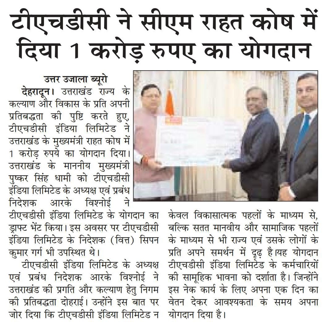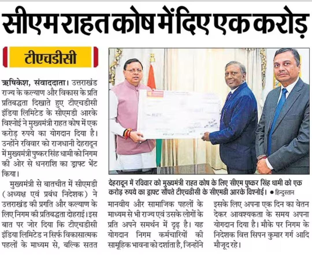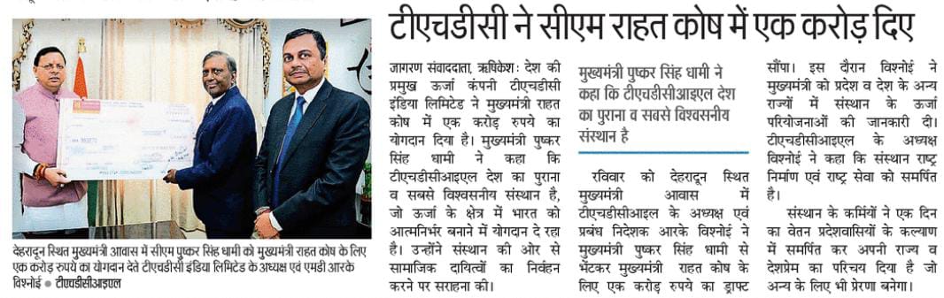 यह योगदान टीएचडीसी इंडिया लिमिटेड के कर्मचारियों की सामूहिक भावना को दर्शाता है। जिन्होंने इस नेक कार्य के लिए अपना एक दिन का वेतन देकर आवश्यकता के समय अपना योगदान दिया है।