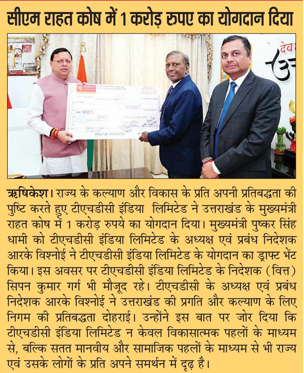 ऋषिकेश, 19 अक्टूबर, 2025:  उत्तराखंड राज्य के कल्याण और विकास के प्रति अपनी प्रतिबद्धता की पुष्टि करते हुए, टीएचडीसी इंडिया  लिमिटेड ने उत्तराखंड के मुख्यमंत्री राहत कोष में 1 करोड़ रुपये का योगदान दिया। उत्तराखंड के माननीय मुख्यमंत्री श्री पुष्कर सिंह धामी को टीएचडीसी इंडिया लिमिटेड के अध्यक्ष एवं प्रबंध निदेशक, श्री आर. के. विश्नोई ने टीएचडीसी इंडिया लिमिटेड के योगदान का ड्राफ्ट भेंट किया। इस अवसर पर टीएचडीसी इंडिया लिमिटेड के निदेशक (वित्त), श्री सिपन कुमार गर्ग भी उपस्थित थे।