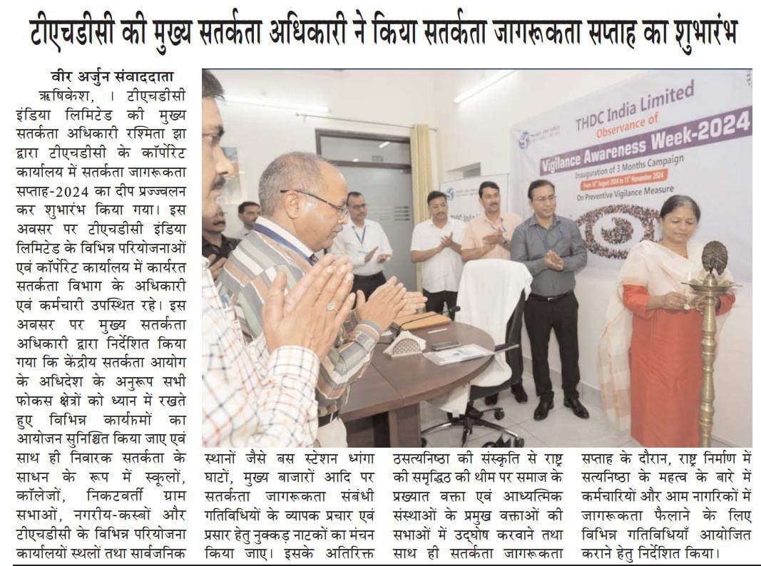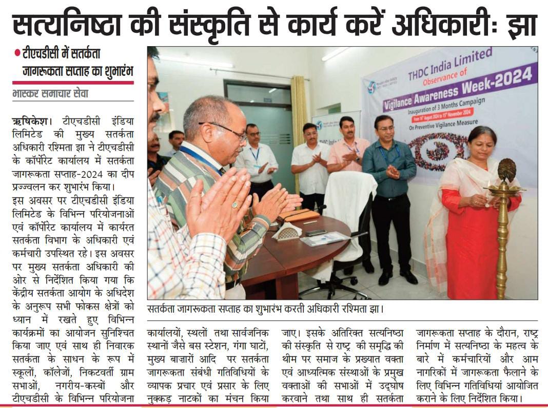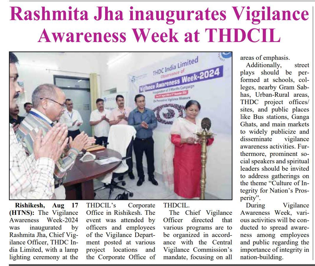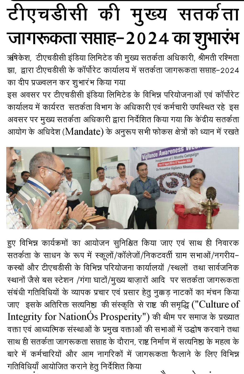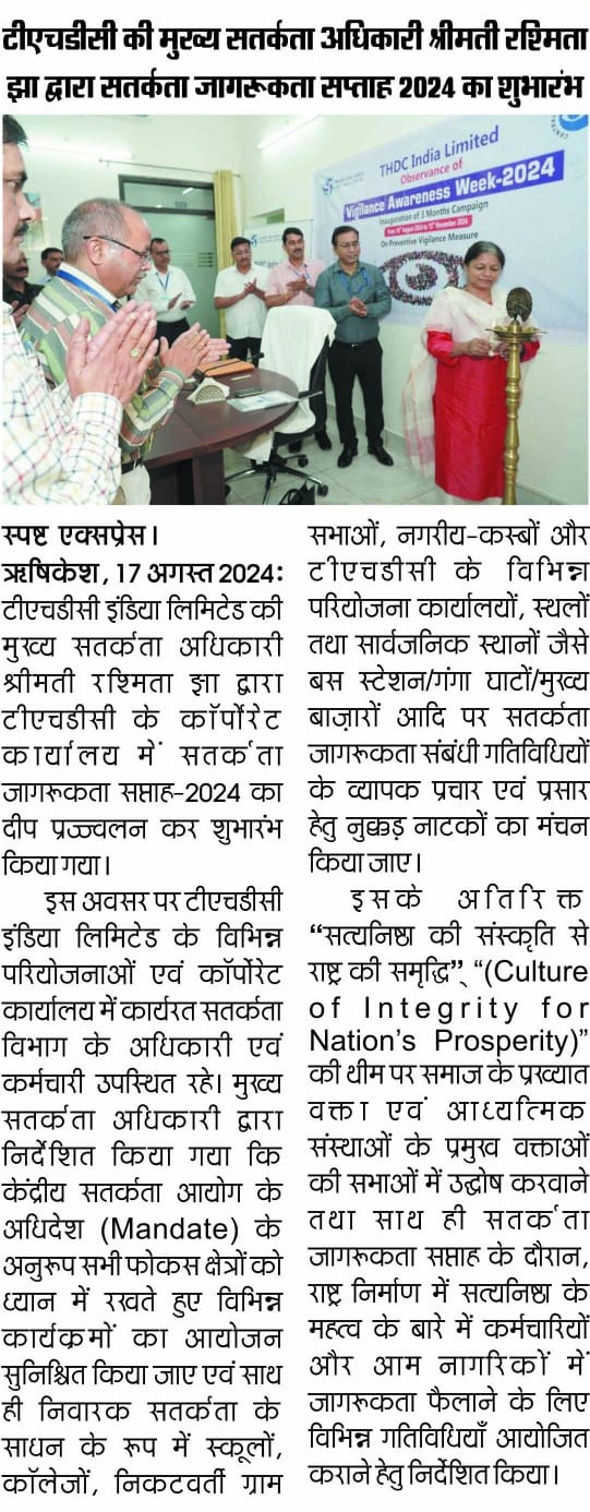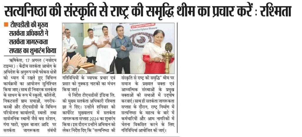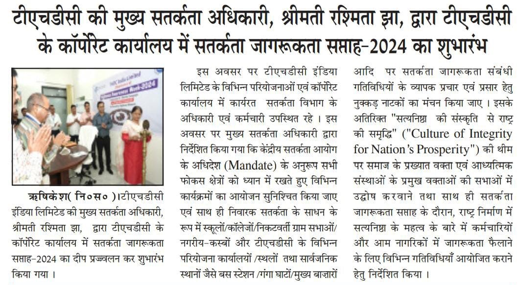ऋषिकेश, 17-08-2024: टीएचडीसी इंडिया लिमिटेड की मुख्य सतर्कता अधिकारी, श्रीमती रश्मिता झा, द्वारा टीएचडीसी के कॉर्पोरेट कार्यालय में सतर्कता जागरूकता सप्ताह-2024 का दीप प्रज्ज्वलन कर शुभारंभ किया गया|