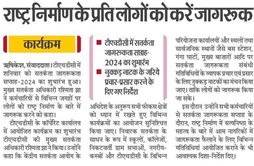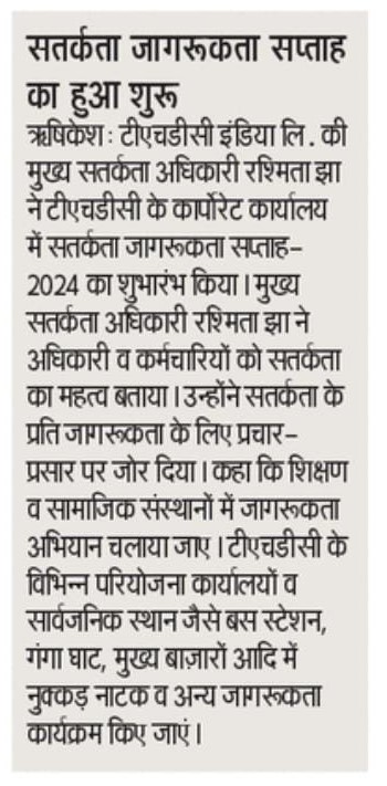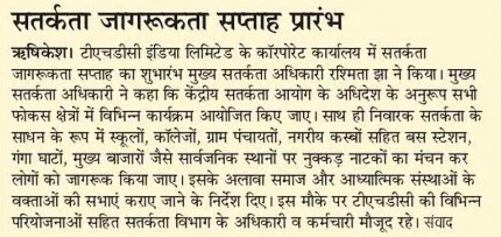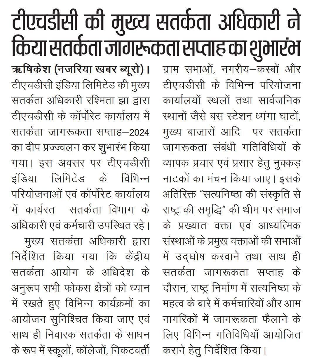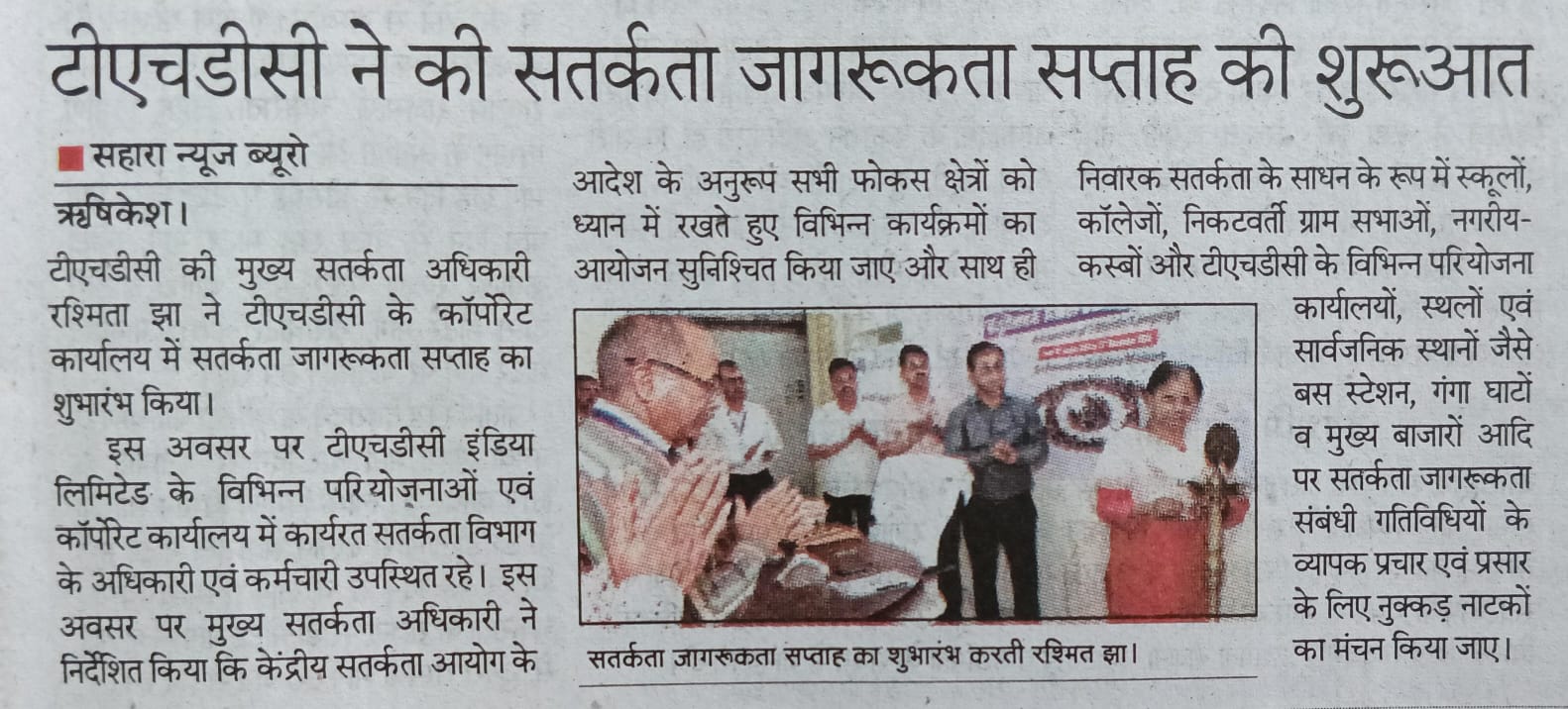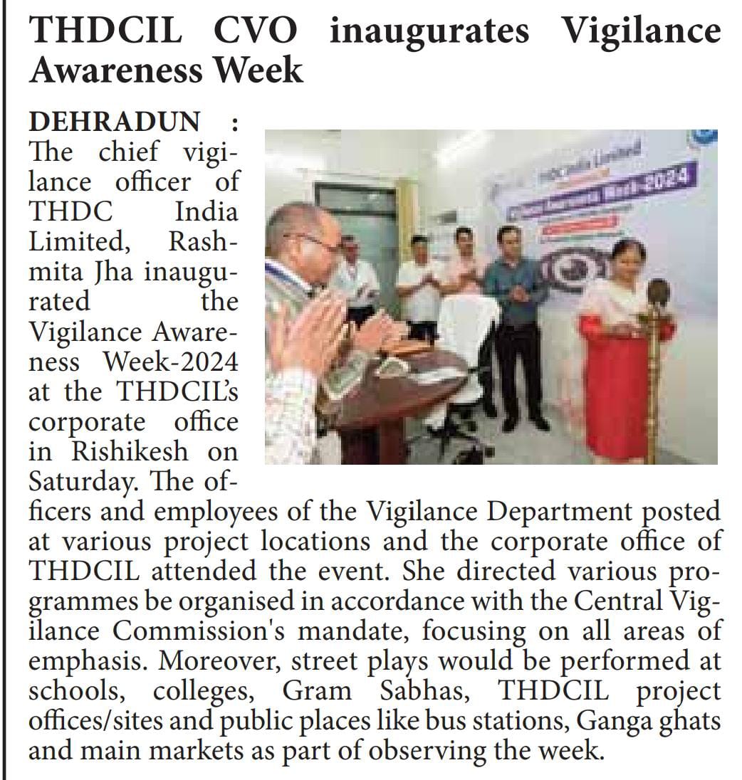 इस अवसर पर टीएचडीसी इंडिया लिमिटेड के विभिन्न परियोजनाओं एवं कॉर्पोरेट कार्यालय में कार्यरत सतर्कता विभाग के अधिकारी एवं कर्मचारी उपस्थित रहे | इस अवसर पर मुख्य सतर्कता अधिकारी द्वारा निर्देशित किया गया कि केंद्रीय सतर्कता आयोग के अधिदेश (Mandate) के अनुरूप सभी फोकस क्षेत्रों को ध्यान में रखते हुए विभिन्न कार्यक्रमों का आयोजन सुनिश्चित किया जाए एवं साथ ही निवारक सतर्कता के साधन के रूप में स्कूलों/कॉलेजों/निकटवर्ती ग्राम सभाओं/नगरीय-कस्बों और टीएचडीसी के विभिन्न परियोजना कार्यालयों /स्थलों तथा सार्वजनिक स्थानों जैसे बस स्टेशन /गंगा घाटों/मुख्य बाज़ारों आदि पर सतर्कता जागरूकता संबंधी गतिविधियों के व्यापक प्रचार एवं प्रसार हेतु नुक्कड़ नाटकों का मंचन किया जाए | इसके अतिरिक्त “सत्यनिष्ठा की संस्कृति से राष्ट्र की समृद्धि” (“Culture of Integrity for Nation’s Prosperity”) की थीम पर समाज के प्रख्यात वक्ता एवं आध्यत्मिक संस्थाओं के प्रमुख वक्ताओं की सभाओं में उद्घोष करवाने तथा साथ ही सतर्कता जागरूकता सप्ताह के दौरान, राष्ट्र निर्माण में सत्यनिष्ठा के महत्व के बारे में कर्मचारियों और आम नागरिकों में जागरूकता फैलाने के लिए विभिन्न गतिविधियाँ आयोजित कराने हेतु निर्देशित किया|