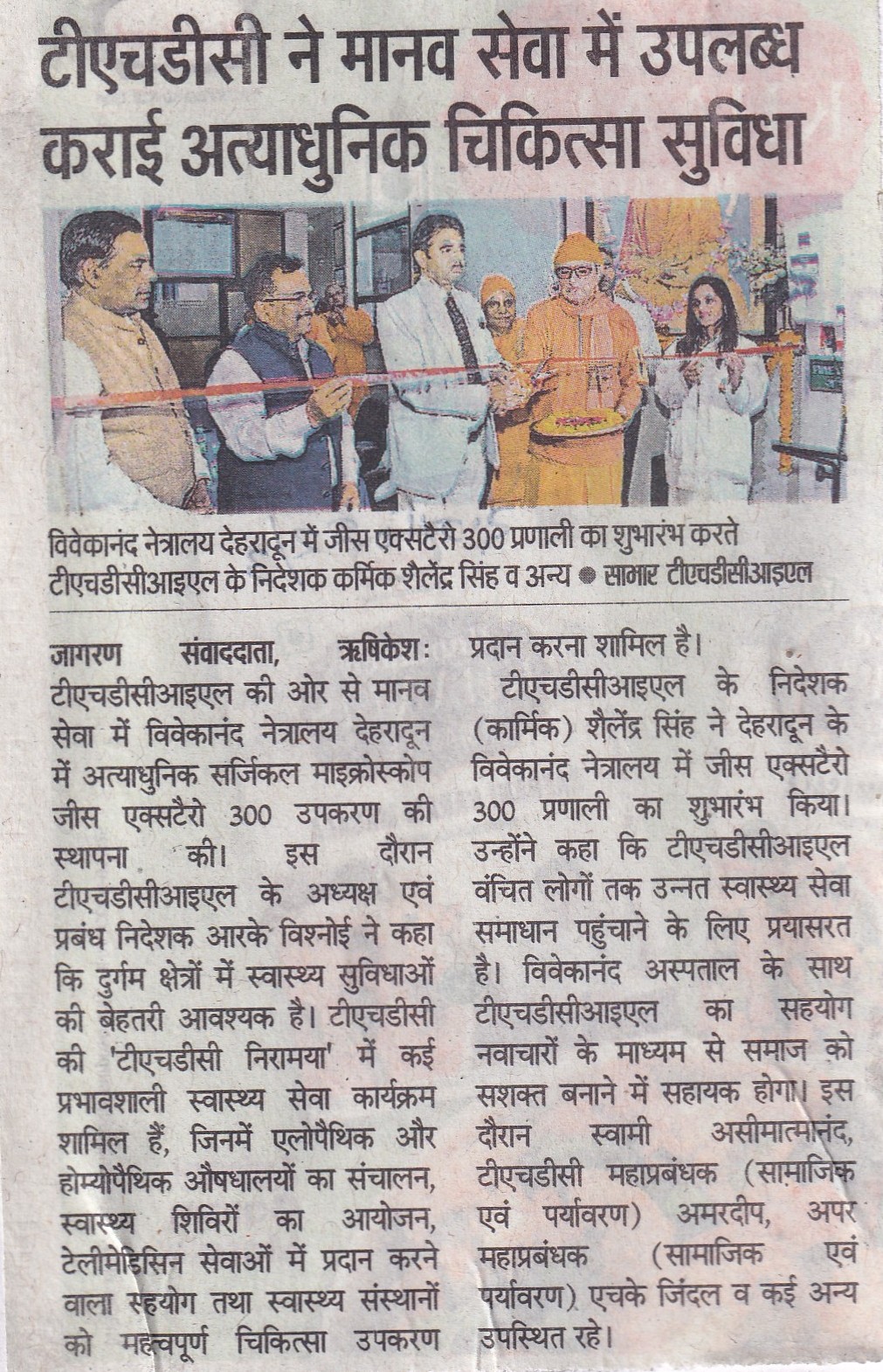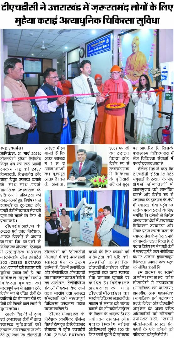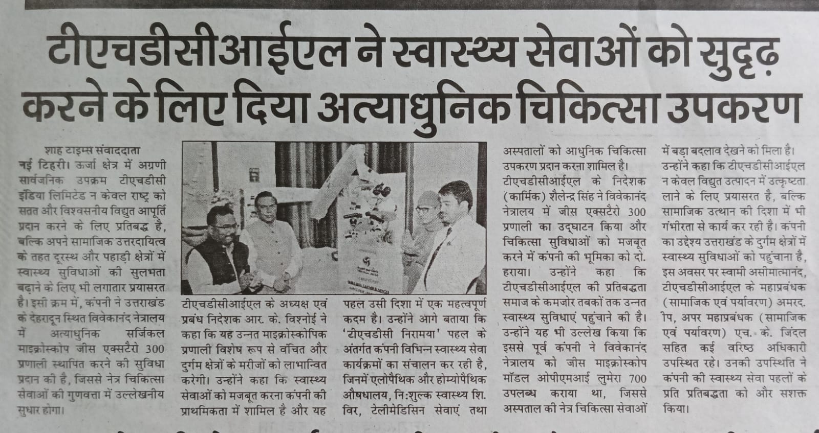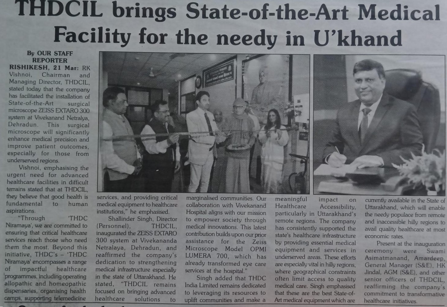 टीएचडीसीआईएल के निदेशक (कार्मिक), श्री शैलेन्द्र सिंह ने देहरादून के विवेकानंद नेत्रालय में ज़ीस एक्सटैरो 300 (ZEISS EXTARO 300) प्रणाली का उद्घाटन किया और विशेष रूप से उत्तराखंड राज्य में चिकित्सा के बुनियादी ढांचे को सुदृढ़ करने के लिए कंपनी की प्रतिबद्धता की पुष्टि की। उन्होंने कहा कि “टीएचडीसीआईएल वंचित समुदायों तक उन्नत स्वास्थ्य सेवा समाधान पहुंचाने पर केंद्रित है। विवेकानंद अस्पताल के साथ टीएचडीसीआईएल का सहयोग चिकित्सा नवाचारों के माध्यम से समाज को सशक्त बनाने के टीएचडीसीआईएल के मिशन के अनुरूप है। यह नवीनतम योगदान ज़ीस माइक्रोस्कोप मॉडल ओपीएमआई लुमेरा 700 के लिए हमारी पूर्व में दी गई सहायता पर आधारित है, जिसके फलस्वरूप चिकित्सालय में नेत्र चिकित्सा सेवाओं में प्रभावी बदलाव आया है।