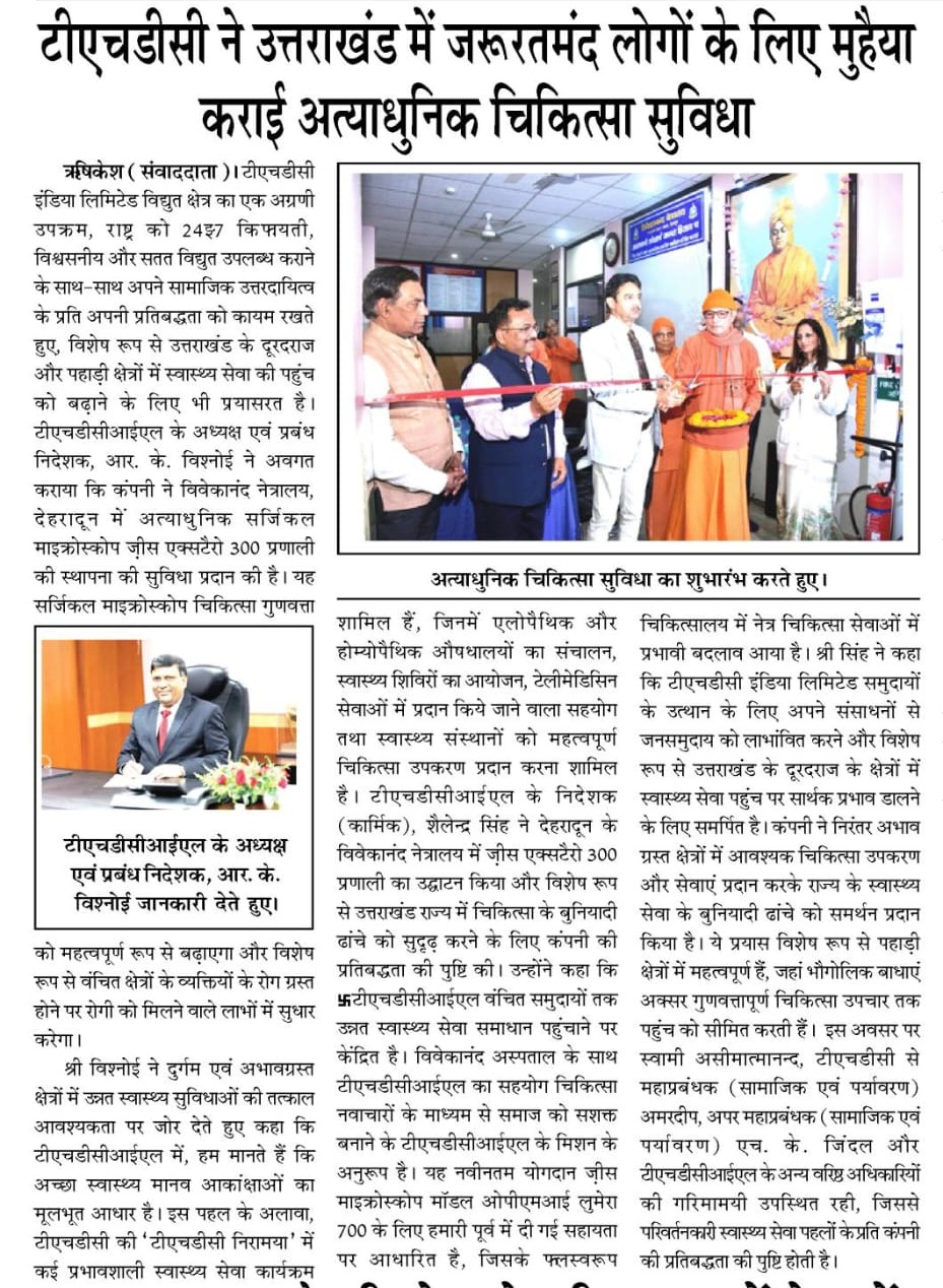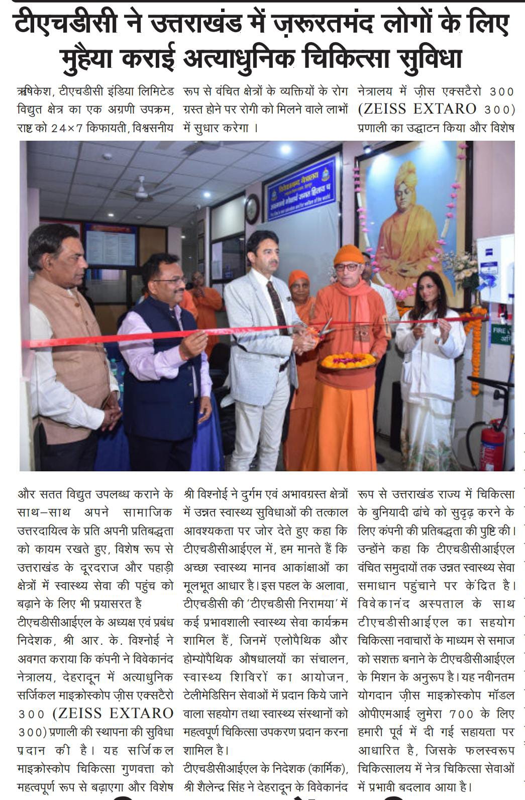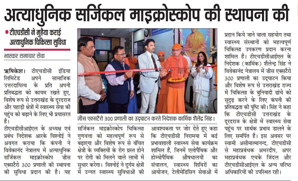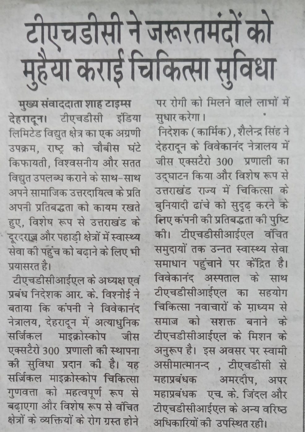 टीएचडीसीआईएल के निदेशक (कार्मिक), श्री शैलेन्द्र सिंह ने देहरादून के विवेकानंद नेत्रालय में ज़ीस एक्सटैरो 300 (ZEISS EXTARO 300) प्रणाली का उद्घाटन किया और विशेष रूप से उत्तराखंड राज्य में चिकित्सा के बुनियादी ढांचे को सुदृढ़ करने के लिए कंपनी की प्रतिबद्धता की पुष्टि की। उन्होंने कहा कि “टीएचडीसीआईएल वंचित समुदायों तक उन्नत स्वास्थ्य सेवा समाधान पहुंचाने पर केंद्रित है। विवेकानंद अस्पताल के साथ टीएचडीसीआईएल का सहयोग चिकित्सा नवाचारों के माध्यम से समाज को सशक्त बनाने के टीएचडीसीआईएल के मिशन के अनुरूप है। यह नवीनतम योगदान ज़ीस माइक्रोस्कोप मॉडल ओपीएमआई लुमेरा 700 के लिए हमारी पूर्व में दी गई सहायता पर आधारित है, जिसके फलस्वरूप चिकित्सालय में नेत्र चिकित्सा सेवाओं में प्रभावी बदलाव आया है।