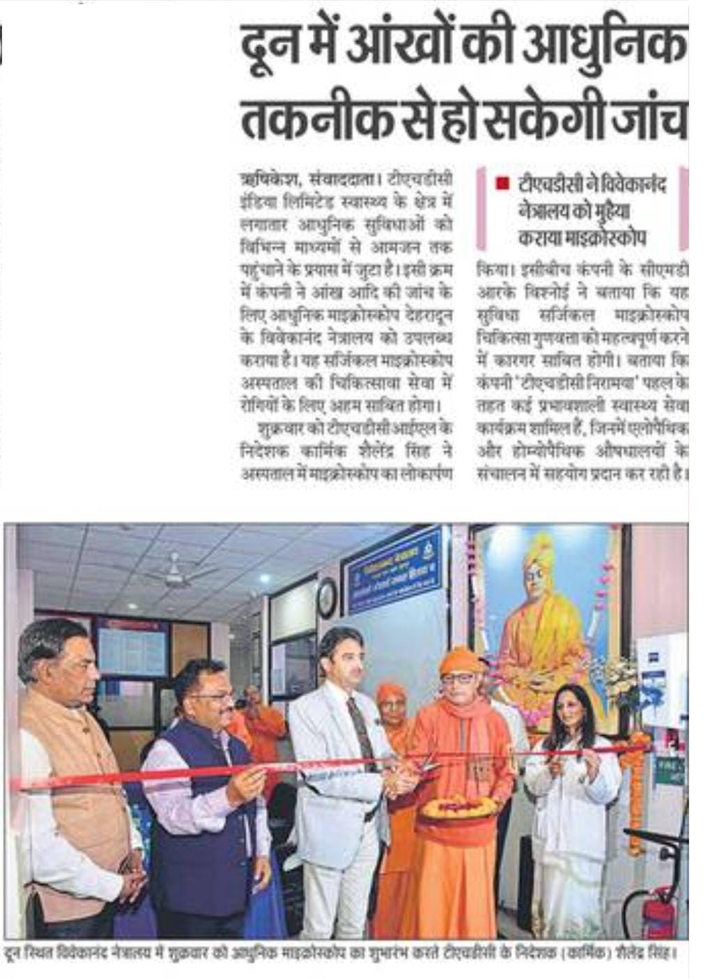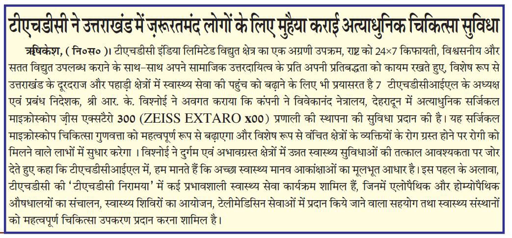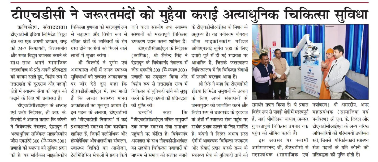 टीएचडीसीआईएल के अध्यक्ष एवं प्रबंध निदेशक, श्री आर. के. विश्नोई ने अवगत कराया कि कंपनी ने विवेकानंद नेत्रालय, देहरादून में अत्याधुनिक सर्जिकल माइक्रोस्कोप ज़ीस एक्सटैरो 300 (ZEISS EXTARO 300) प्रणाली की स्थापना की सुविधा प्रदान की है। यह सर्जिकल माइक्रोस्कोप चिकित्सा गुणवत्ता को महत्वपूर्ण रूप से बढ़ाएगा और विशेष रूप से वंचित क्षेत्रों के व्यक्तियों के रोग ग्रस्त होने पर रोगी को मिलने वाले लाभों में सुधार करेगा।