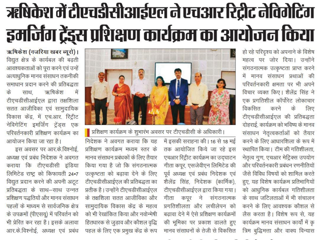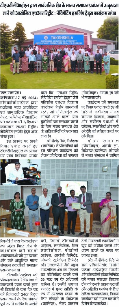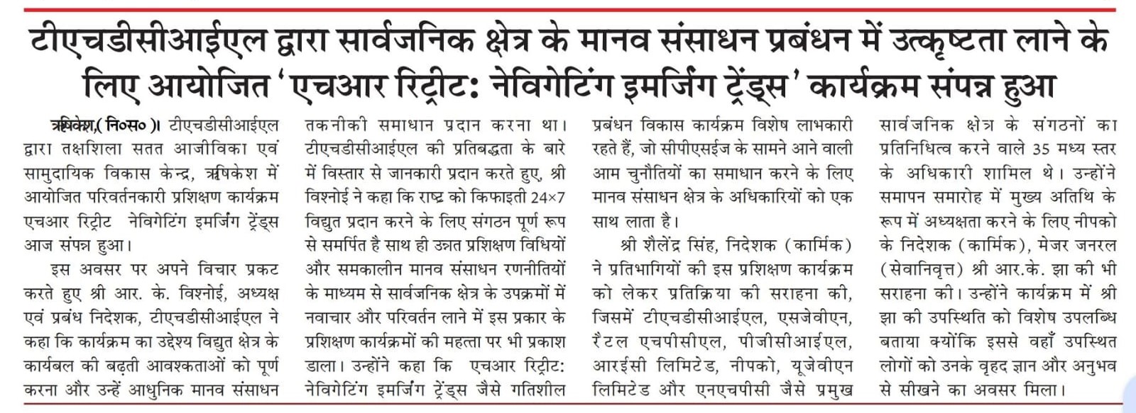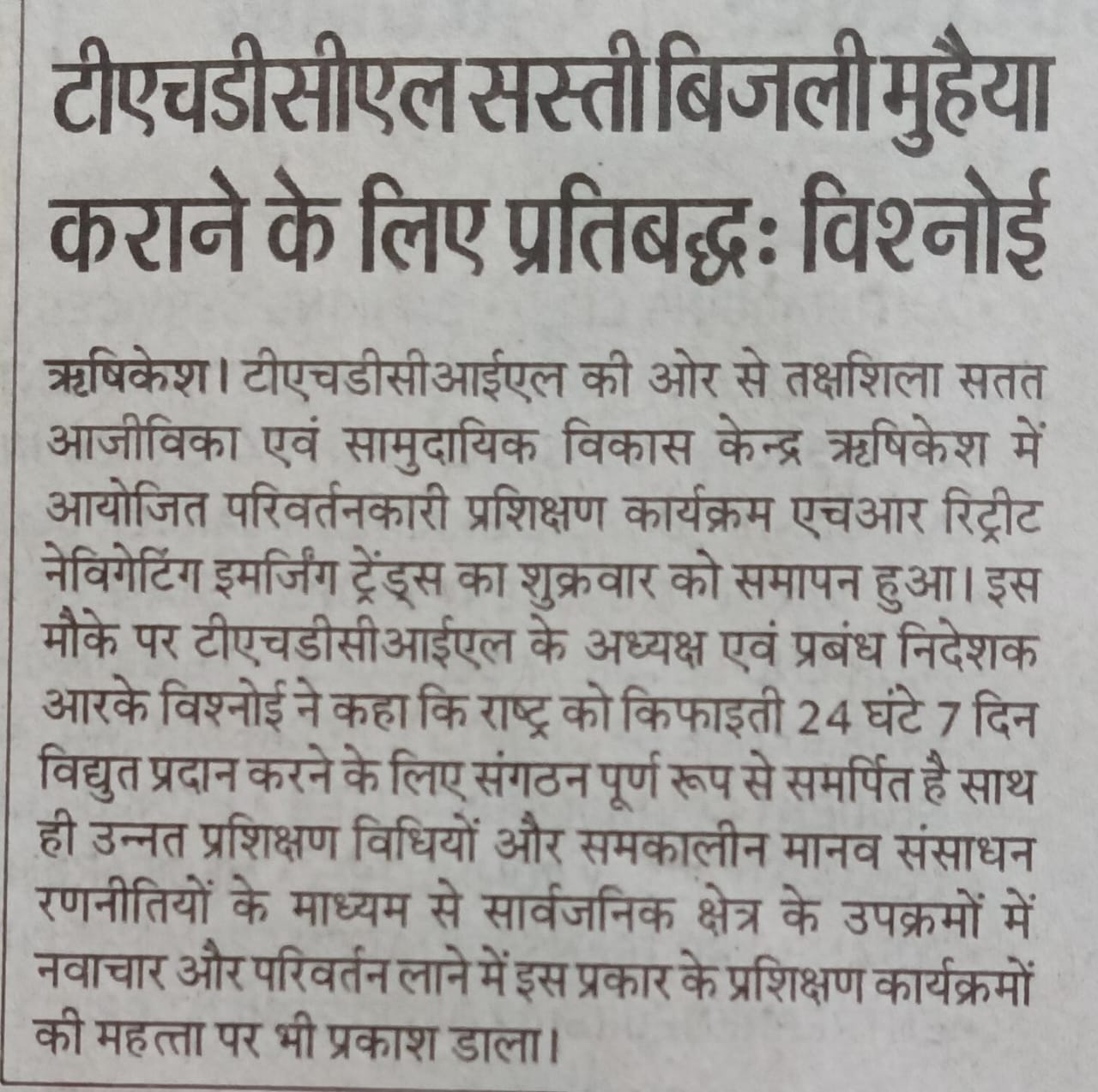 ऋषिकेश.17-05-2024: टीएचडीसीआईएल द्वारा तक्षशिला सतत आजीविका एवं सामुदायिक विकास केन्द्र, ऋषिकेश में आयोजित परिवर्तनकारी प्रशिक्षण कार्यक्रम एचआर रिट्रीट: नेविगेटिंग इमर्जिंग ट्रेंड्स आज संपन्न हुआ। इस अवसर पर अपने विचार प्रकट करते हुए श्री आर. के. विश्नोई, अध्यक्ष एवं प्रबंध निदेशक, टीएचडीसीआईएल ने कहा कि कार्यक्रम का उद्देश्य विद्युत क्षेत्र के कार्यबल की बढ़ती आवश्कताओं को पूर्ण करना और उन्हें आधुनिक मानव संसाधन तकनीकी समाधान प्रदान करना था।