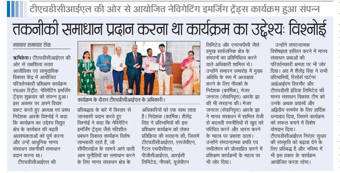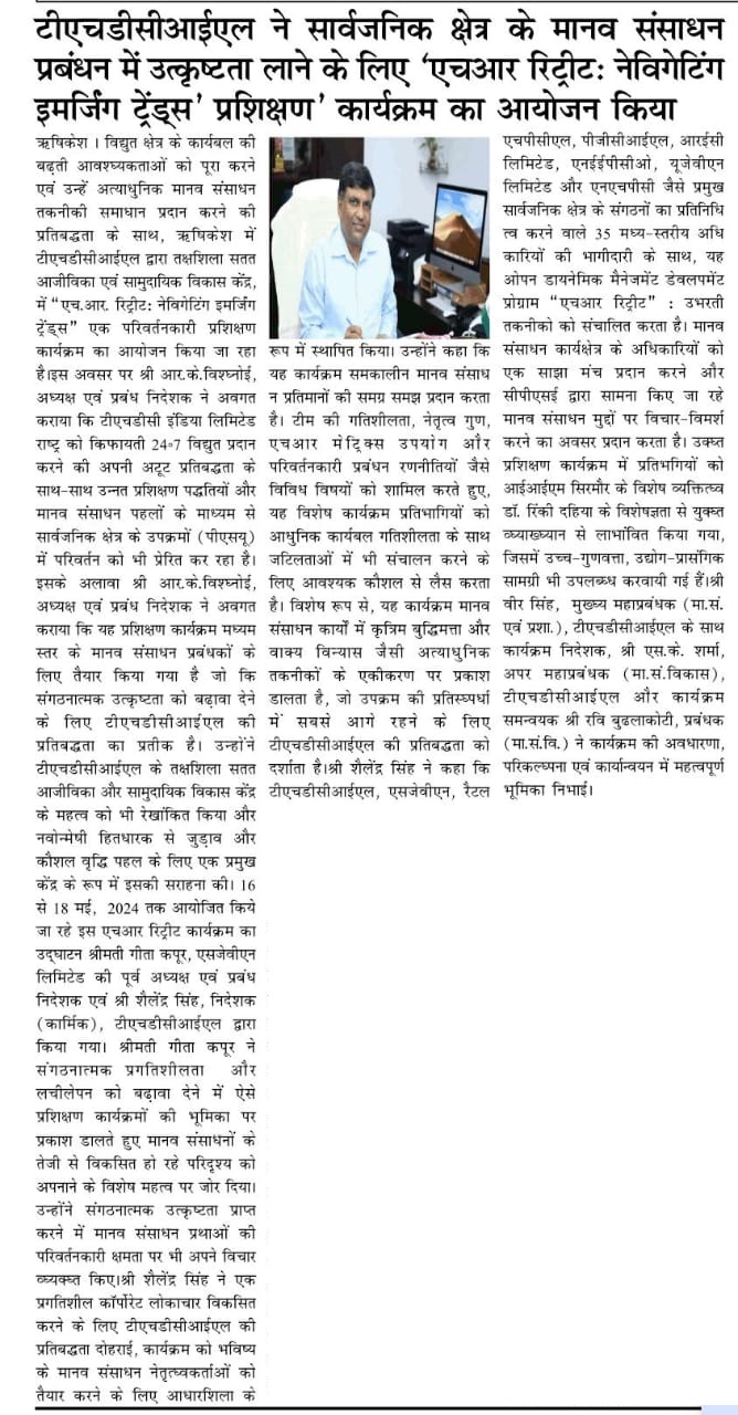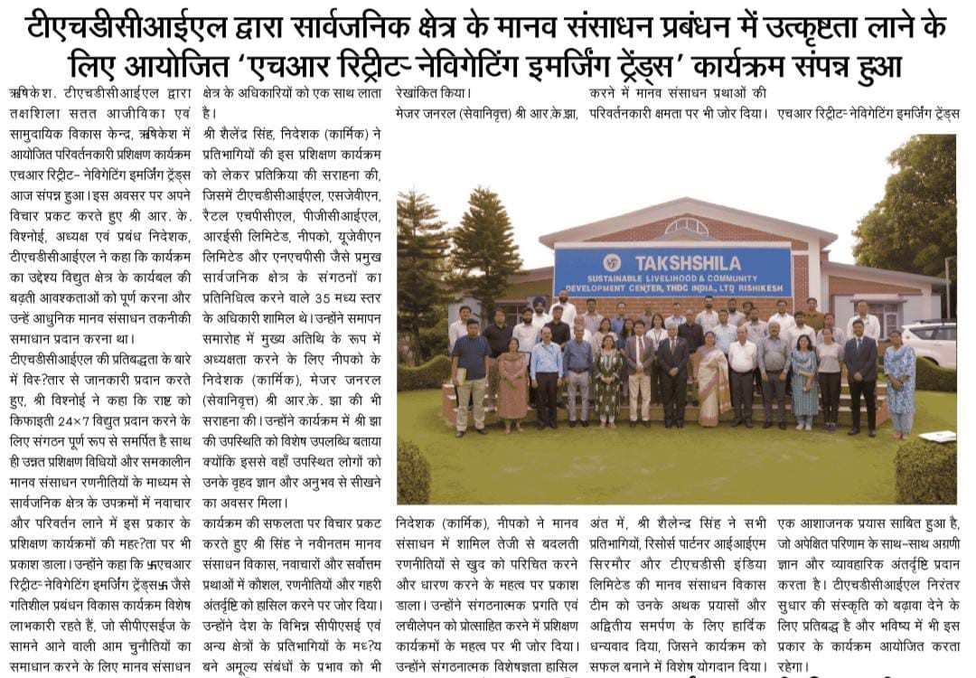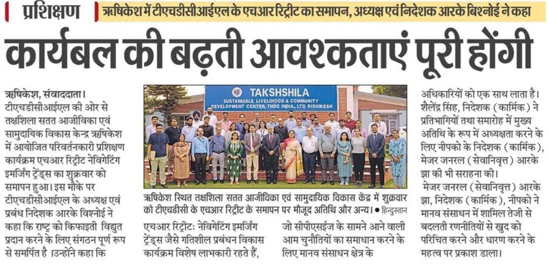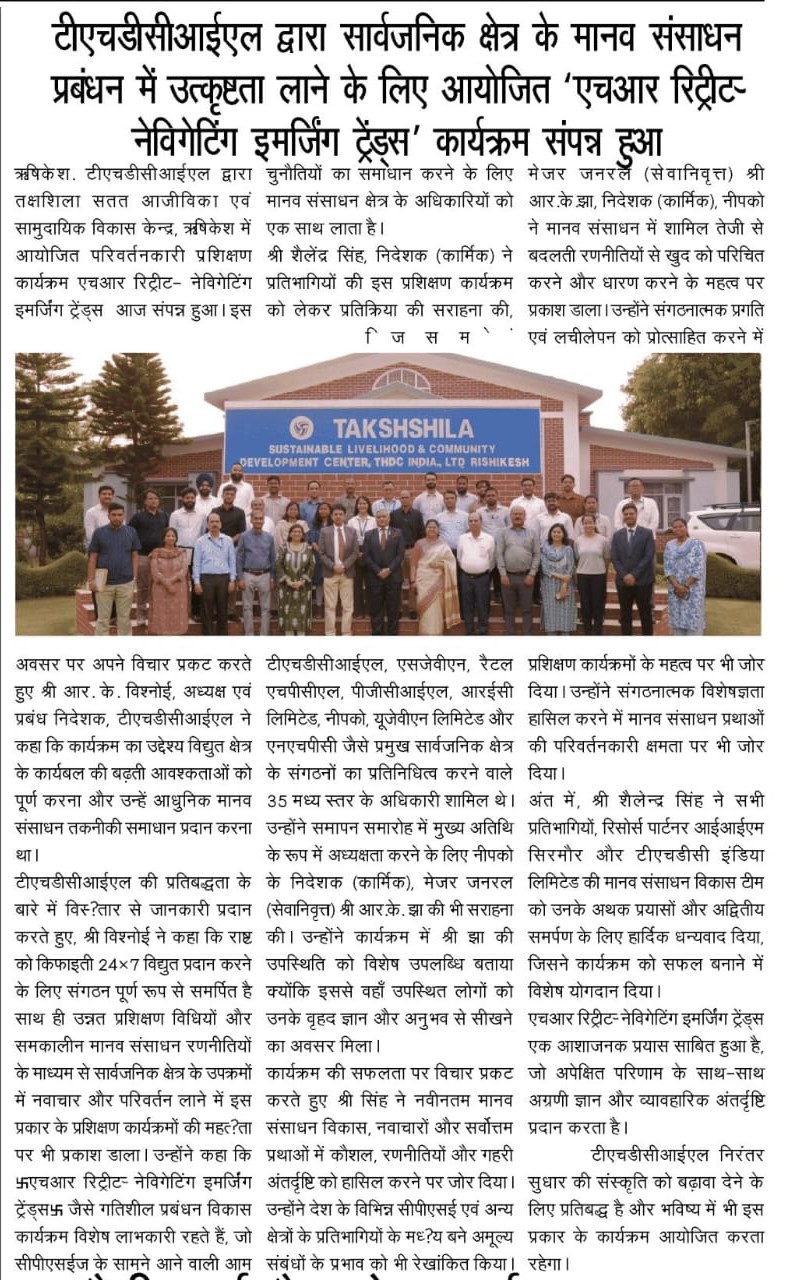 ऋषिकेश.17-05-2024: टीएचडीसीआईएल द्वारा तक्षशिला सतत आजीविका एवं सामुदायिक विकास केन्द्र, ऋषिकेश में आयोजित परिवर्तनकारी प्रशिक्षण कार्यक्रम एचआर रिट्रीट: नेविगेटिंग इमर्जिंग ट्रेंड्स आज संपन्न हुआ। इस अवसर पर अपने विचार प्रकट करते हुए श्री आर. के. विश्नोई, अध्यक्ष एवं प्रबंध निदेशक, टीएचडीसीआईएल ने कहा कि कार्यक्रम का उद्देश्य विद्युत क्षेत्र के कार्यबल की बढ़ती आवश्कताओं को पूर्ण करना और उन्हें आधुनिक मानव संसाधन तकनीकी समाधान प्रदान करना था।