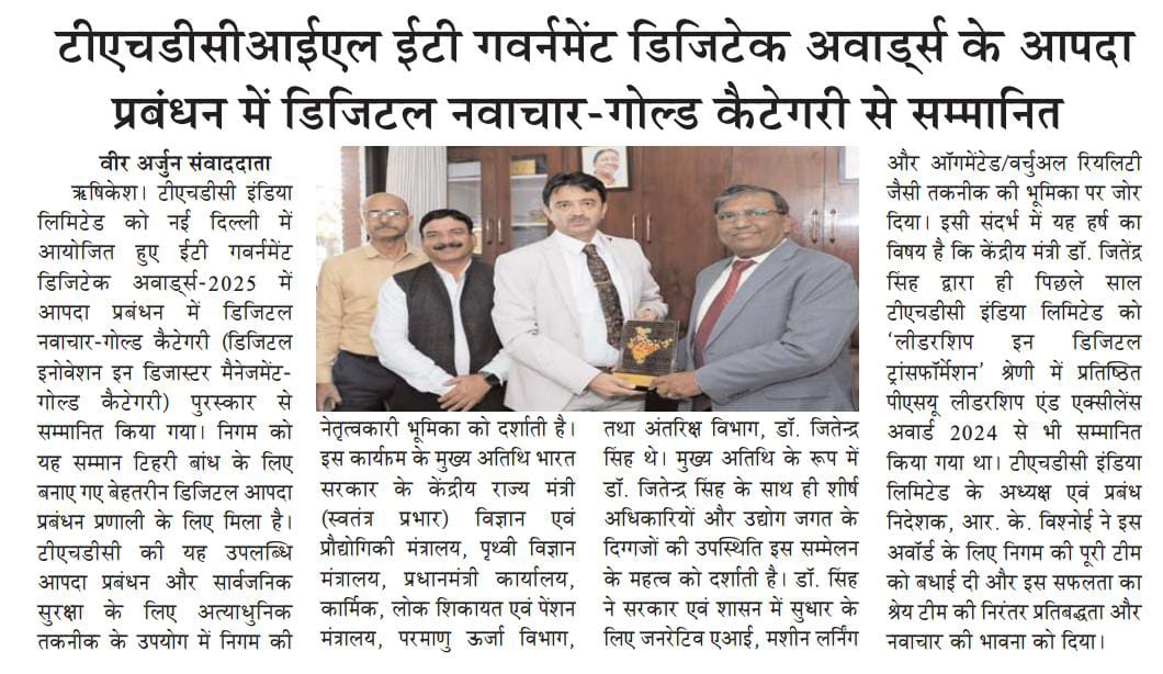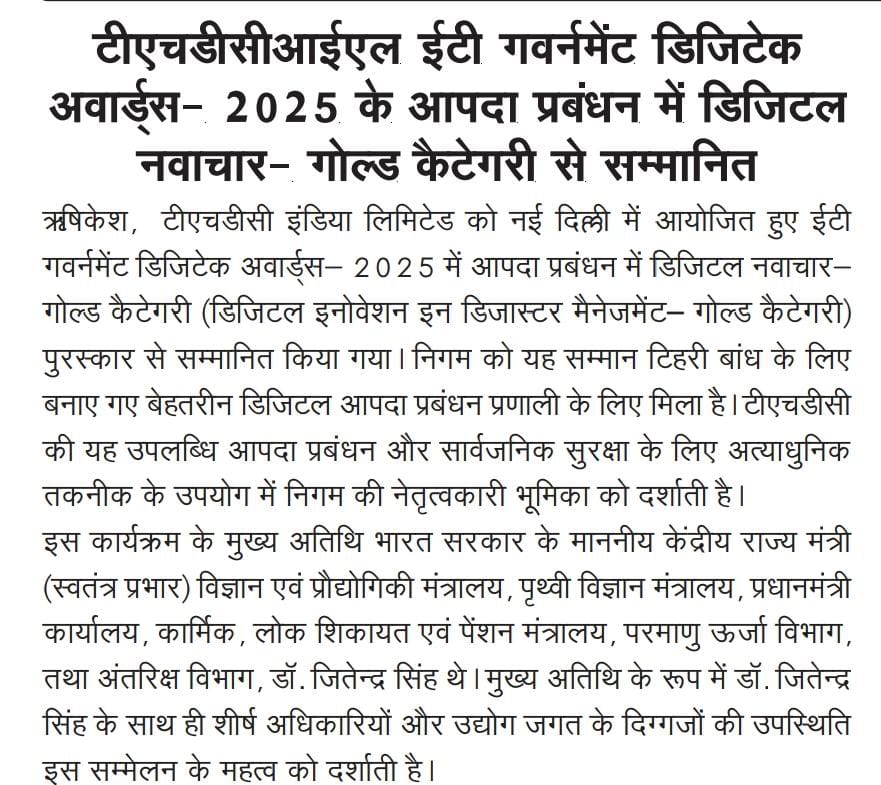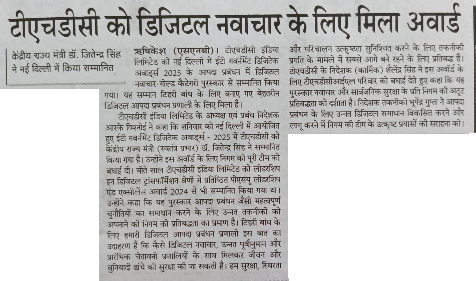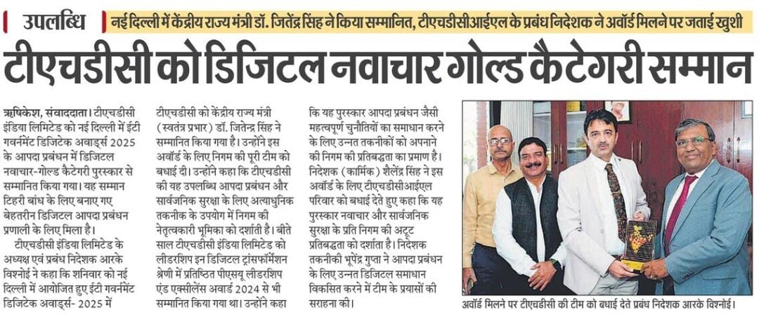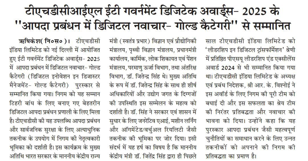 यह उल्लेखनीय है कि 18 मार्च, 2025 को नई दिल्ली स्थित हयात रीजेंसी में ईटी गवर्नमेंट डिजिटेक अवॉर्ड 2025 प्रदान किए गए, जहां टीएचडीसी को डिजिटल डिजास्टर रेजिलिएंस और सार्वजनिक सुरक्षा में उत्कृष्ट योगदान के लिए सम्मानित किया गया।