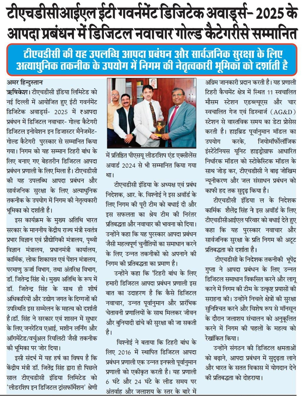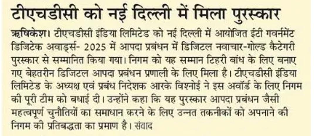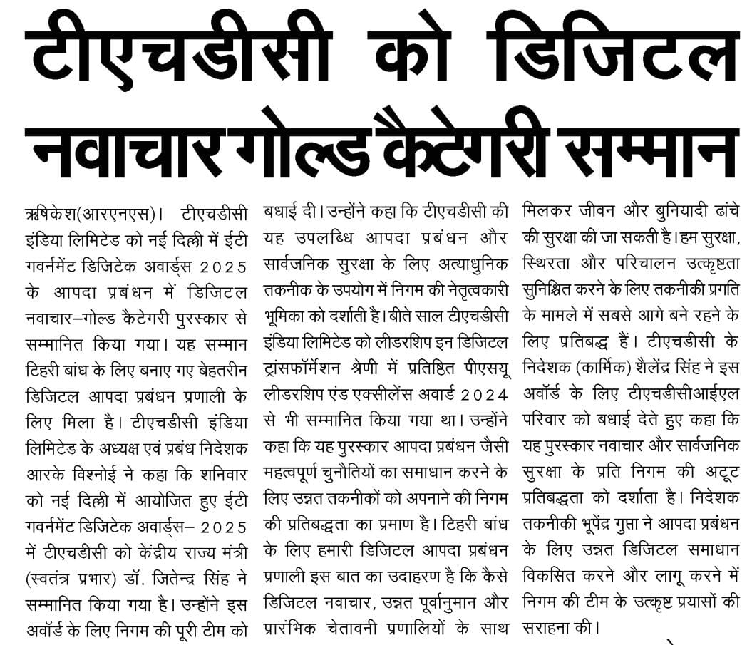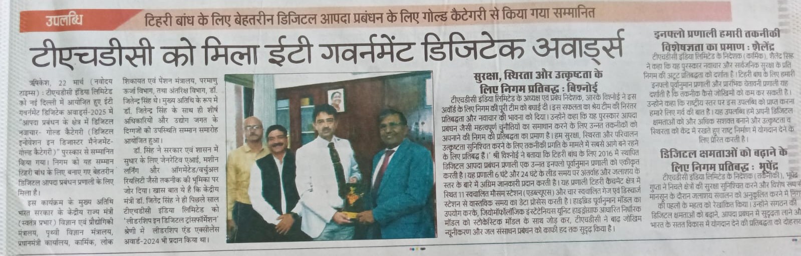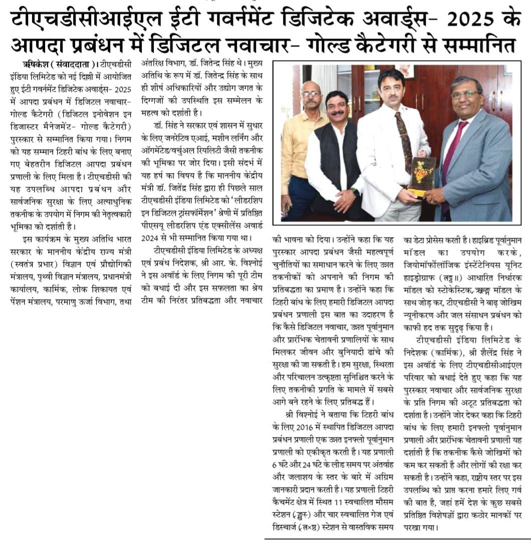 यह उल्लेखनीय है कि 18 मार्च, 2025 को नई दिल्ली स्थित हयात रीजेंसी में ईटी गवर्नमेंट डिजिटेक अवॉर्ड 2025 प्रदान किए गए, जहां टीएचडीसी को डिजिटल डिजास्टर रेजिलिएंस और सार्वजनिक सुरक्षा में उत्कृष्ट योगदान के लिए सम्मानित किया गया।