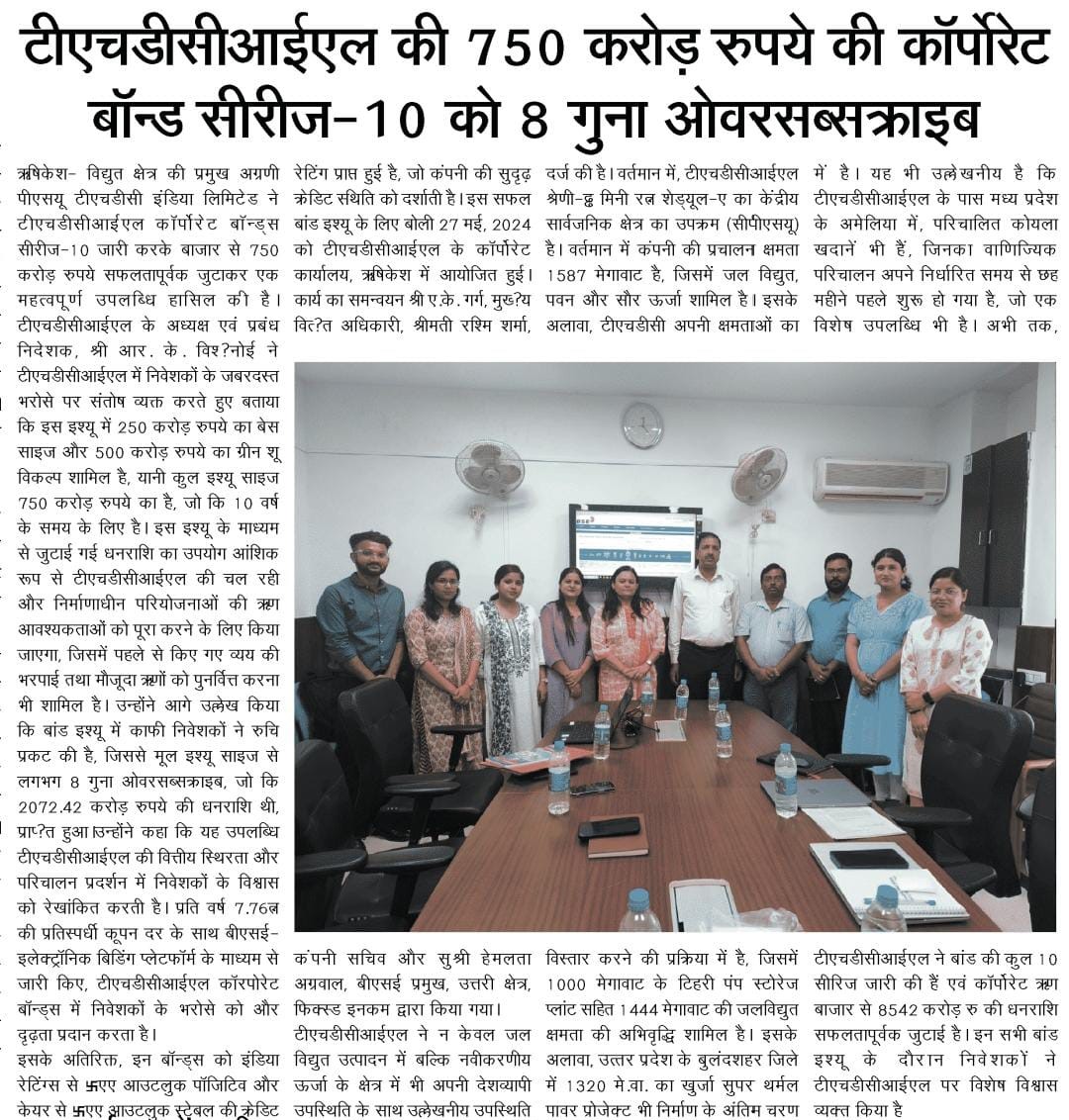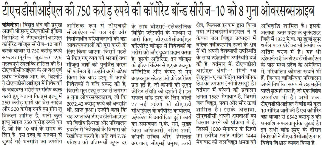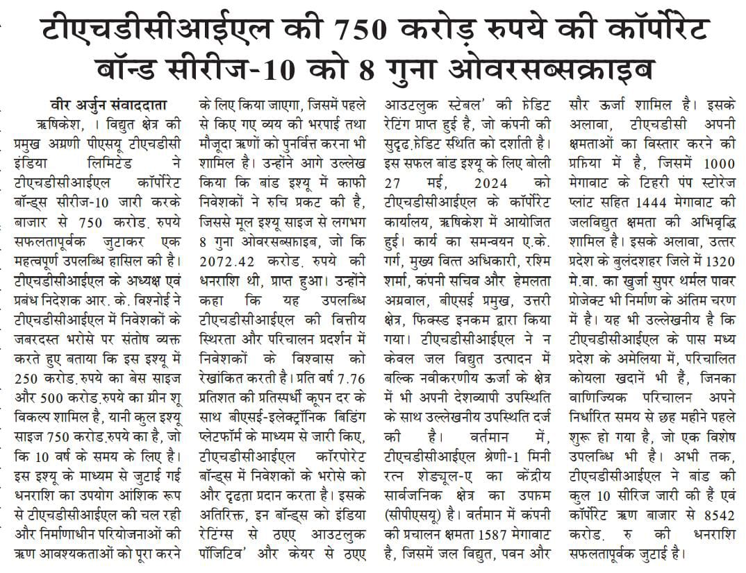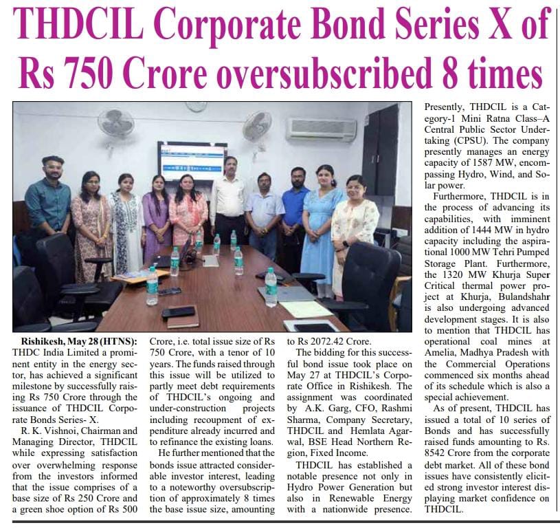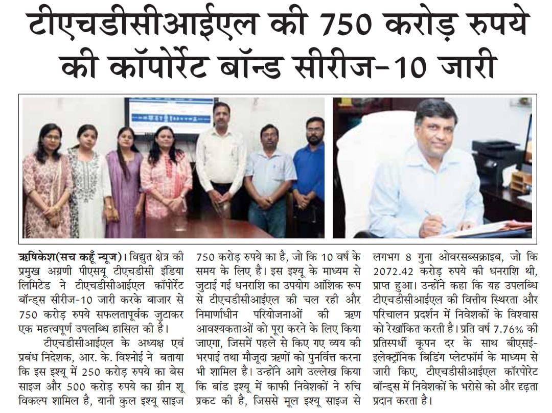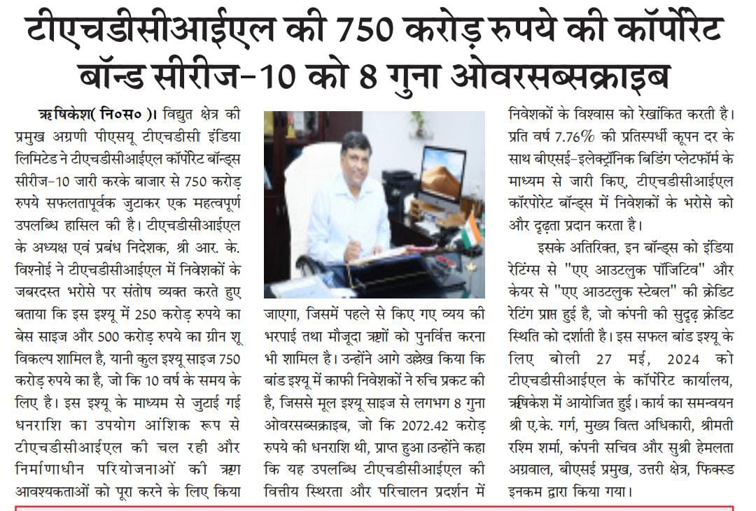 ऋषि.28-05-2024: – विद्युत क्षेत्र की प्रमुख अग्रणी पीएसयू टीएचडीसी इंडिया लिमिटेड ने टीएचडीसीआईएल कॉर्पोरेट बॉन्ड्स सीरीज-10 जारी करके बाजार से 750 करोड़ रुपये सफलतापूर्वक जुटाकर एक महत्वपूर्ण उपलब्धि हासिल की है। टीएचडीसीआईएल के अध्यक्ष एवं प्रबंध निदेशक, श्री आर. के. विश्नोई ने टीएचडीसीआईएल में निवेशकों के जबरदस्त भरोसे पर संतोष व्यक्त करते हुए बताया कि इस इश्यू में 250 करोड़ रुपये का बेस साइज और 500 करोड़ रुपये का ग्रीन शू विकल्प शामिल है, यानी कुल इश्यू साइज 750 करोड़ रुपये का है, जो कि 10 वर्ष के समय के लिए है। इस इश्यू के माध्यम से जुटाई गई धनराशि का उपयोग आंशिक रूप से टीएचडीसीआईएल की चल रही और निर्माणाधीन परियोजनाओं की ऋण आवश्यकताओं को पूरा करने के लिए किया जाएगा, जिसमें पहले से किए गए व्यय की भरपाई तथा मौजूदा ऋणों को पुनर्वित्त करना भी शामिल है। उन्होंने आगे उल्लेख किया कि बांड इश्यू में काफी निवेशकों ने रुचि प्रकट की है, जिससे मूल इश्यू साइज से लगभग 8 गुना ओवरसब्सक्राइब, जो कि 2072.42 करोड़ रुपये की धनराशि थी, प्राप्त हुआ।उन्होंने कहा कि यह उपलब्धि टीएचडीसीआईएल की वित्तीय स्थिरता और परिचालन प्रदर्शन में निवेशकों के विश्वास को रेखांकित करती है। प्रति वर्ष 7.76% की प्रतिस्पर्धी कूपन दर के साथ बीएसई-इलेक्ट्रॉनिक बिडिंग प्लेटफॉर्म के माध्यम से जारी किए, टीएचडीसीआईएल कॉरपोरेट बॉन्ड्स में निवेशकों के भरोसे को और दृढ़ता प्रदान करता है।