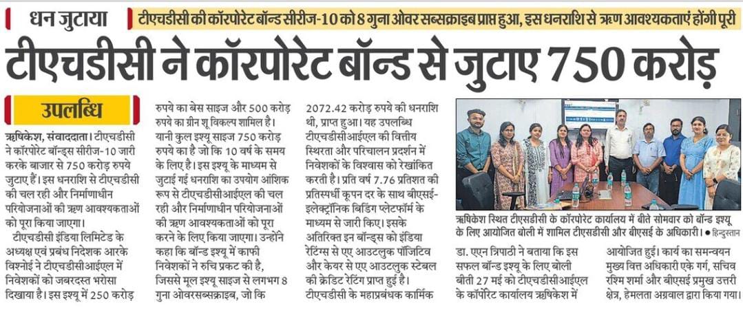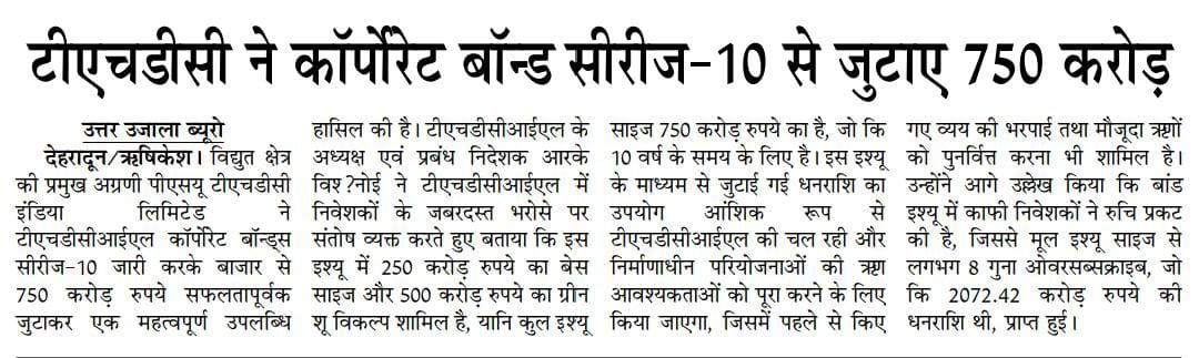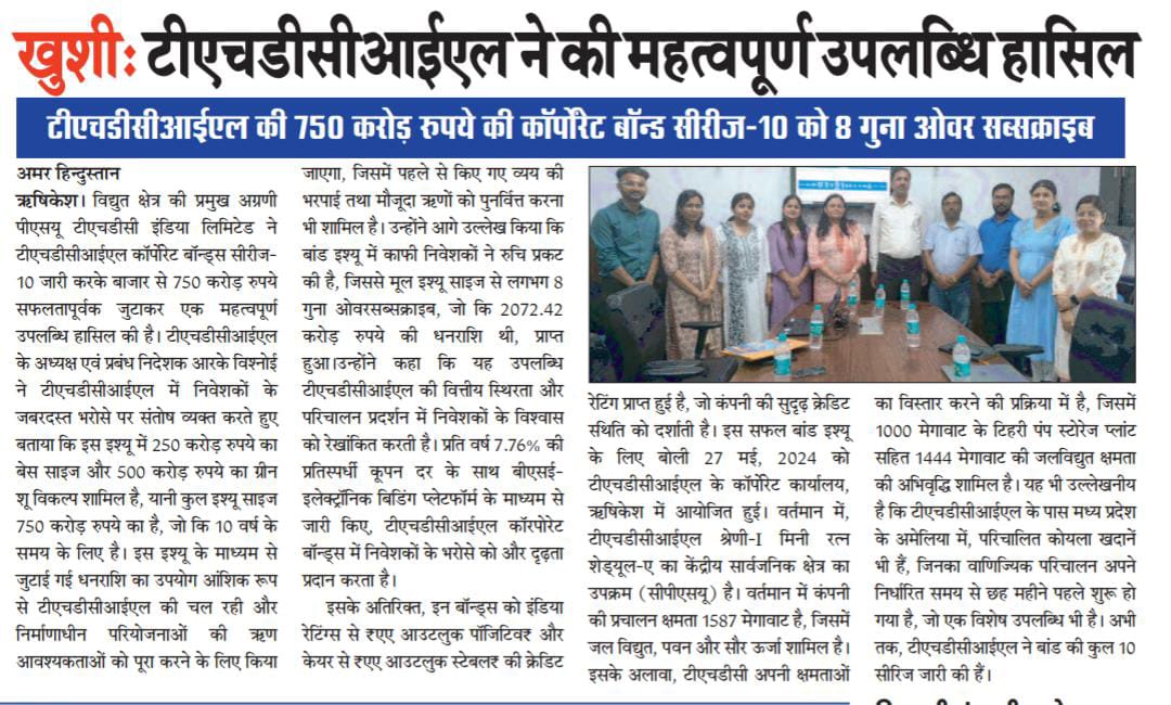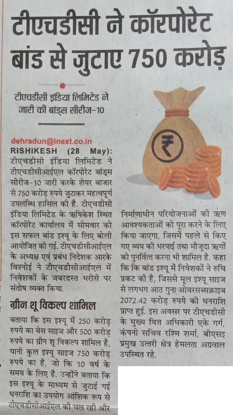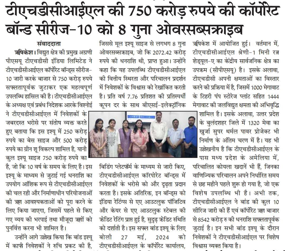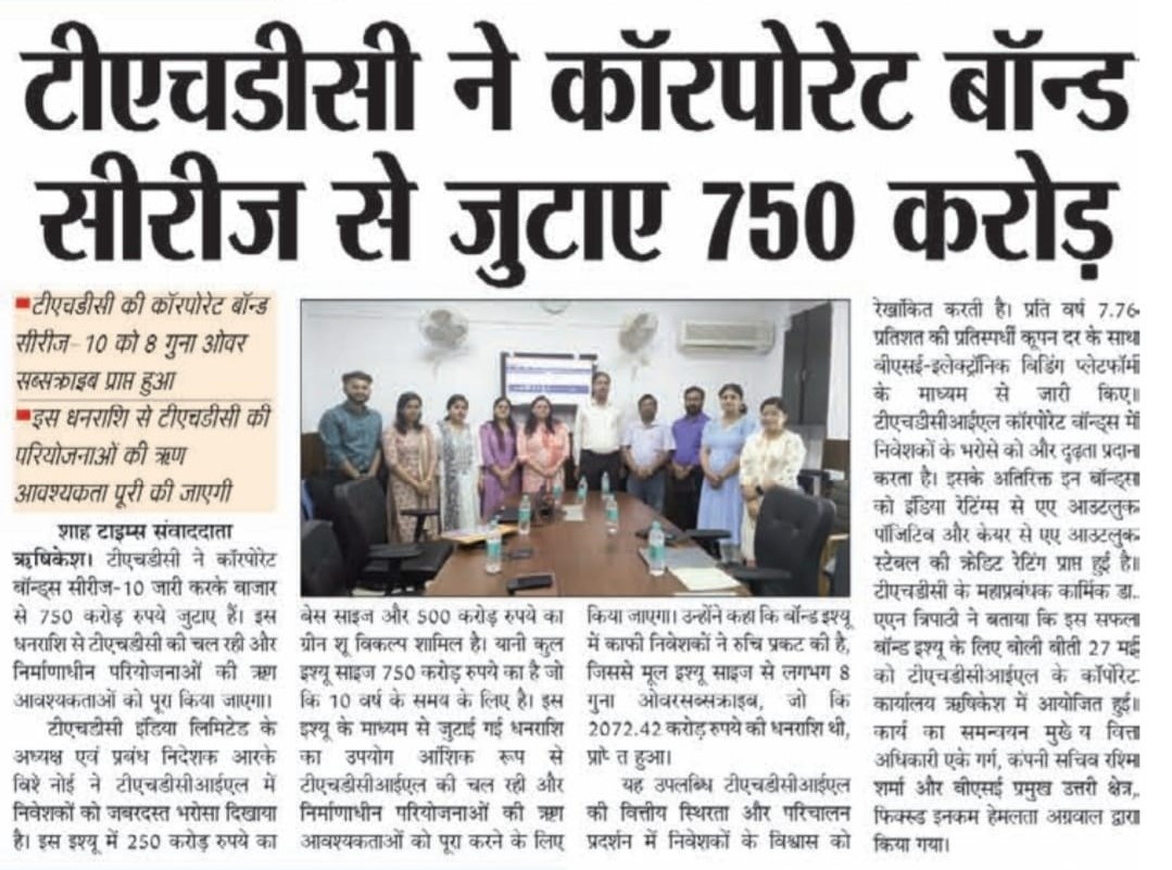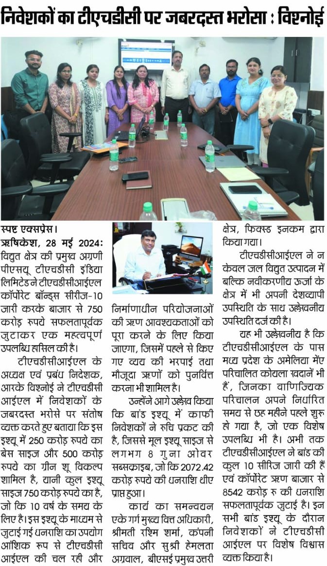 ऋषि.28-05-2024: – विद्युत क्षेत्र की प्रमुख अग्रणी पीएसयू टीएचडीसी इंडिया लिमिटेड ने टीएचडीसीआईएल कॉर्पोरेट बॉन्ड्स सीरीज-10 जारी करके बाजार से 750 करोड़ रुपये सफलतापूर्वक जुटाकर एक महत्वपूर्ण उपलब्धि हासिल की है। टीएचडीसीआईएल के अध्यक्ष एवं प्रबंध निदेशक, श्री आर. के. विश्नोई ने टीएचडीसीआईएल में निवेशकों के जबरदस्त भरोसे पर संतोष व्यक्त करते हुए बताया कि इस इश्यू में 250 करोड़ रुपये का बेस साइज और 500 करोड़ रुपये का ग्रीन शू विकल्प शामिल है, यानी कुल इश्यू साइज 750 करोड़ रुपये का है, जो कि 10 वर्ष के समय के लिए है। इस इश्यू के माध्यम से जुटाई गई धनराशि का उपयोग आंशिक रूप से टीएचडीसीआईएल की चल रही और निर्माणाधीन परियोजनाओं की ऋण आवश्यकताओं को पूरा करने के लिए किया जाएगा, जिसमें पहले से किए गए व्यय की भरपाई तथा मौजूदा ऋणों को पुनर्वित्त करना भी शामिल है। उन्होंने आगे उल्लेख किया कि बांड इश्यू में काफी निवेशकों ने रुचि प्रकट की है, जिससे मूल इश्यू साइज से लगभग 8 गुना ओवरसब्सक्राइब, जो कि 2072.42 करोड़ रुपये की धनराशि थी, प्राप्त हुआ।उन्होंने कहा कि यह उपलब्धि टीएचडीसीआईएल की वित्तीय स्थिरता और परिचालन प्रदर्शन में निवेशकों के विश्वास को रेखांकित करती है। प्रति वर्ष 7.76% की प्रतिस्पर्धी कूपन दर के साथ बीएसई-इलेक्ट्रॉनिक बिडिंग प्लेटफॉर्म के माध्यम से जारी किए, टीएचडीसीआईएल कॉरपोरेट बॉन्ड्स में निवेशकों के भरोसे को और दृढ़ता प्रदान करता है।
