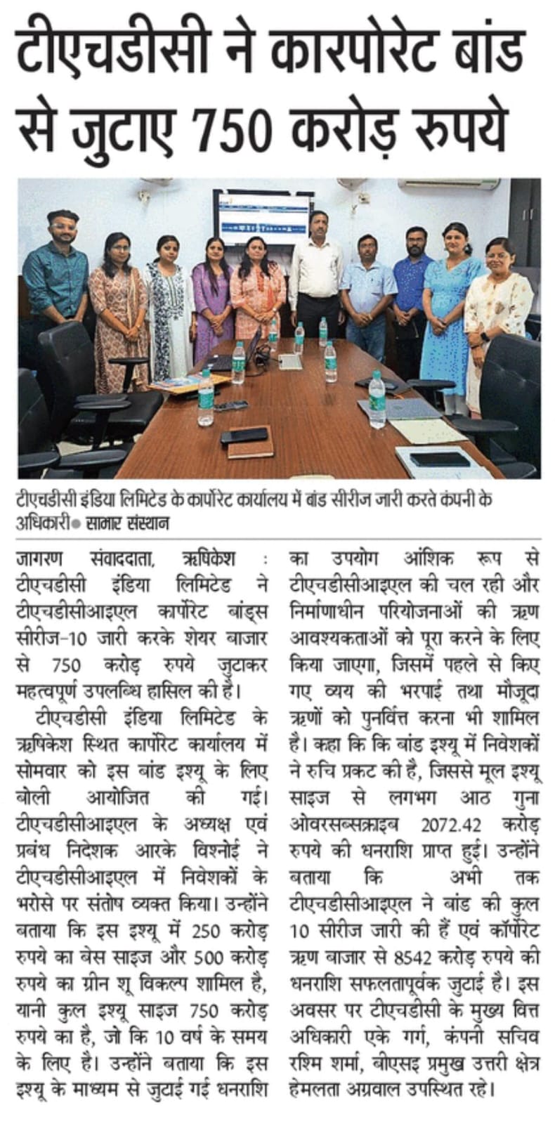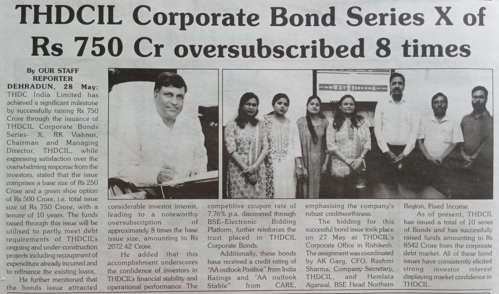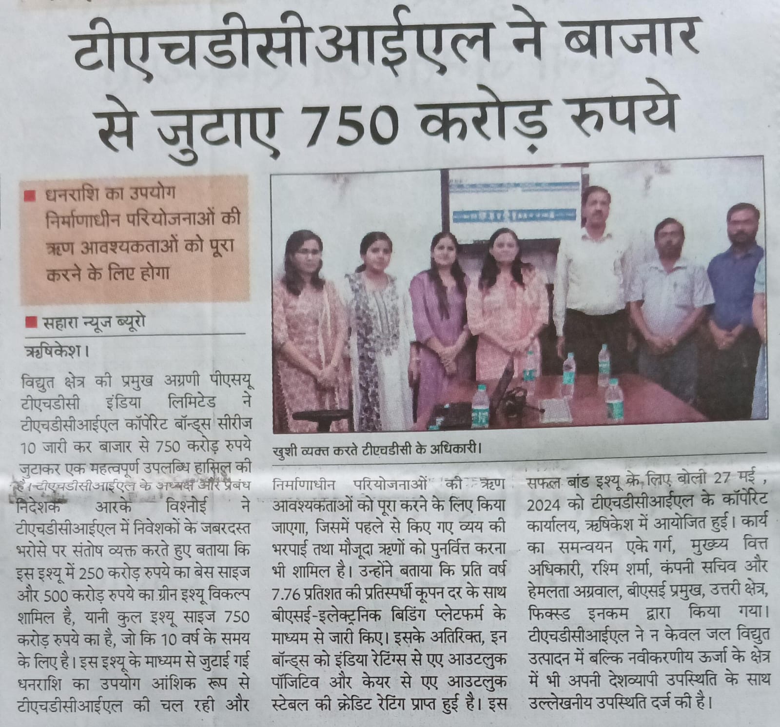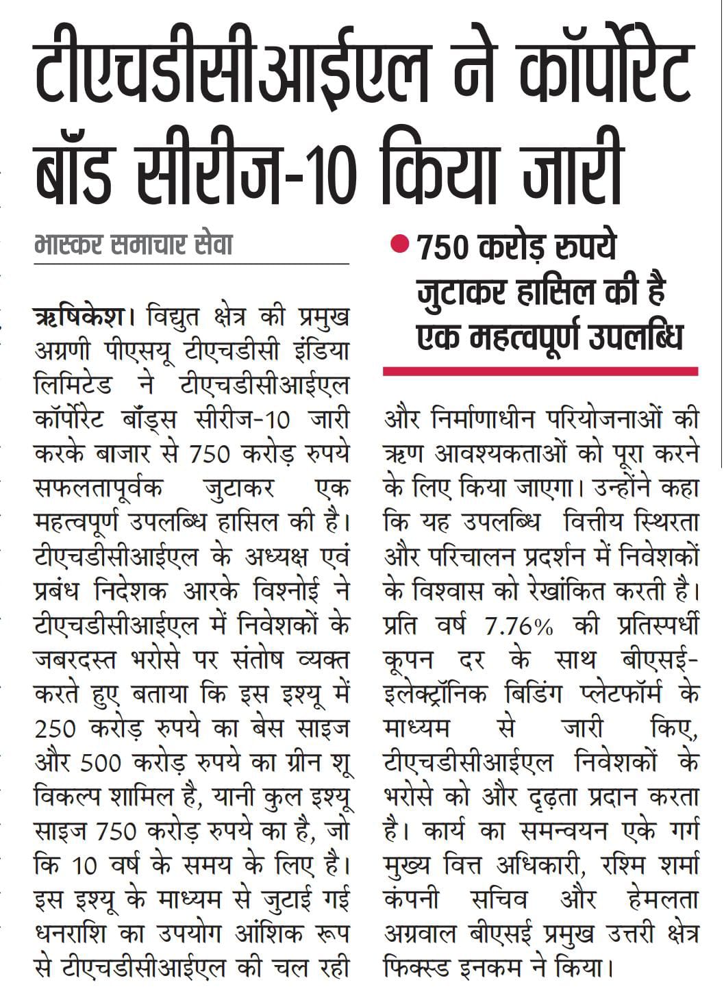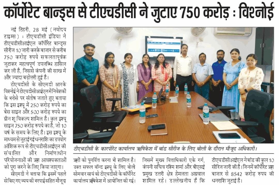 ऋषि.28-05-2024: – विद्युत क्षेत्र की प्रमुख अग्रणी पीएसयू टीएचडीसी इंडिया लिमिटेड ने टीएचडीसीआईएल कॉर्पोरेट बॉन्ड्स सीरीज-10 जारी करके बाजार से 750 करोड़ रुपये सफलतापूर्वक जुटाकर एक महत्वपूर्ण उपलब्धि हासिल की है। टीएचडीसीआईएल के अध्यक्ष एवं प्रबंध निदेशक, श्री आर. के. विश्नोई ने टीएचडीसीआईएल में निवेशकों के जबरदस्त भरोसे पर संतोष व्यक्त करते हुए बताया कि इस इश्यू में 250 करोड़ रुपये का बेस साइज और 500 करोड़ रुपये का ग्रीन शू विकल्प शामिल है, यानी कुल इश्यू साइज 750 करोड़ रुपये का है, जो कि 10 वर्ष के समय के लिए है। इस इश्यू के माध्यम से जुटाई गई धनराशि का उपयोग आंशिक रूप से टीएचडीसीआईएल की चल रही और निर्माणाधीन परियोजनाओं की ऋण आवश्यकताओं को पूरा करने के लिए किया जाएगा, जिसमें पहले से किए गए व्यय की भरपाई तथा मौजूदा ऋणों को पुनर्वित्त करना भी शामिल है। उन्होंने आगे उल्लेख किया कि बांड इश्यू में काफी निवेशकों ने रुचि प्रकट की है, जिससे मूल इश्यू साइज से लगभग 8 गुना ओवरसब्सक्राइब, जो कि 2072.42 करोड़ रुपये की धनराशि थी, प्राप्त हुआ।उन्होंने कहा कि यह उपलब्धि टीएचडीसीआईएल की वित्तीय स्थिरता और परिचालन प्रदर्शन में निवेशकों के विश्वास को रेखांकित करती है। प्रति वर्ष 7.76% की प्रतिस्पर्धी कूपन दर के साथ बीएसई-इलेक्ट्रॉनिक बिडिंग प्लेटफॉर्म के माध्यम से जारी किए, टीएचडीसीआईएल कॉरपोरेट बॉन्ड्स में निवेशकों के भरोसे को और दृढ़ता प्रदान करता है।