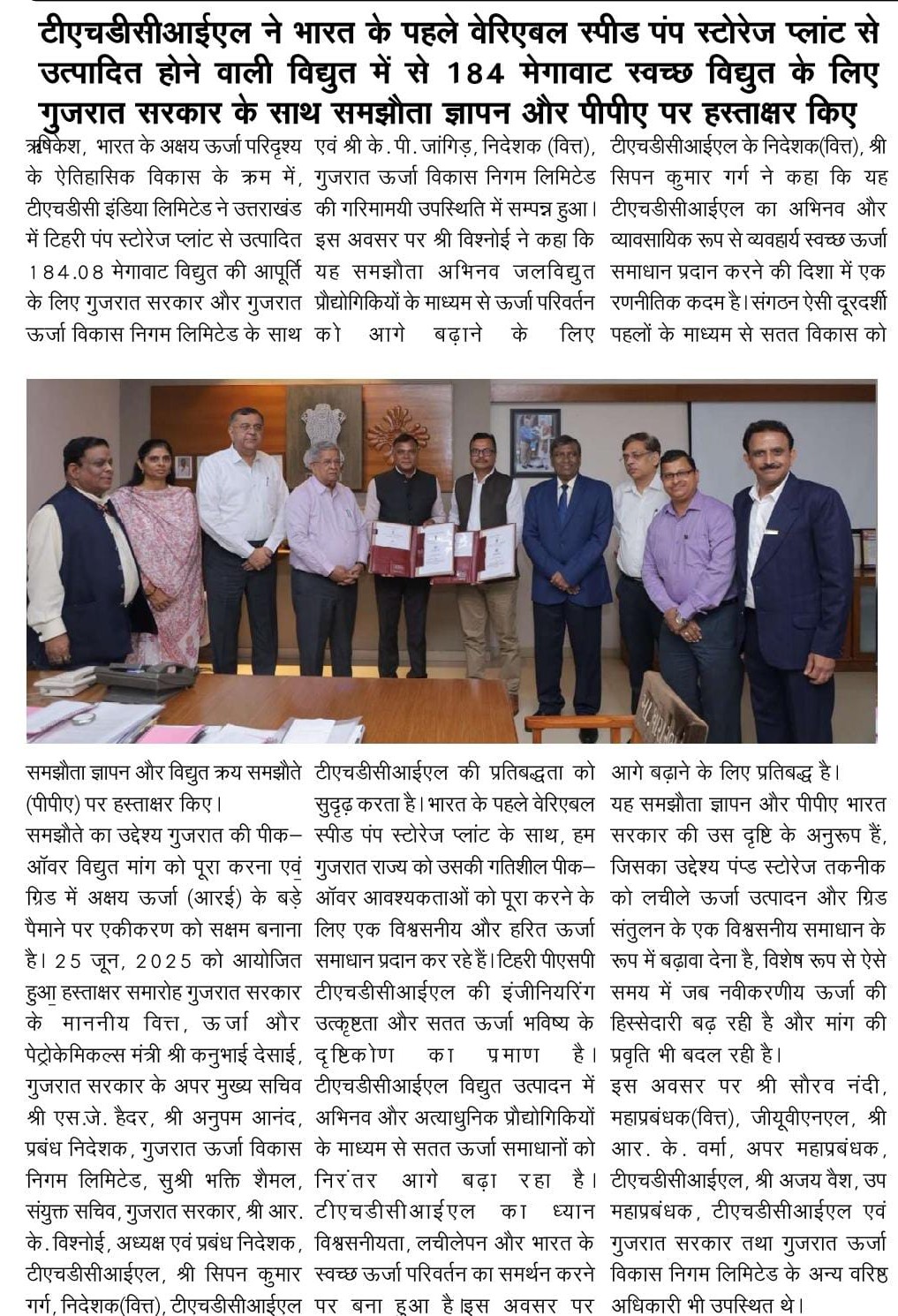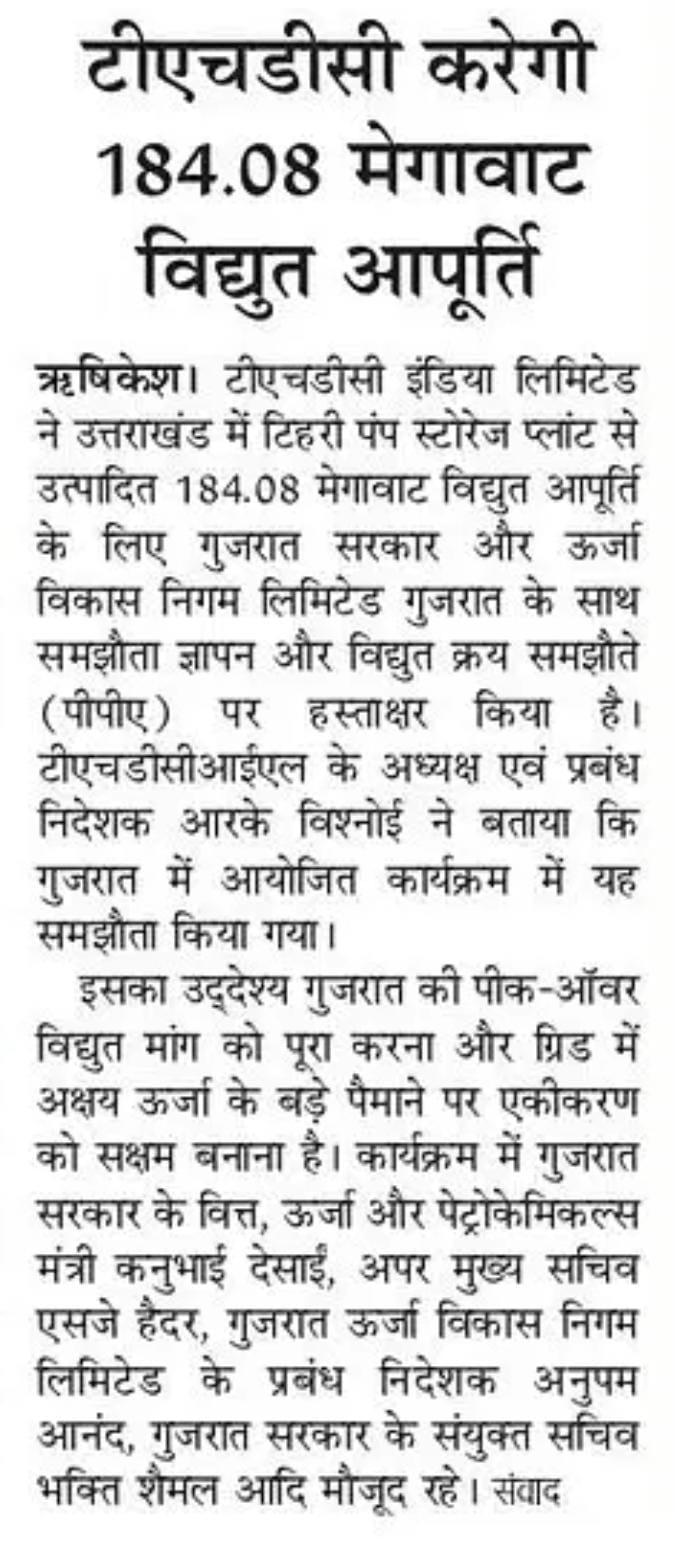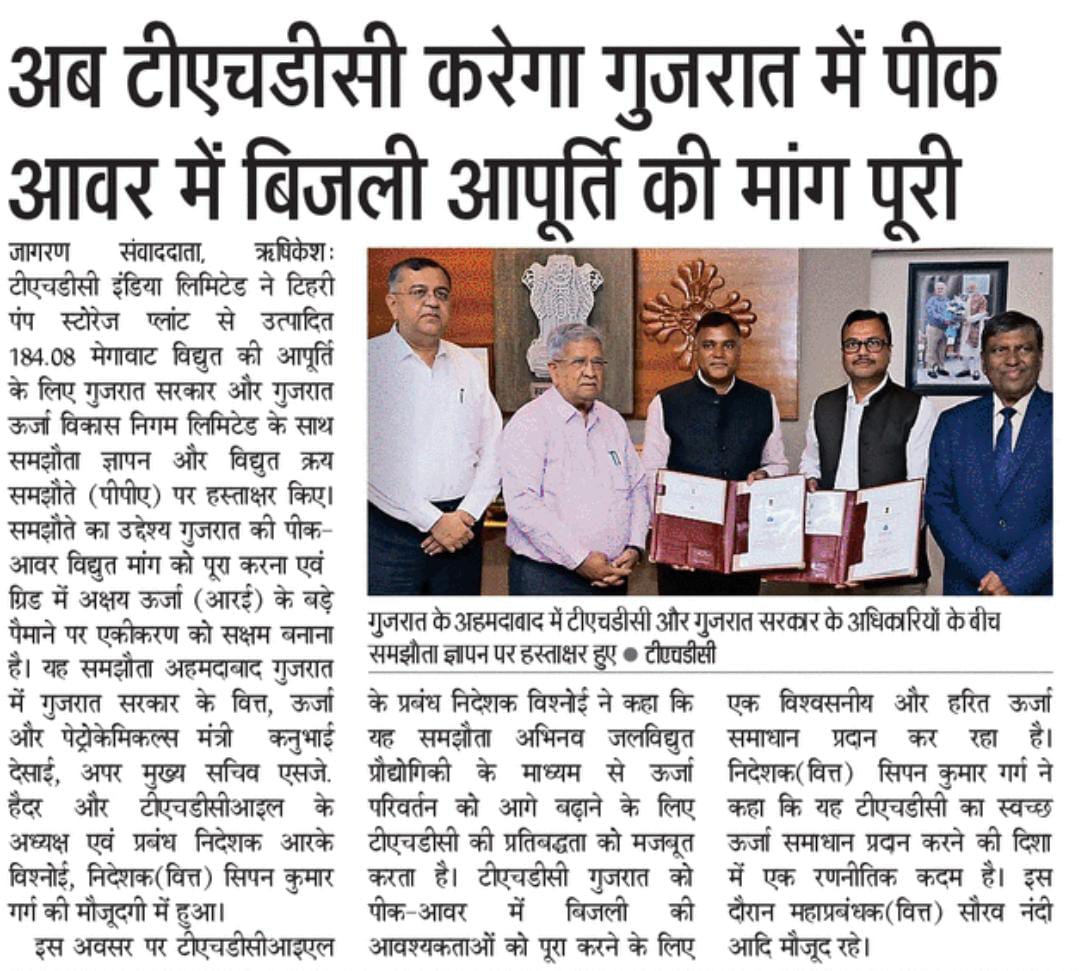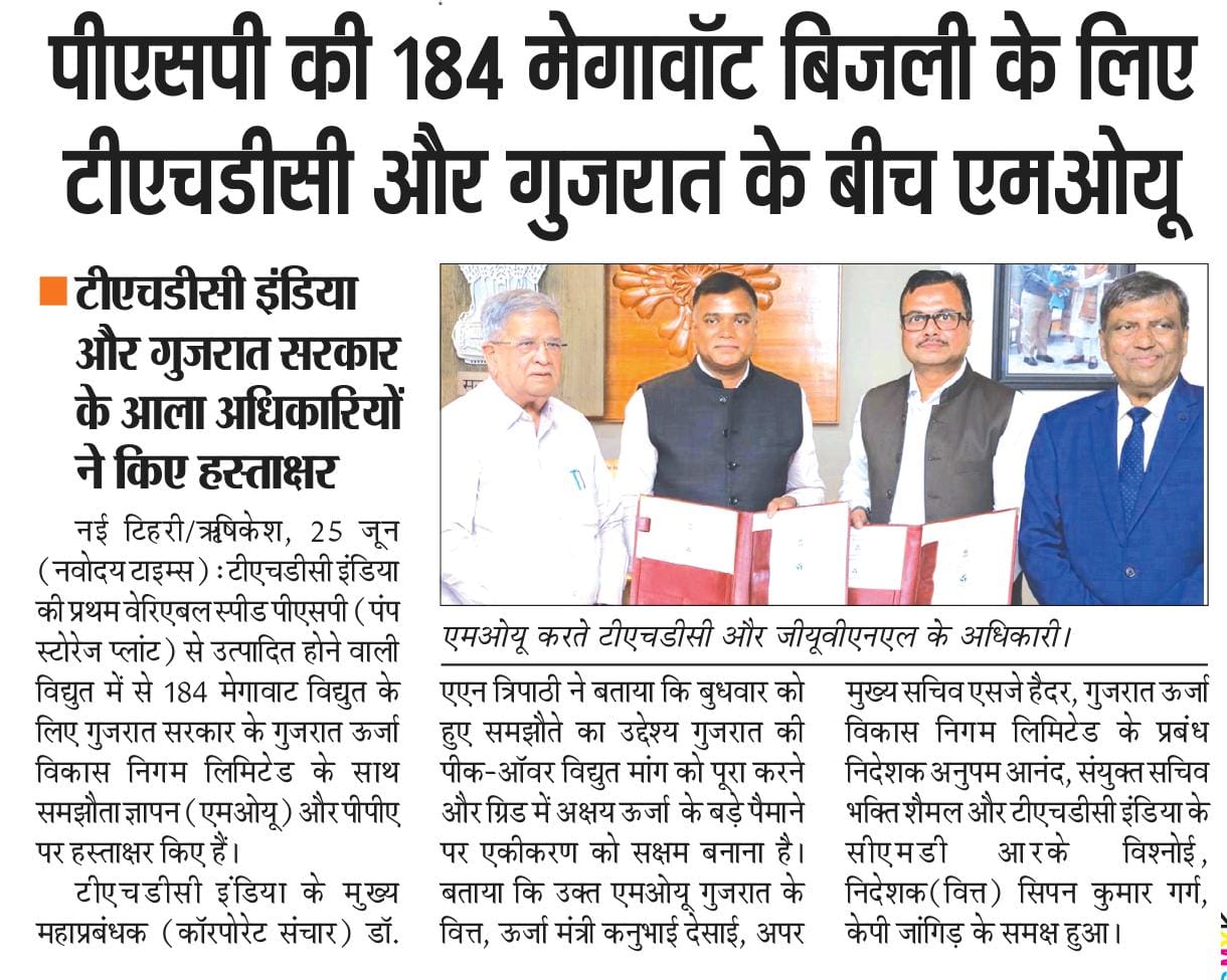 ऋषिकेश, 25-06-2025: भारत के अक्षय ऊर्जा परिदृश्य के ऐतिहासिक विकास के क्रम में, टीएचडीसी इंडिया लिमिटेड ने उत्तराखंड में टिहरी पंप स्टोरेज प्लांट से उत्पादित 184.08 मेगावाट विद्युत की आपूर्ति के लिए गुजरात सरकार और गुजरात ऊर्जा विकास निगम लिमिटेड के साथ समझौता ज्ञापन और विद्युत क्रय समझौते (पीपीए) पर हस्ताक्षर किए।