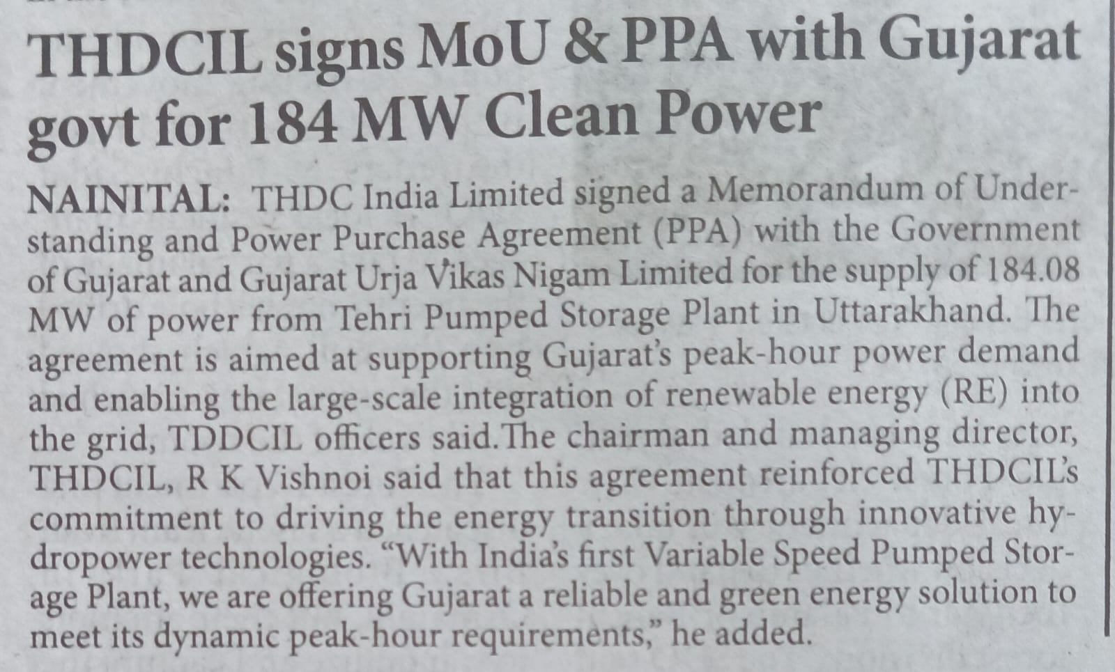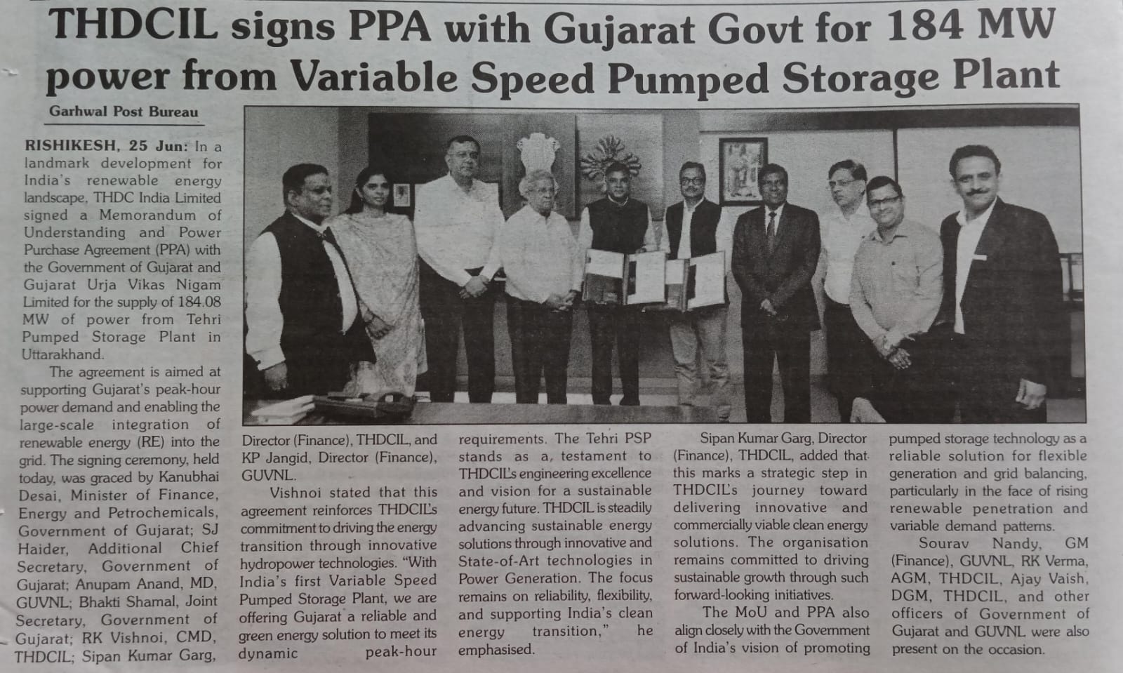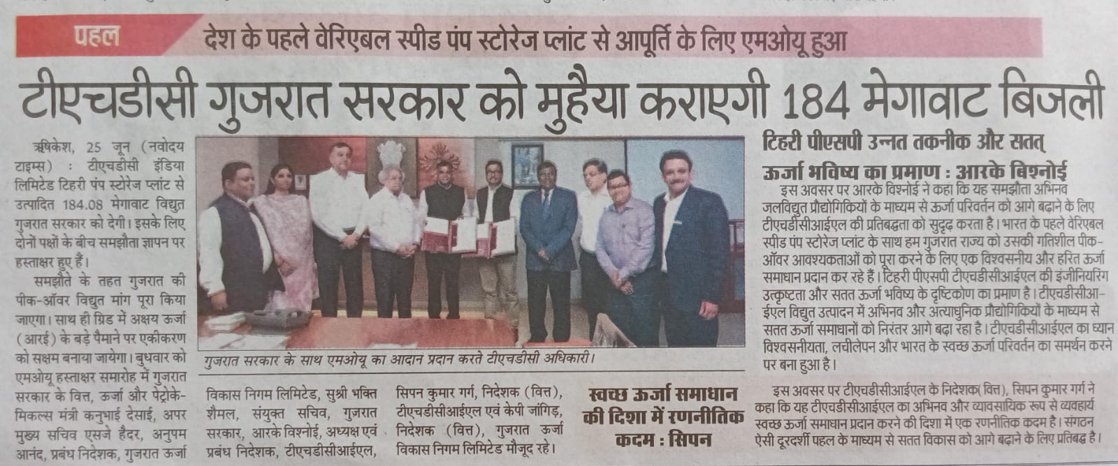 ऋषिकेश, 25-06-2025: भारत के अक्षय ऊर्जा परिदृश्य के ऐतिहासिक विकास के क्रम में, टीएचडीसी इंडिया लिमिटेड ने उत्तराखंड में टिहरी पंप स्टोरेज प्लांट से उत्पादित 184.08 मेगावाट विद्युत की आपूर्ति के लिए गुजरात सरकार और गुजरात ऊर्जा विकास निगम लिमिटेड के साथ समझौता ज्ञापन और विद्युत क्रय समझौते (पीपीए) पर हस्ताक्षर किए।