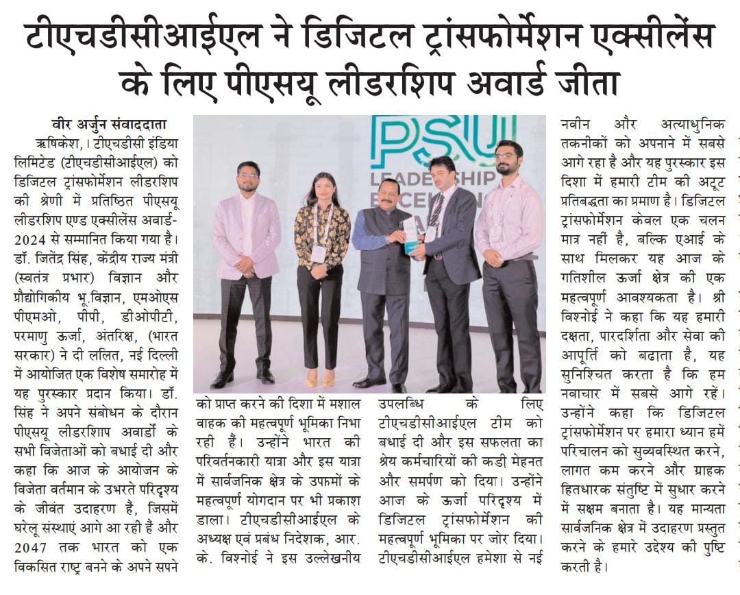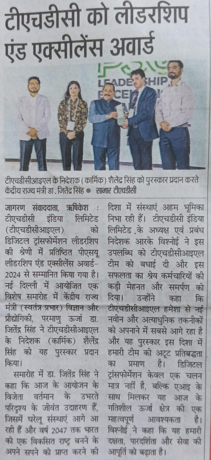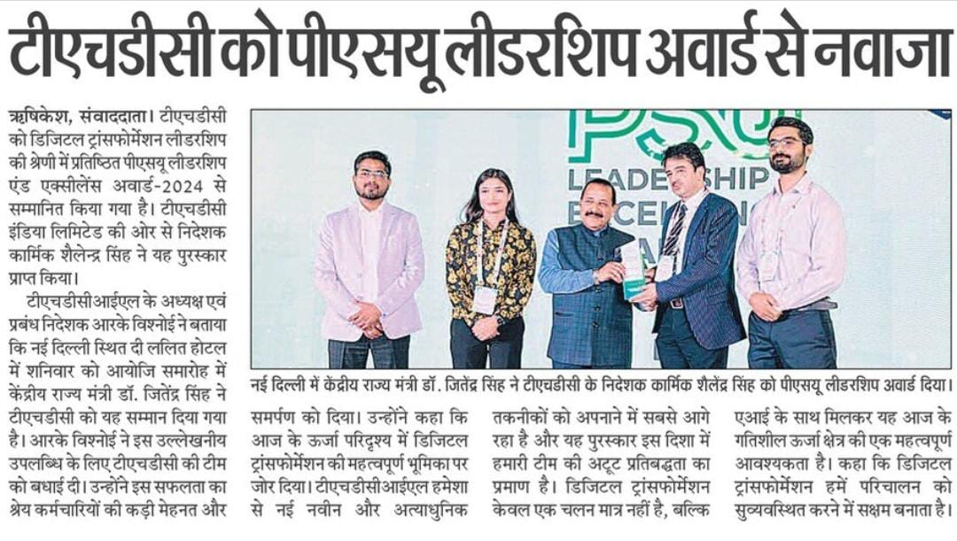 ऋषिकेश, 22 जून, 2024: टीएचडीसी इंडिया लिमिटेड (टीएचडीसीआईएल) को डिजिटल ट्रांसफोर्मेशन लीडरशिप की श्रेणी में प्रतिष्ठित पीएसयू लीडरशिप एण्ड एक्सीलेंस अवार्ड-2024 से सम्मानित किया गया है। डॉ. जितेंद्र सिंह, माननीय केंद्रीय राज्य मंत्री (स्वतंत्र प्रभार) विज्ञान और प्रौद्योगिकी; भू.विज्ञान, एमओएस पीएमओ, पीपी/डीओपीटी, परमाणु ऊर्जा, अंतरिक्ष, (भारत सरकार) ने दी ललित, नई दिल्ली में आयोजित एक विशेष समारोह में यह पुरस्कार प्रदान किया। डॉ. सिंह ने अपने संबोधन के दौरान पीएसयू लीडरशिाप अवार्डों के सभी विजेताओं को बधाई दी और कहा कि आज के आयोजन के विजेता वर्तमान के उभरते परिदृश्य के जीवंत उदाहरण हैं, जिसमें घरेलू संस्थाएं आगे आ रही हैं और 2047 तक भारत को एक विकसित राष्ट्र बनने के अपने सपने को प्राप्त करने की दिशा में मशाल वाहक की महत्वपूर्ण भूमिका निभा रही हैं। उन्होंने भारत की परिवर्तनकारी यात्रा और इस यात्रा में सार्वजनिक क्षेत्र के उपक्रमों के महत्वपूर्ण योगदान पर भी प्रकाश डाला।
