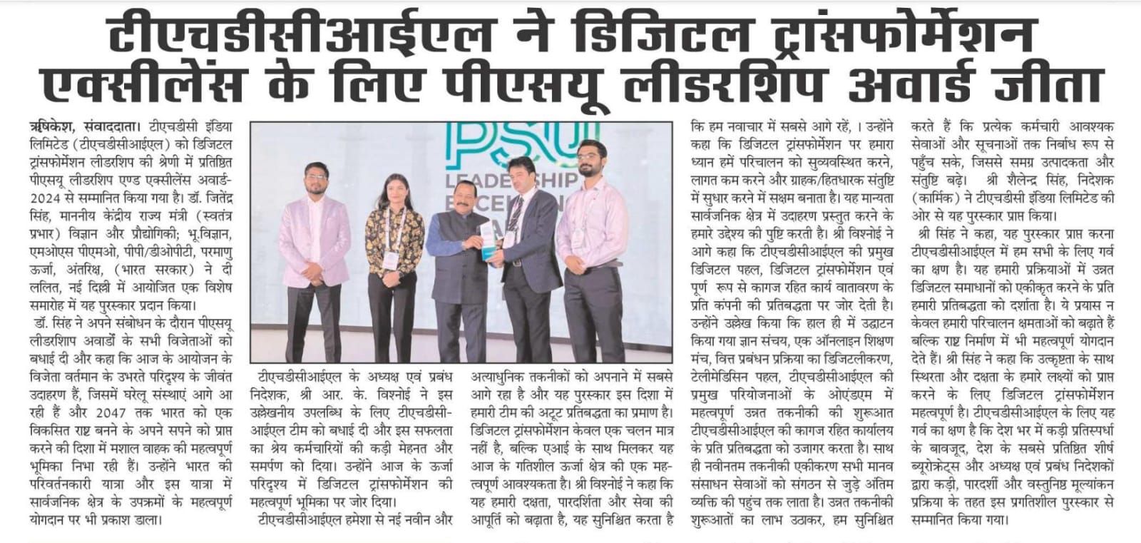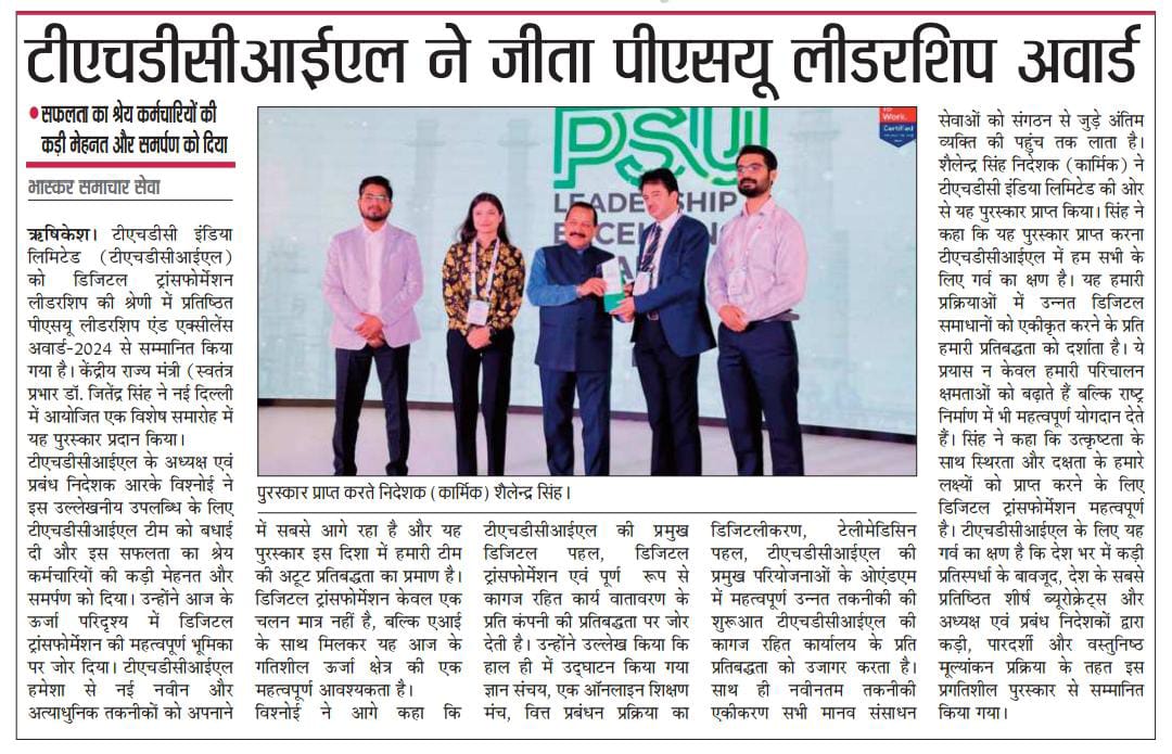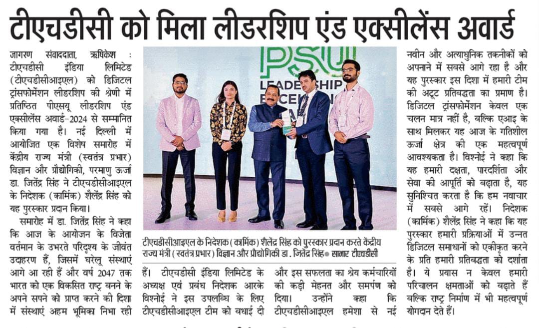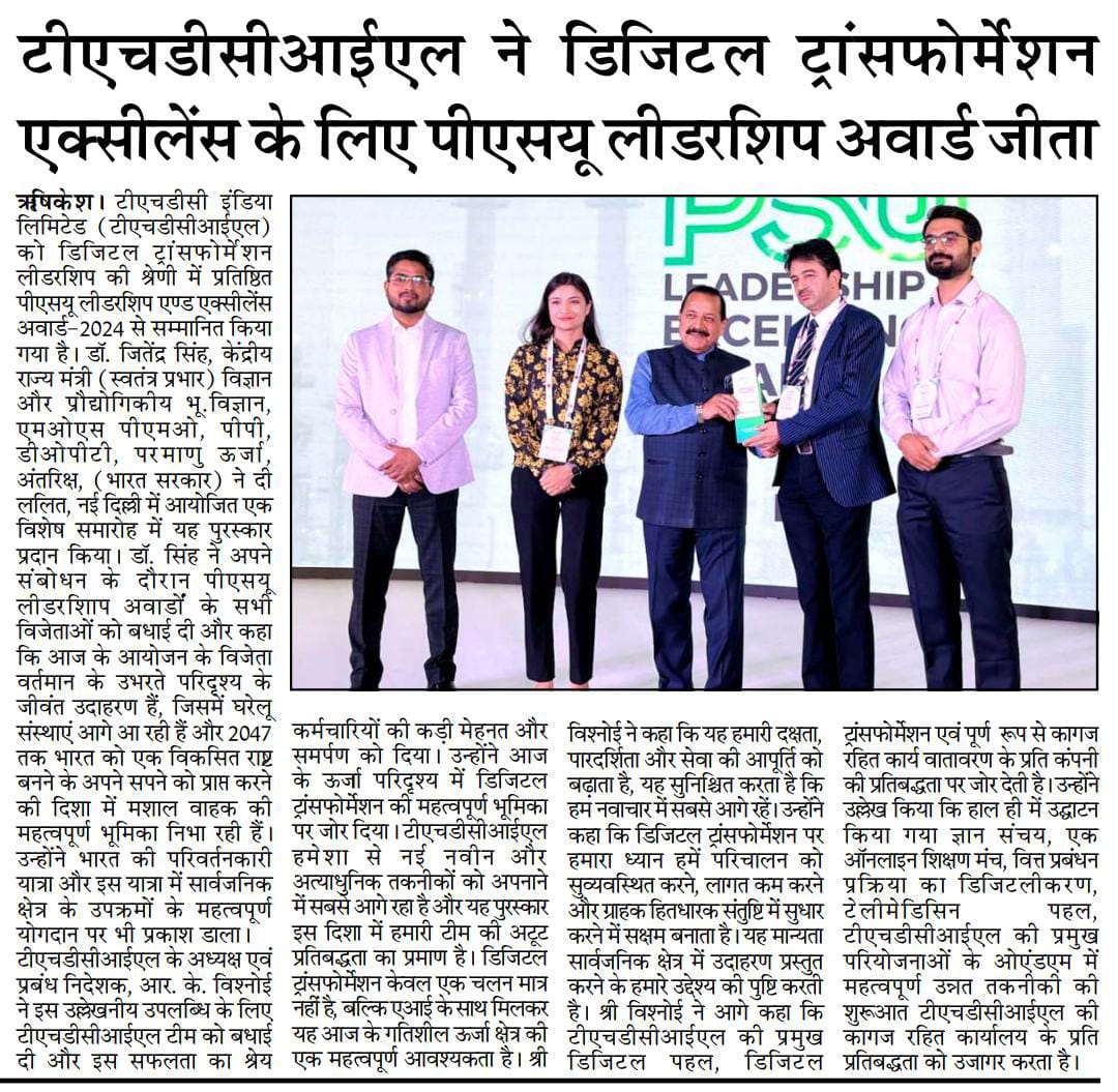 ऋषिकेश, 22 जून, 2024: टीएचडीसी इंडिया लिमिटेड (टीएचडीसीआईएल) को डिजिटल ट्रांसफोर्मेशन लीडरशिप की श्रेणी में प्रतिष्ठित पीएसयू लीडरशिप एण्ड एक्सीलेंस अवार्ड-2024 से सम्मानित किया गया है। डॉ. जितेंद्र सिंह, माननीय केंद्रीय राज्य मंत्री (स्वतंत्र प्रभार) विज्ञान और प्रौद्योगिकी; भू.विज्ञान, एमओएस पीएमओ, पीपी/डीओपीटी, परमाणु ऊर्जा, अंतरिक्ष, (भारत सरकार) ने दी ललित, नई दिल्ली में आयोजित एक विशेष समारोह में यह पुरस्कार प्रदान किया। डॉ. सिंह ने अपने संबोधन के दौरान पीएसयू लीडरशिाप अवार्डों के सभी विजेताओं को बधाई दी और कहा कि आज के आयोजन के विजेता वर्तमान के उभरते परिदृश्य के जीवंत उदाहरण हैं, जिसमें घरेलू संस्थाएं आगे आ रही हैं और 2047 तक भारत को एक विकसित राष्ट्र बनने के अपने सपने को प्राप्त करने की दिशा में मशाल वाहक की महत्वपूर्ण भूमिका निभा रही हैं। उन्होंने भारत की परिवर्तनकारी यात्रा और इस यात्रा में सार्वजनिक क्षेत्र के उपक्रमों के महत्वपूर्ण योगदान पर भी प्रकाश डाला।