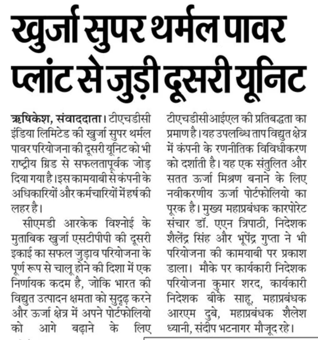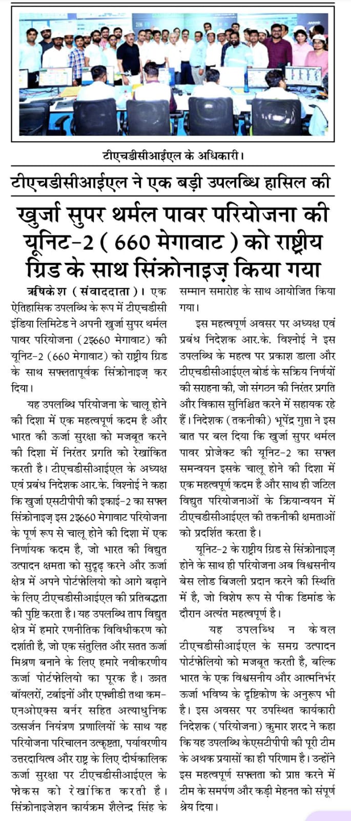 इस महत्वपूर्ण अवसर पर अध्यक्ष एवं प्रबंध निदेशक श्री आर.के. विश्नोई ने इस उपलब्धि के महत्व पर प्रकाश डाला और टीएचडीसीआईएल बोर्ड के सक्रिय निर्णयों की सराहना की, जो संगठन की निरंतर प्रगति और विकास सुनिश्चित करने में सहायक रहे हैं। निदेशक (तकनीकी) श्री भूपेंद्र गुप्ता ने इस बात पर बल दिया कि खुर्जा सुपर थर्मल पावर प्रोजेक्ट की यूनिट-2 का सफल समन्वयन इसके चालू होने की दिशा में एक महत्वपूर्ण कदम है और साथ ही जटिल विद्युत परियोजनाओं के क्रियान्वयन में टीएचडीसीआईएल की तकनीकी क्षमताओं को प्रदर्शित करता है। यूनिट-2 के राष्ट्रीय ग्रिड से सिंक्रोनाइज़ होने के साथ ही परियोजना अब विश्वसनीय बेस लोड बिजली प्रदान करने की स्थिति में है, जो विशेष रूप से पीक डिमांड के दौरान अत्यंत महत्वपूर्ण है। यह उपलब्धि न केवल टीएचडीसीआईएल के समग्र उत्पादन पोर्टफोलियो को मजबूत करती है, बल्कि भारत के एक विश्वसनीय और आत्मनिर्भर ऊर्जा भविष्य के दृष्टिकोण के अनुरूप भी है।