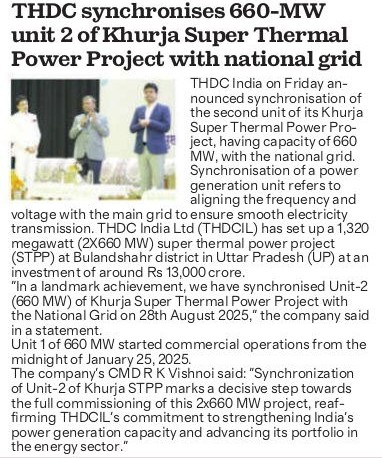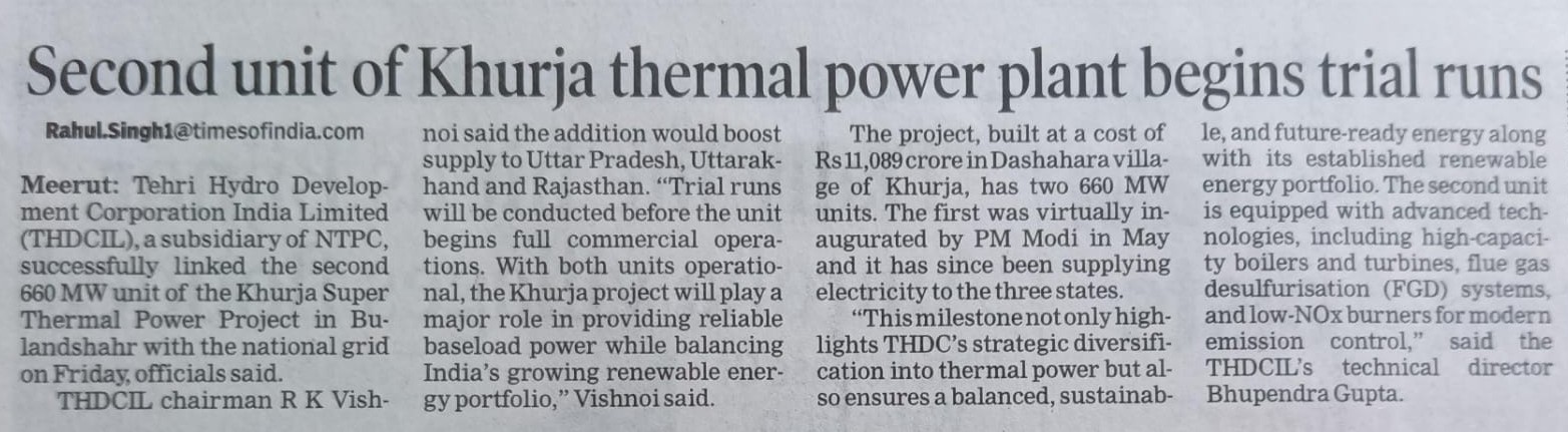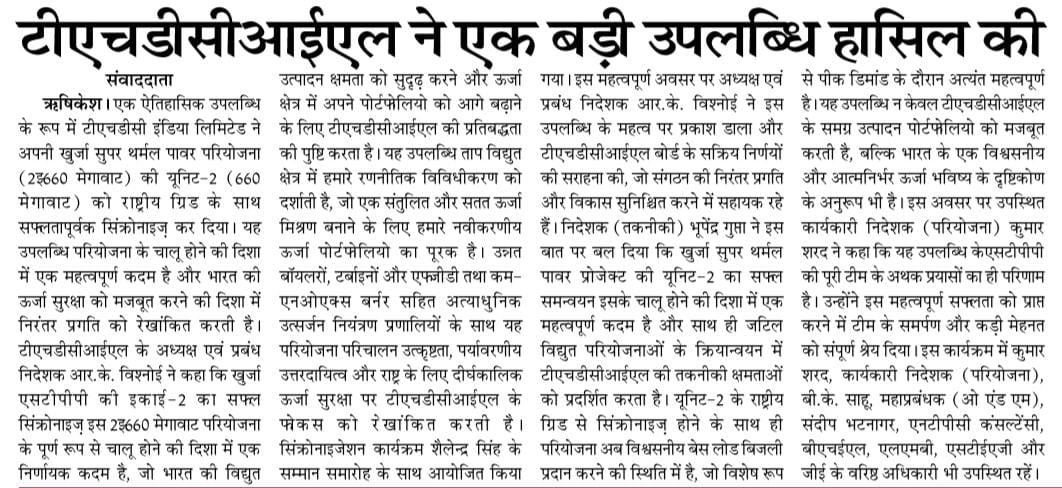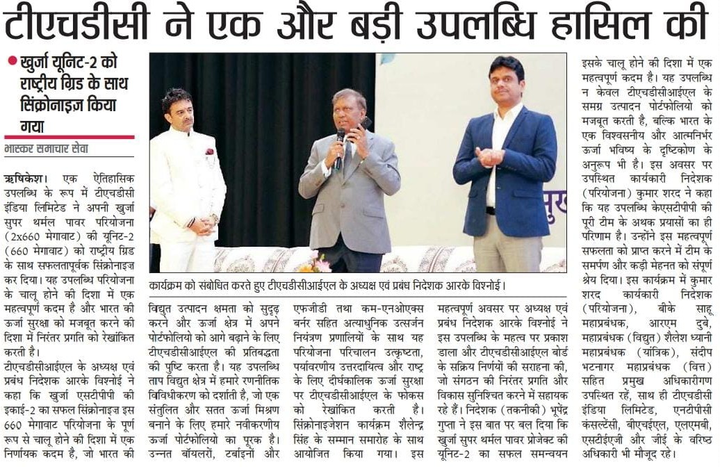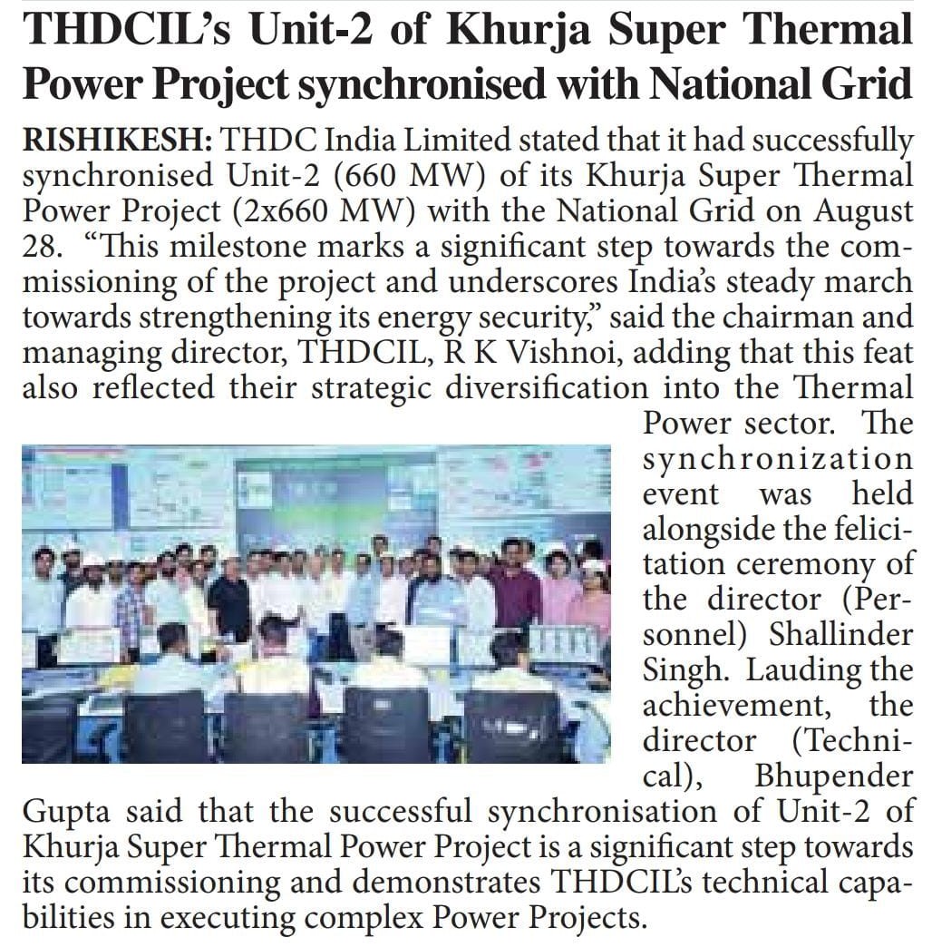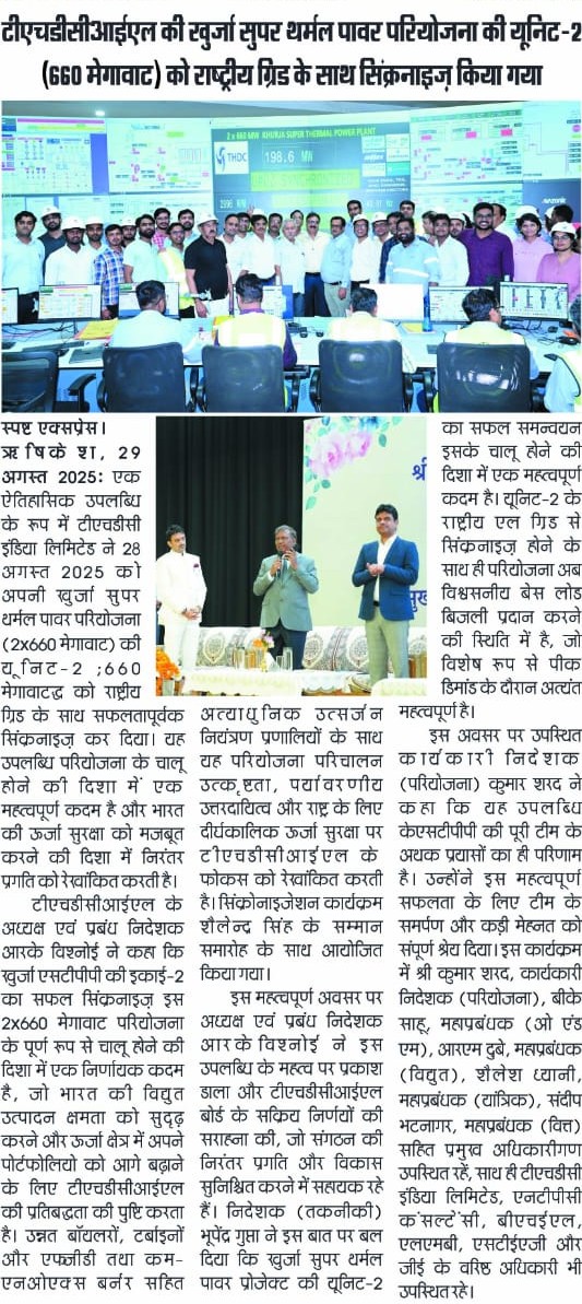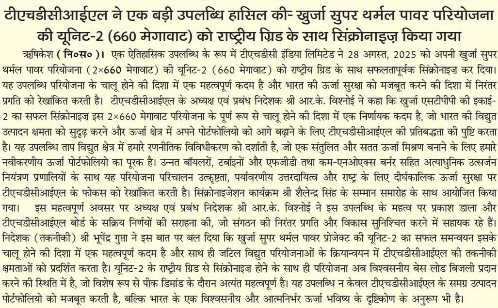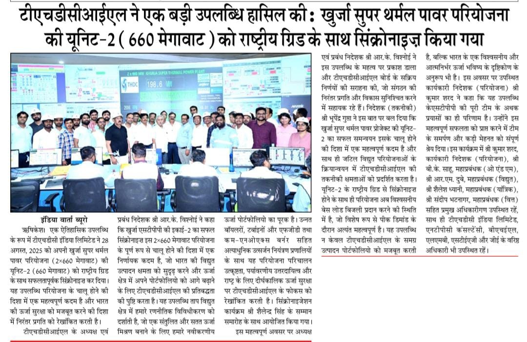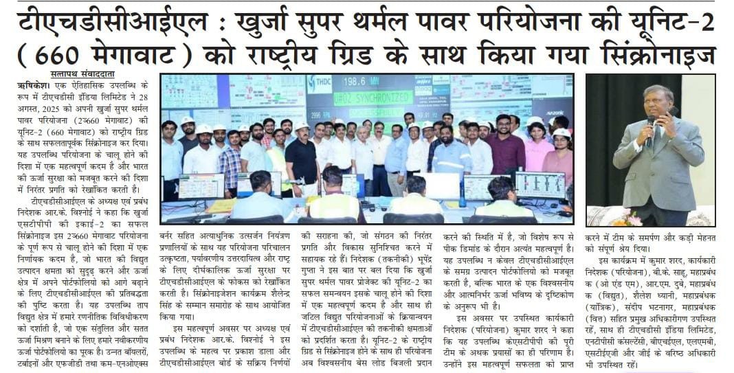 ऋषिकेश, 29 अगस्त, 2025: एक ऐतिहासिक उपलब्धि के रूप में टीएचडीसी इंडिया लिमिटेड ने 28 अगस्त, 2025 को अपनी खुर्जा सुपर थर्मल पावर परियोजना (2x660 मेगावाट) की यूनिट-2 (660 मेगावाट) को राष्ट्रीय ग्रिड के साथ सफलतापूर्वक सिंक्रोनाइज़ कर दिया। यह उपलब्धि परियोजना के चालू होने की दिशा में एक महत्वपूर्ण कदम है और भारत की ऊर्जा सुरक्षा को मजबूत करने की दिशा में निरंतर प्रगति को रेखांकित करती है।