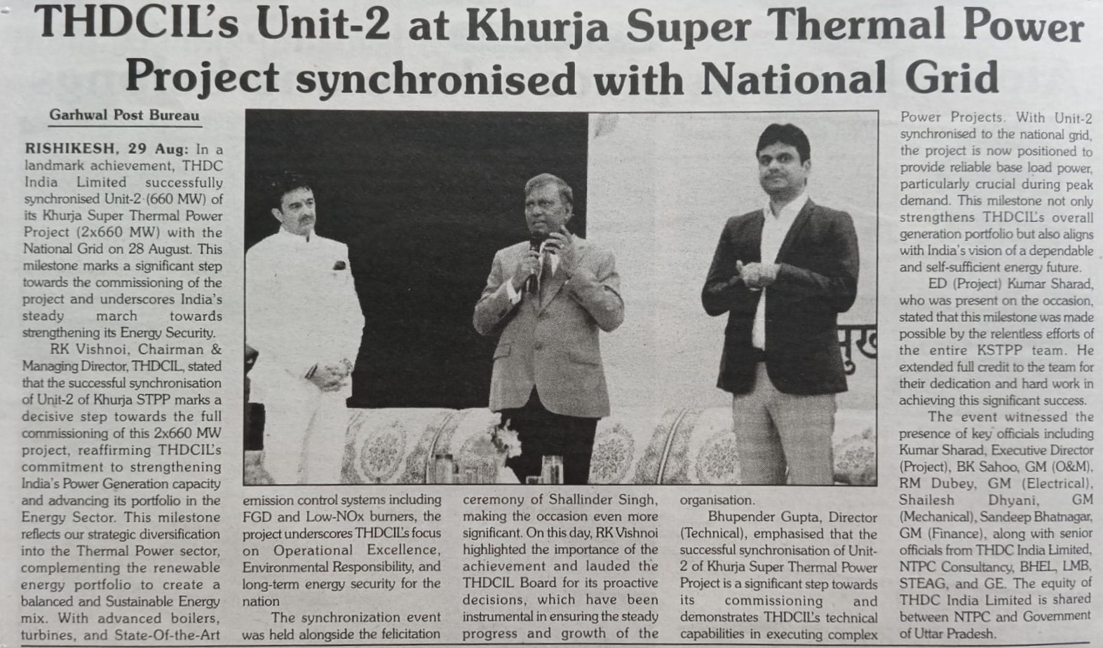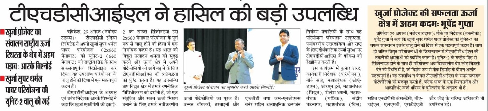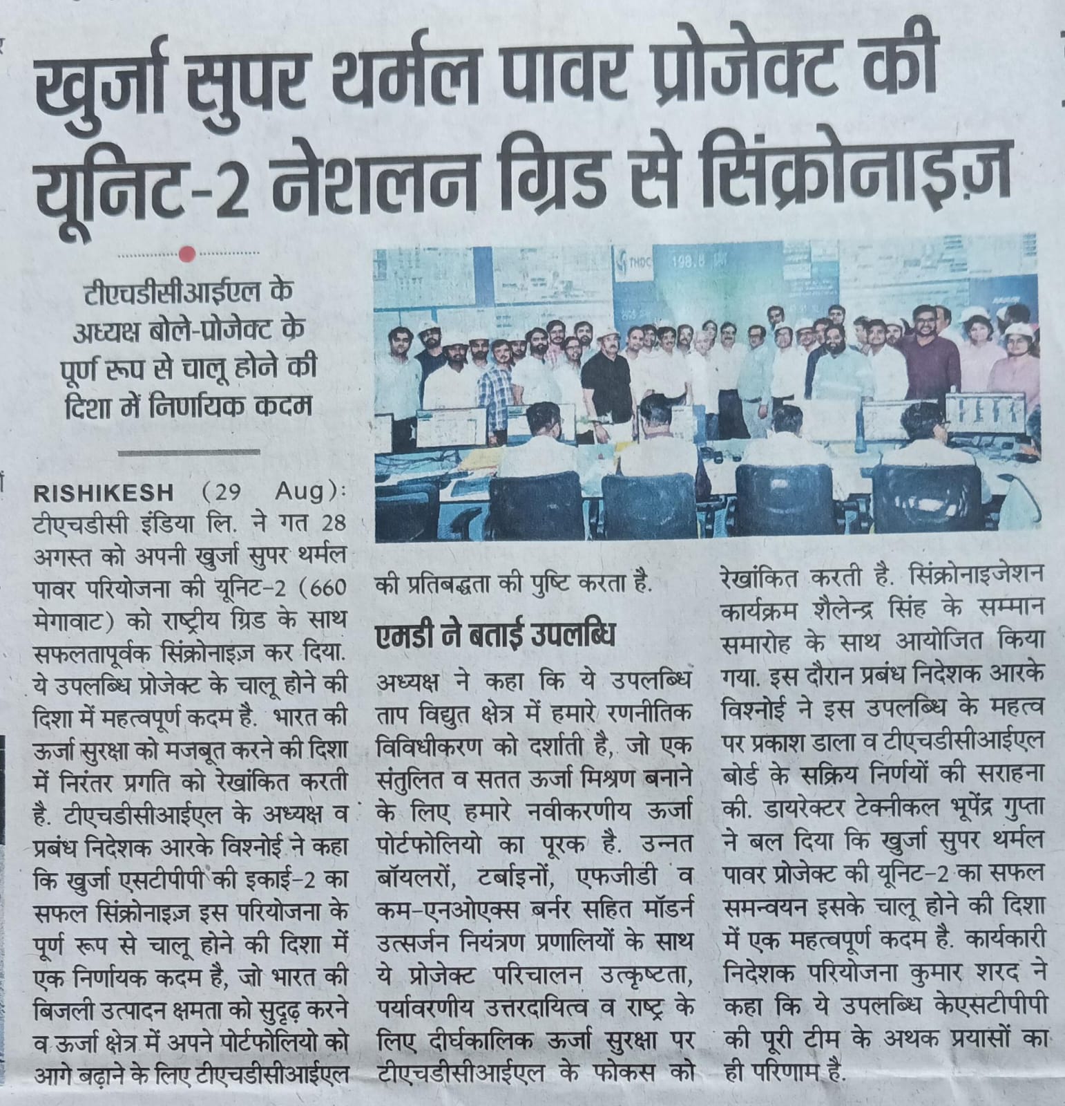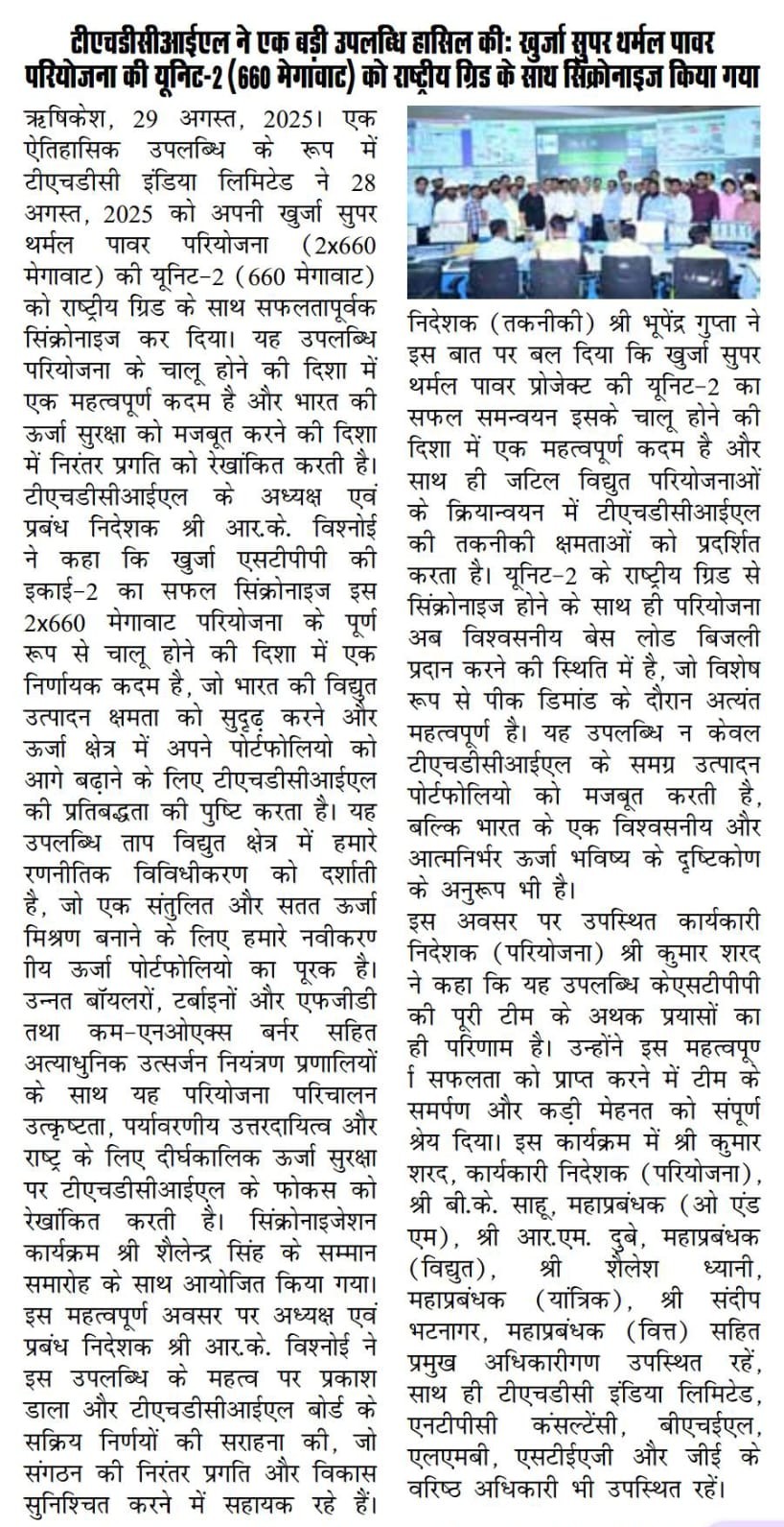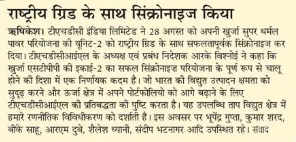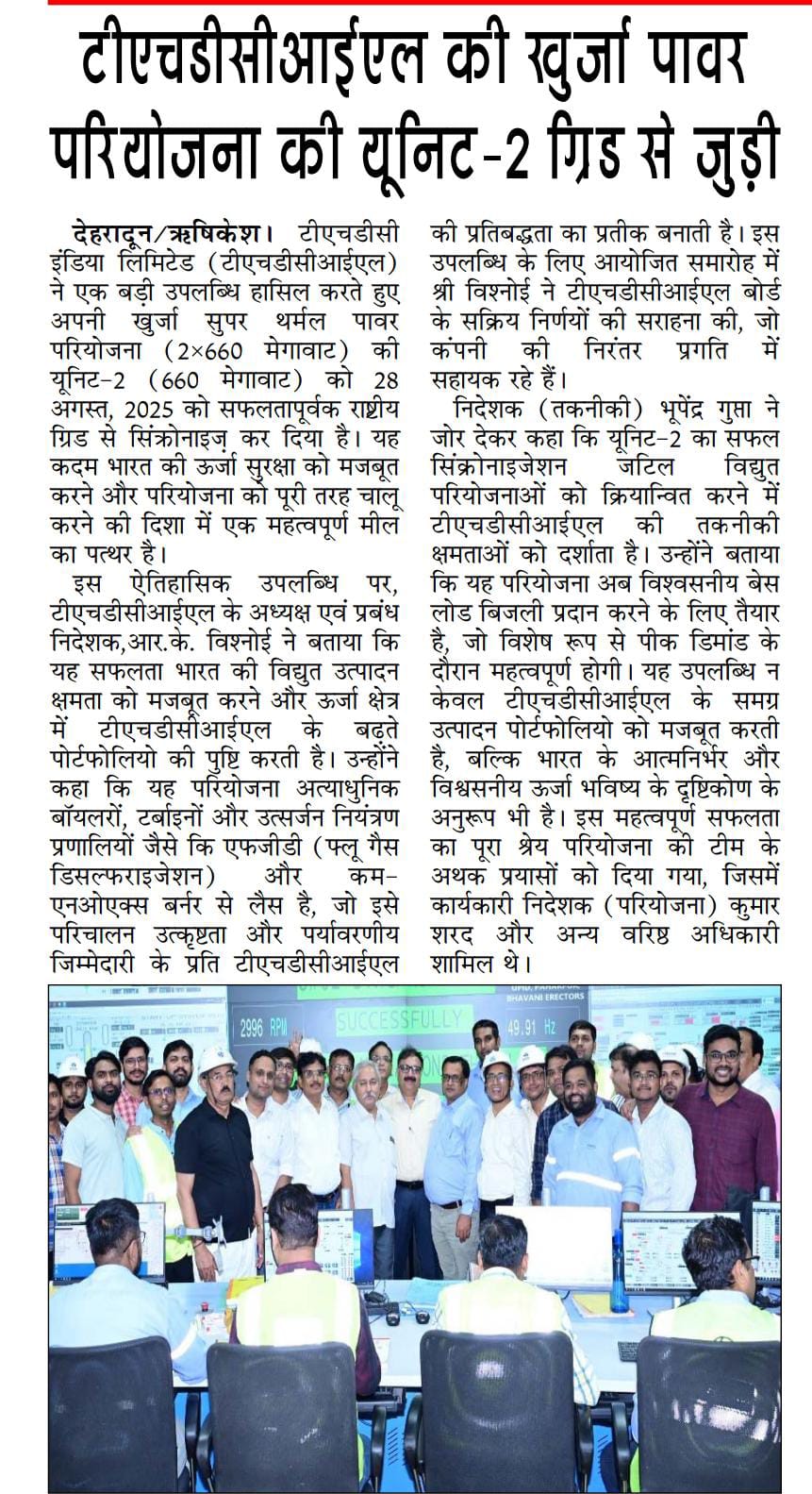ऋषिकेश, 29 अगस्त, 2025: एक ऐतिहासिक उपलब्धि के रूप में टीएचडीसी इंडिया लिमिटेड ने 28 अगस्त, 2025 को अपनी खुर्जा सुपर थर्मल पावर परियोजना (2x660 मेगावाट) की यूनिट-2 (660 मेगावाट) को राष्ट्रीय ग्रिड के साथ सफलतापूर्वक सिंक्रोनाइज़ कर दिया। यह उपलब्धि परियोजना के चालू होने की दिशा में एक महत्वपूर्ण कदम है और भारत की ऊर्जा सुरक्षा को मजबूत करने की दिशा में निरंतर प्रगति को रेखांकित करती है।